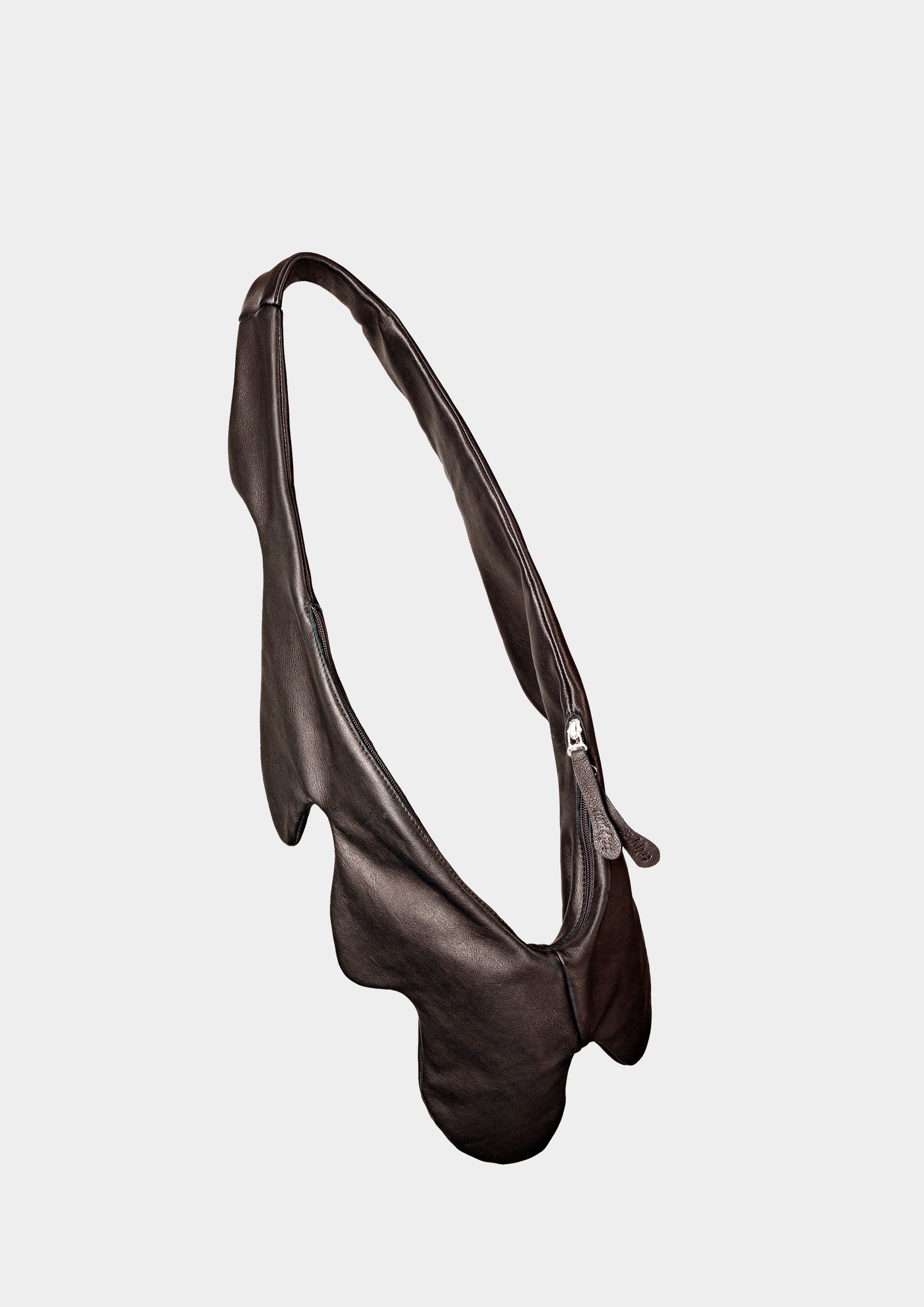 Marsupio in pelle dal design irregolare, caratterizzato da linee asimmetriche e contemporanee. Dotato di cerniera pratica e dettagli essenziali, unisce funzionalità e stile urbano, perfetto per un look moderno e versatile.