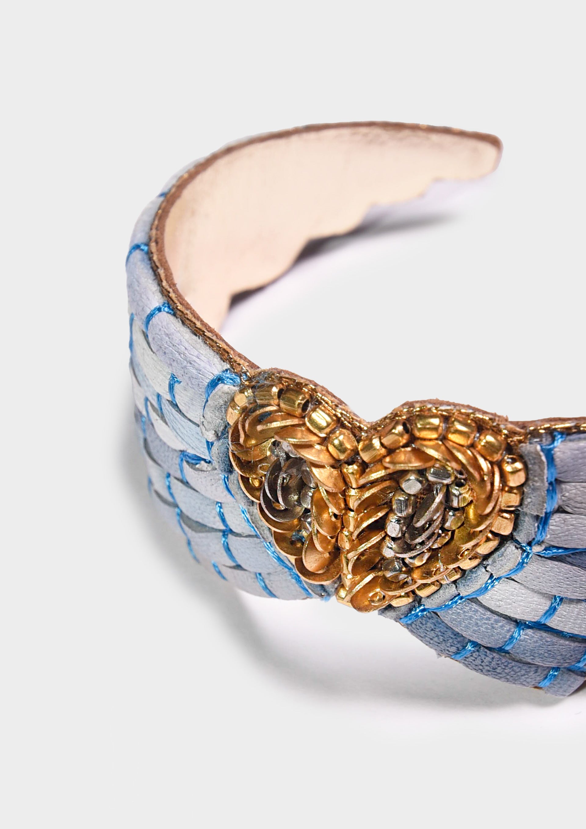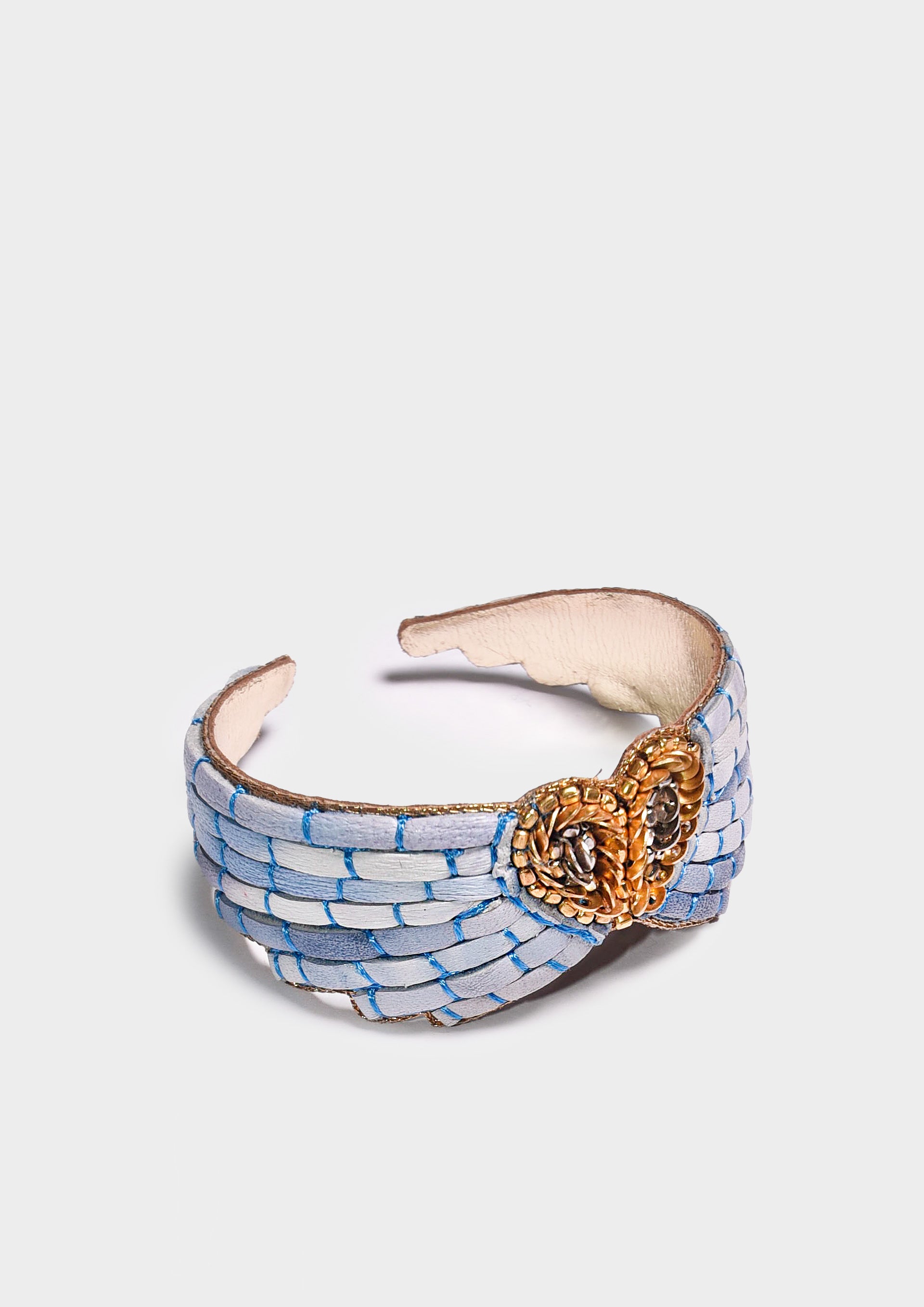 Bracciali a forma di ali d’angelo, realizzati artigianalmente con sottili strisce di pelle e filo di seta, decorati con perline in acciaio inossidabile. Rifiniti con fodera in pelle e dotati di chiusura regolabile a pressione, uniscono leggerezza, simbolismo e stile contemporaneo.