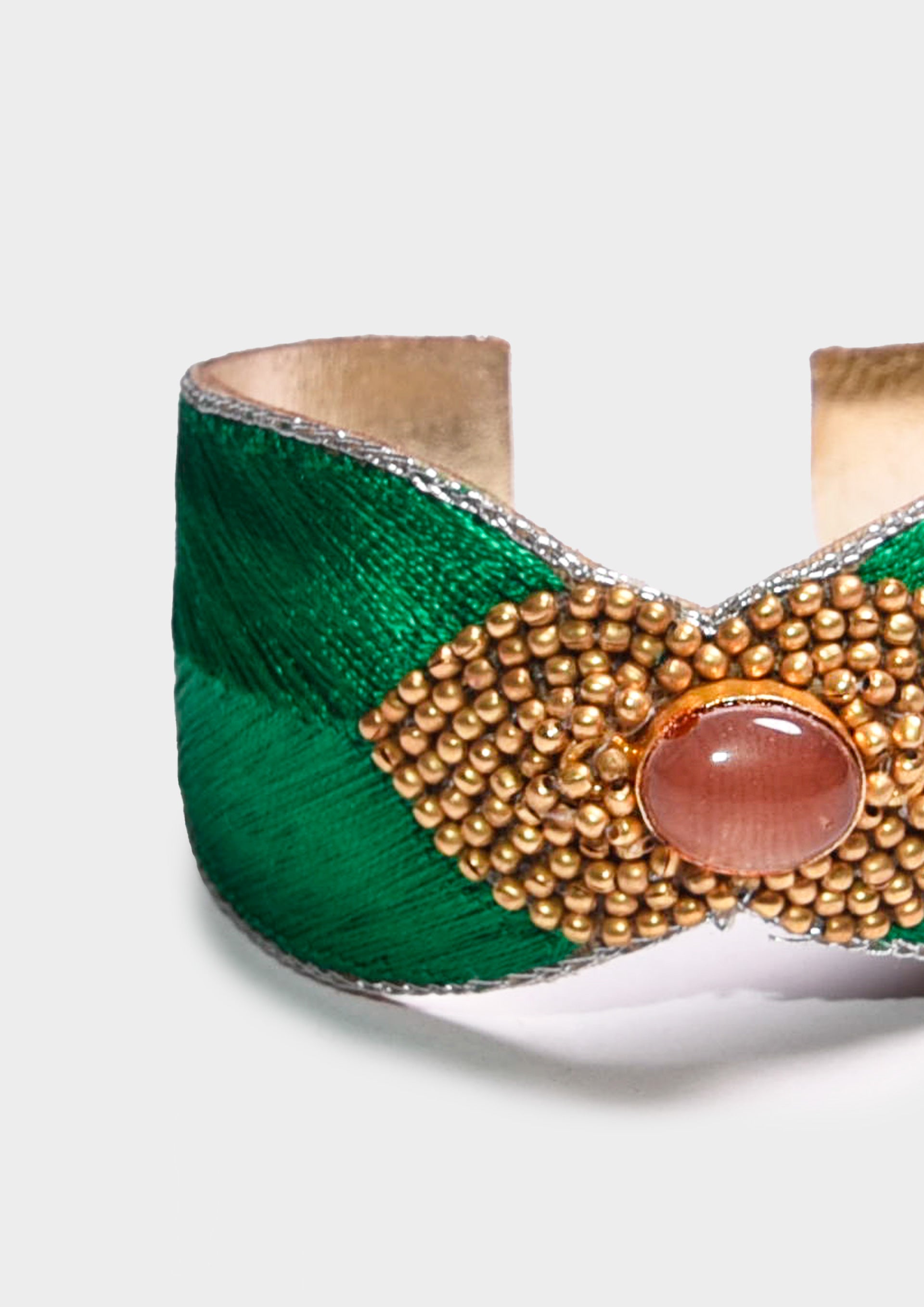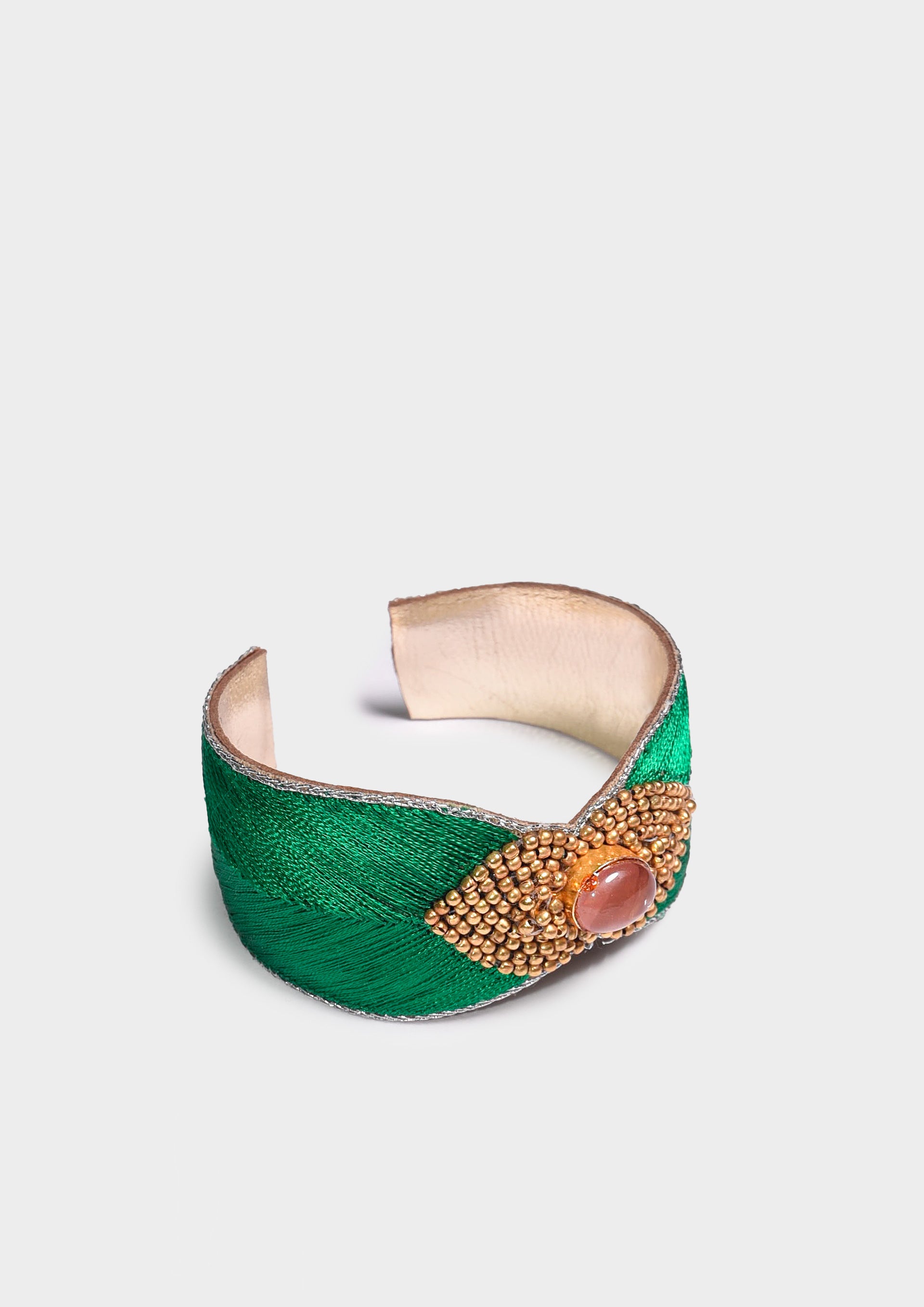 Braccialetto sottile realizzato a mano con raffinato ricamo in filo di seta, impreziosito da una pietra semipreziosa ovale e delicate perline in ottone. Dotato di fodera in pelle e chiusura regolabile a pressione, unisce artigianalità e comfort in un accessorio elegante e versatile.
