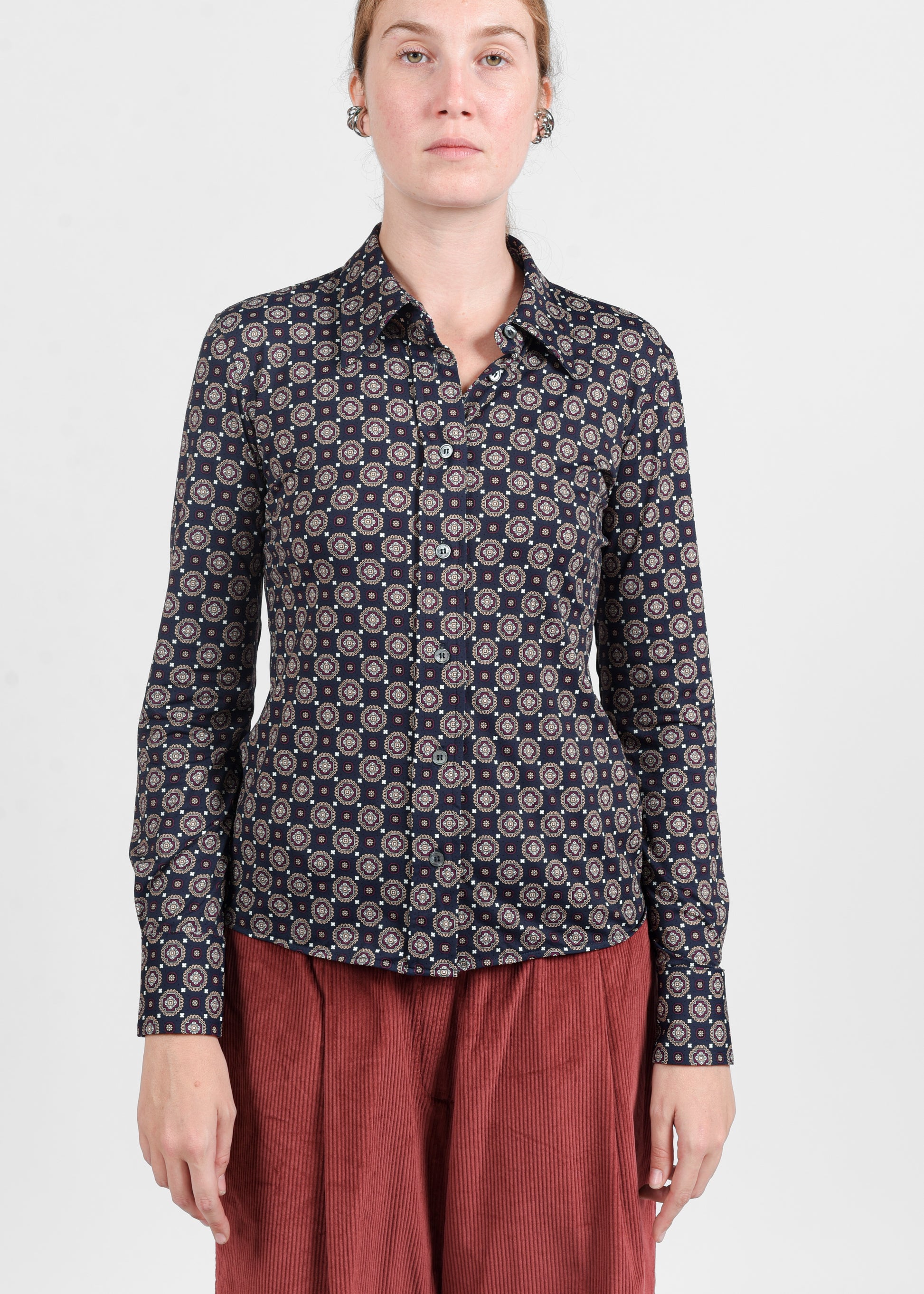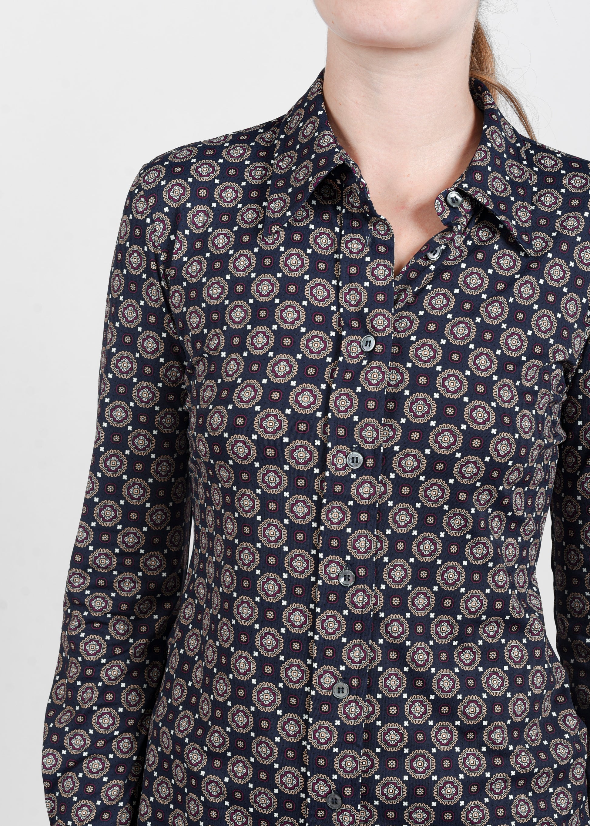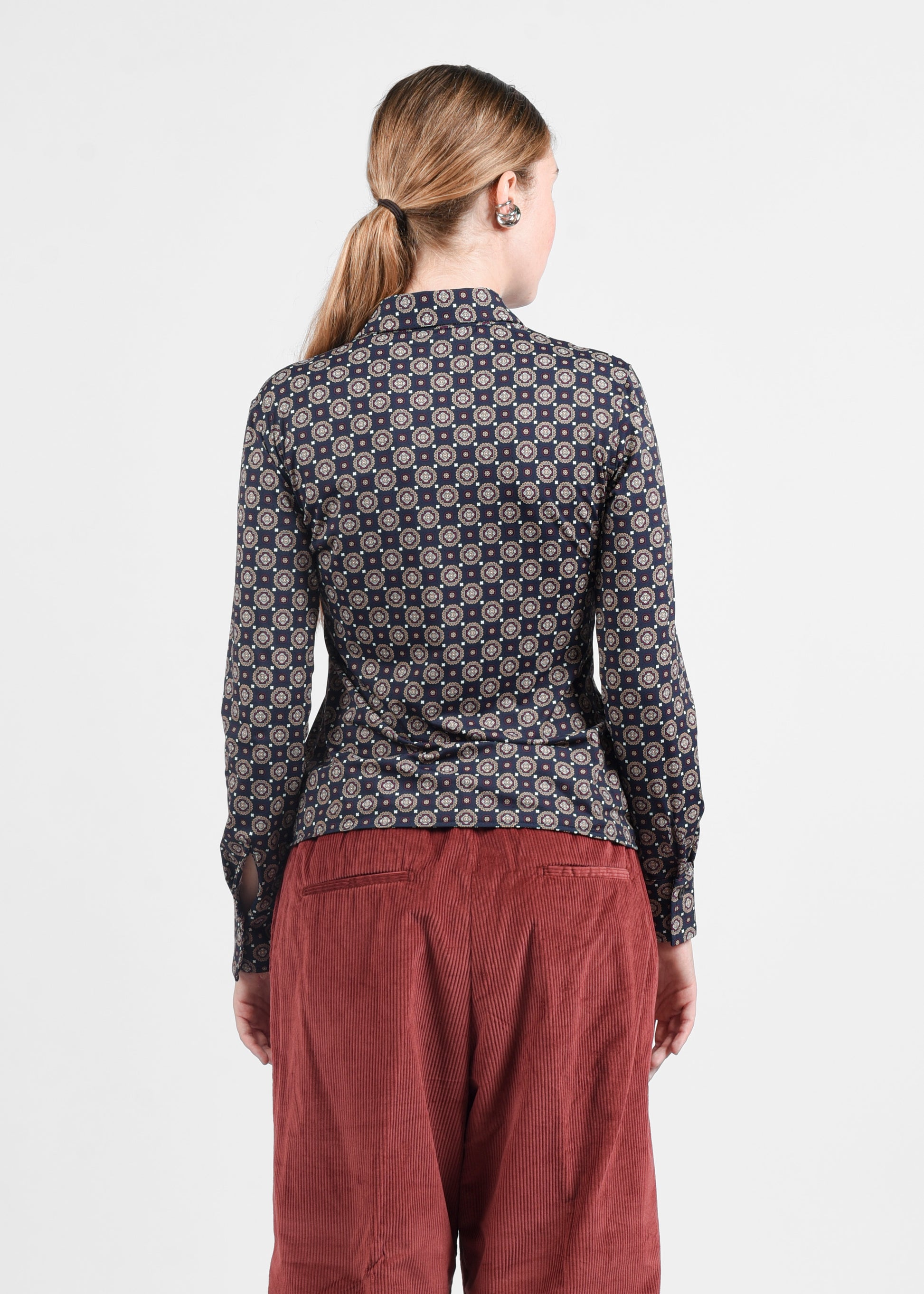 Camicia aderente con fantasia effetto cravatta, dalla lunghezza regolare e fit sciancrato che valorizza la silhouette. Realizzata in tessuto skin-like composto da 85% poliammide e 15% elastan, offre comfort, vestibilità elastica e un tocco sofisticato e contemporaneo.