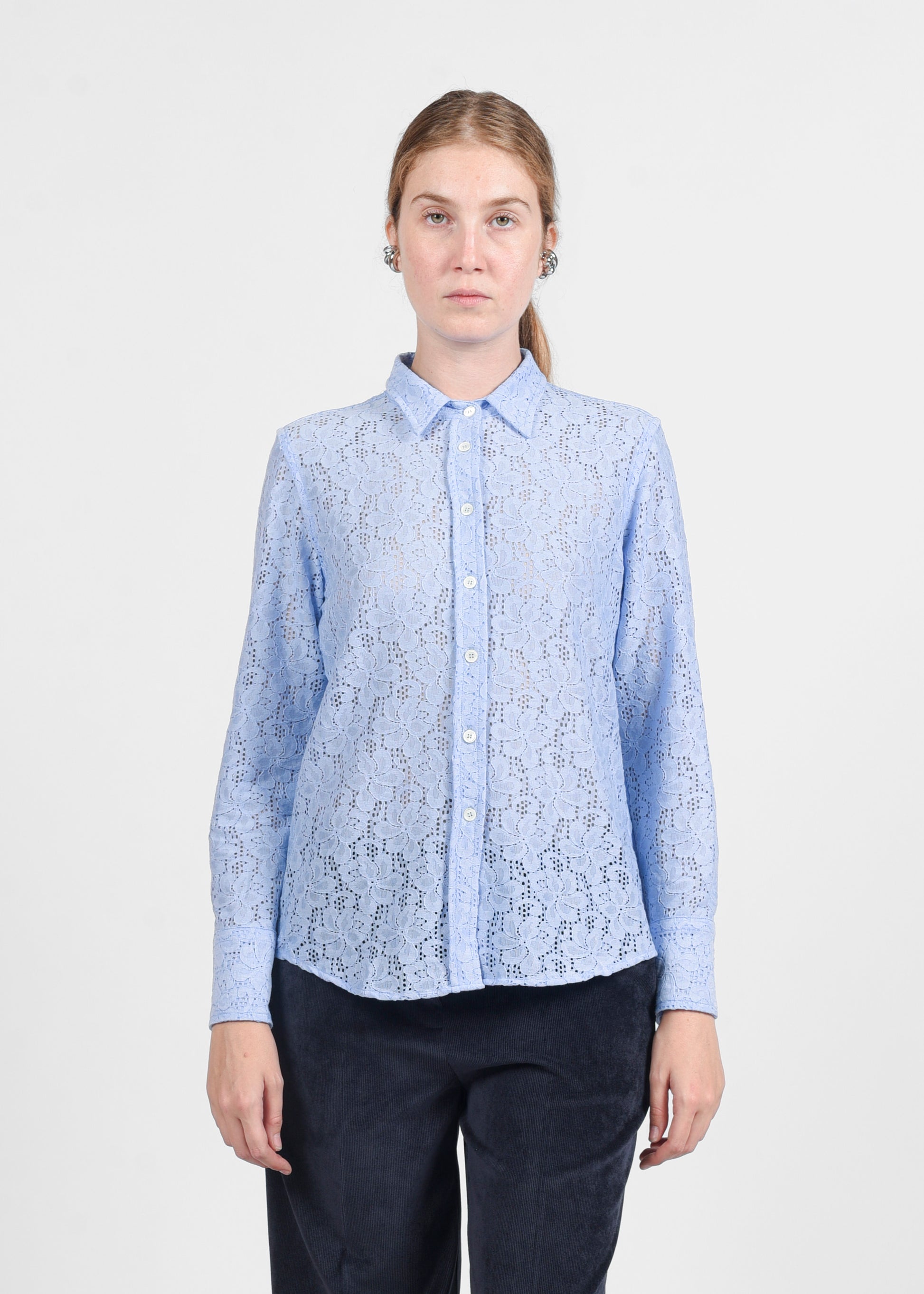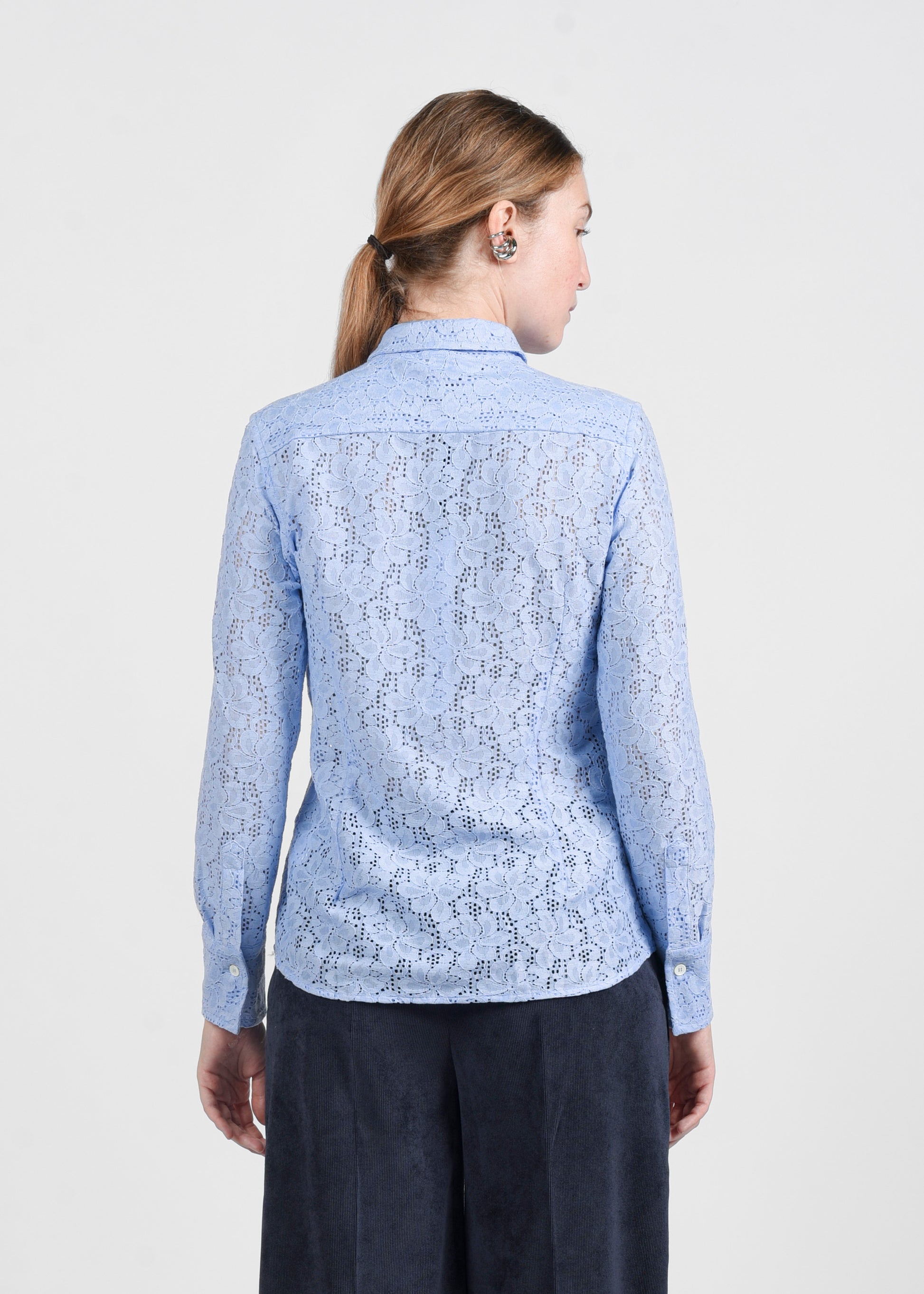 Camicia in pizzo a fiori, dalla lunghezza regolare e fit sciancrato, che valorizza la silhouette con eleganza. Realizzata in 100% cotone, combina comfort, traspirabilità e un tocco romantico e femminile.
