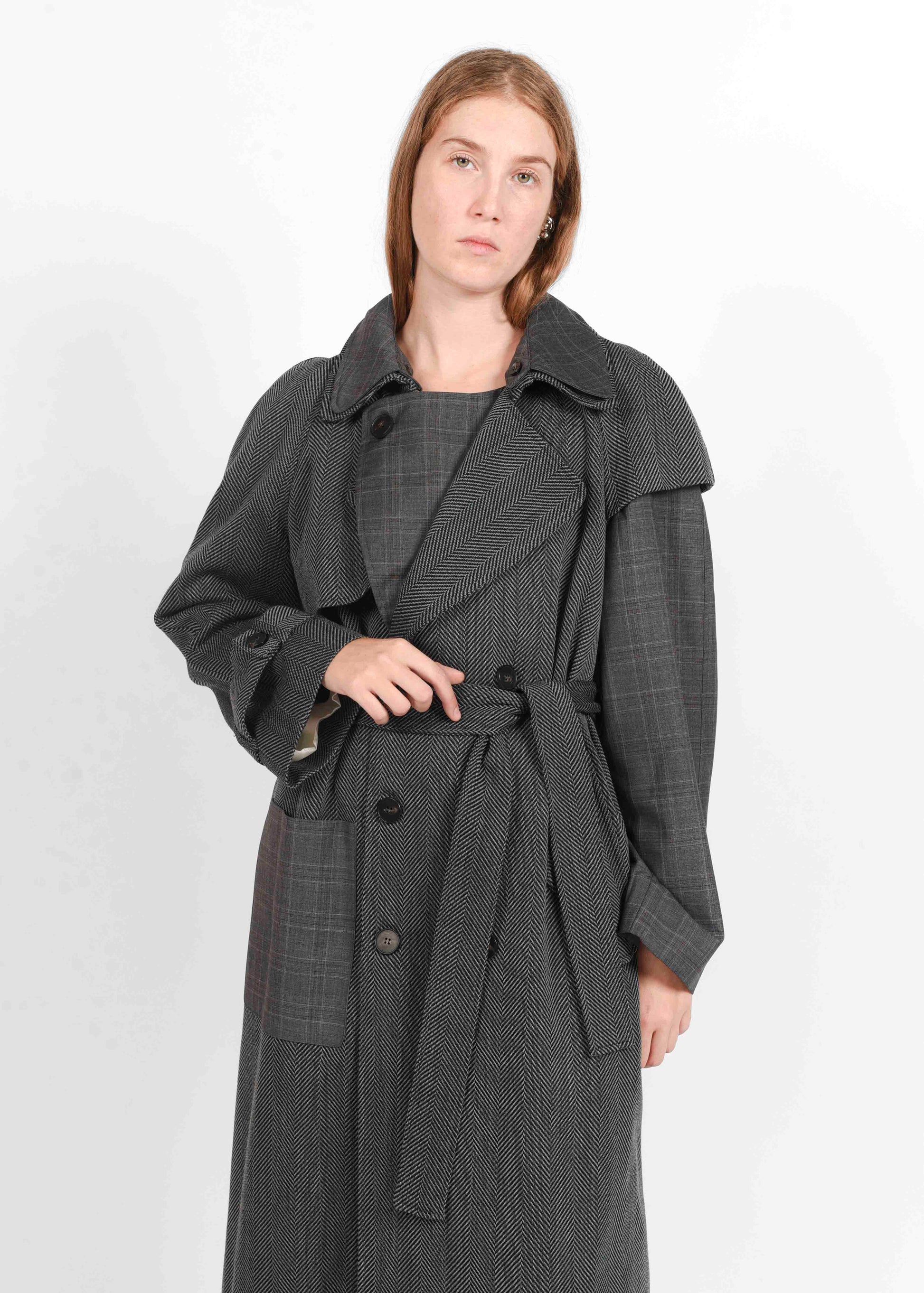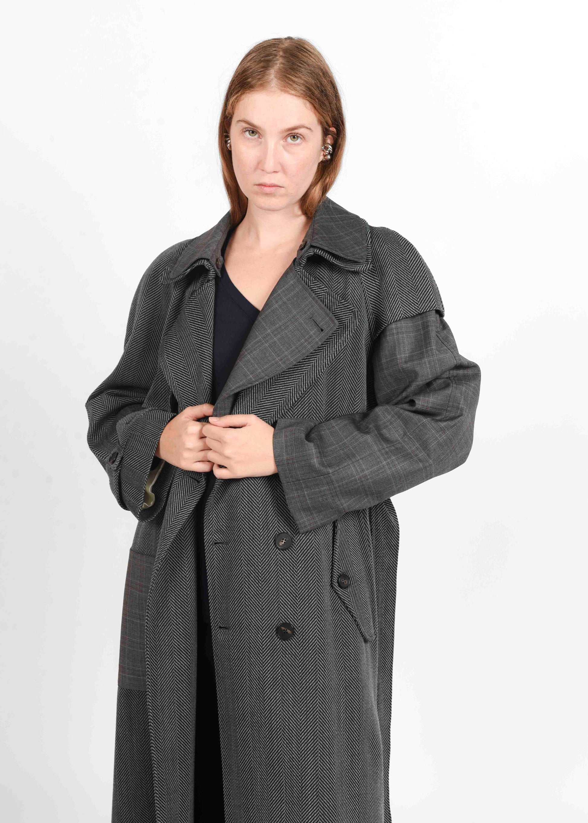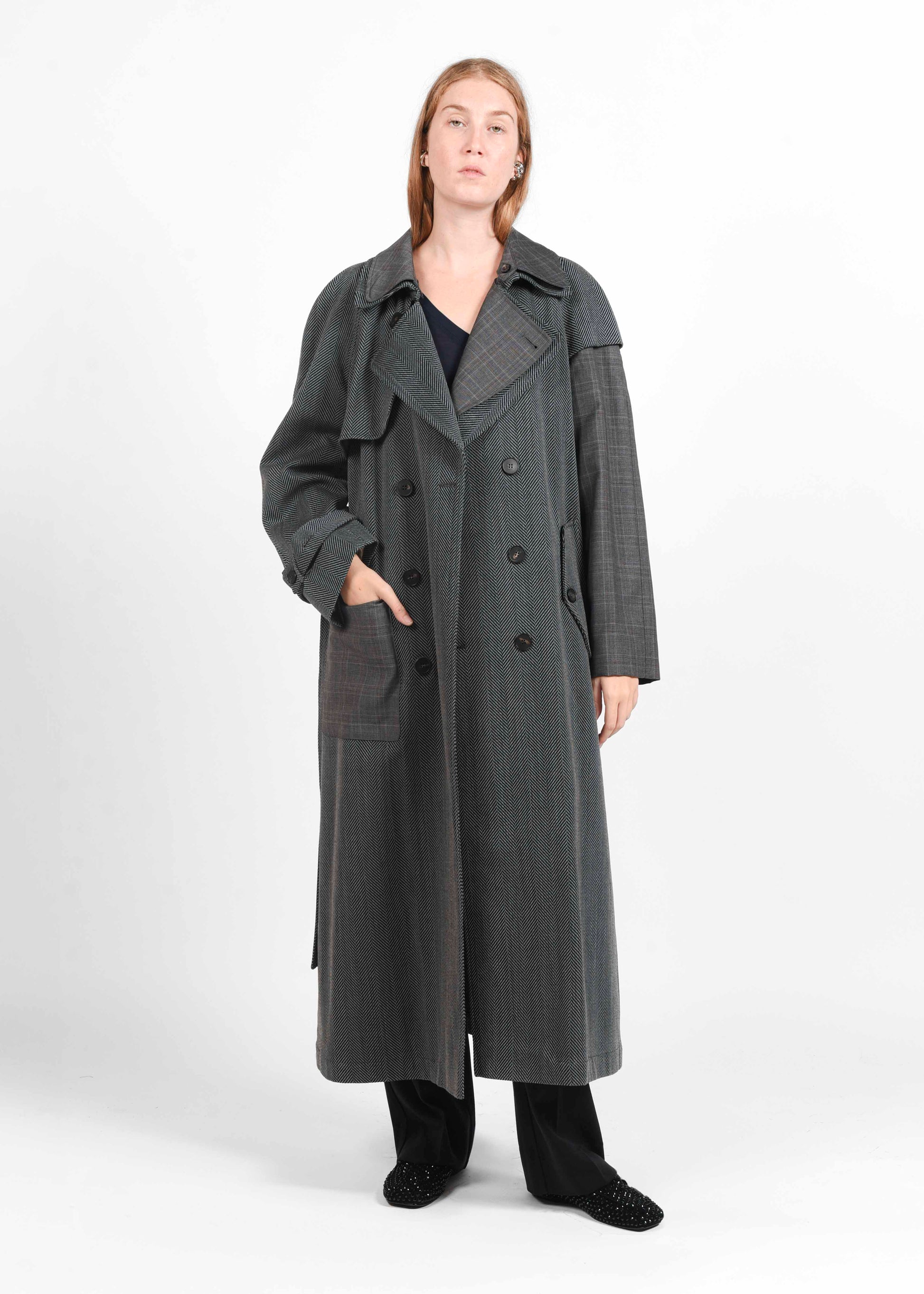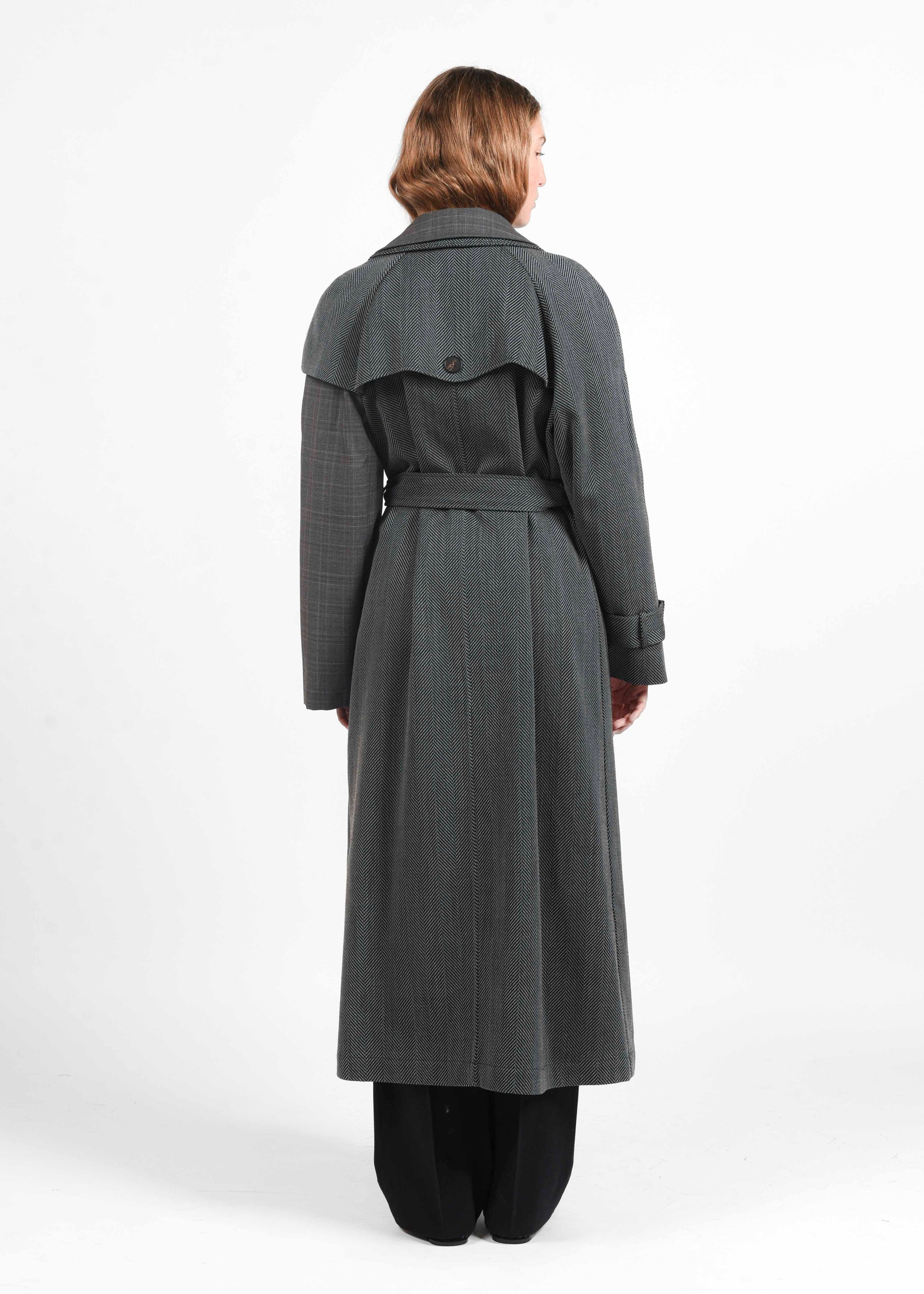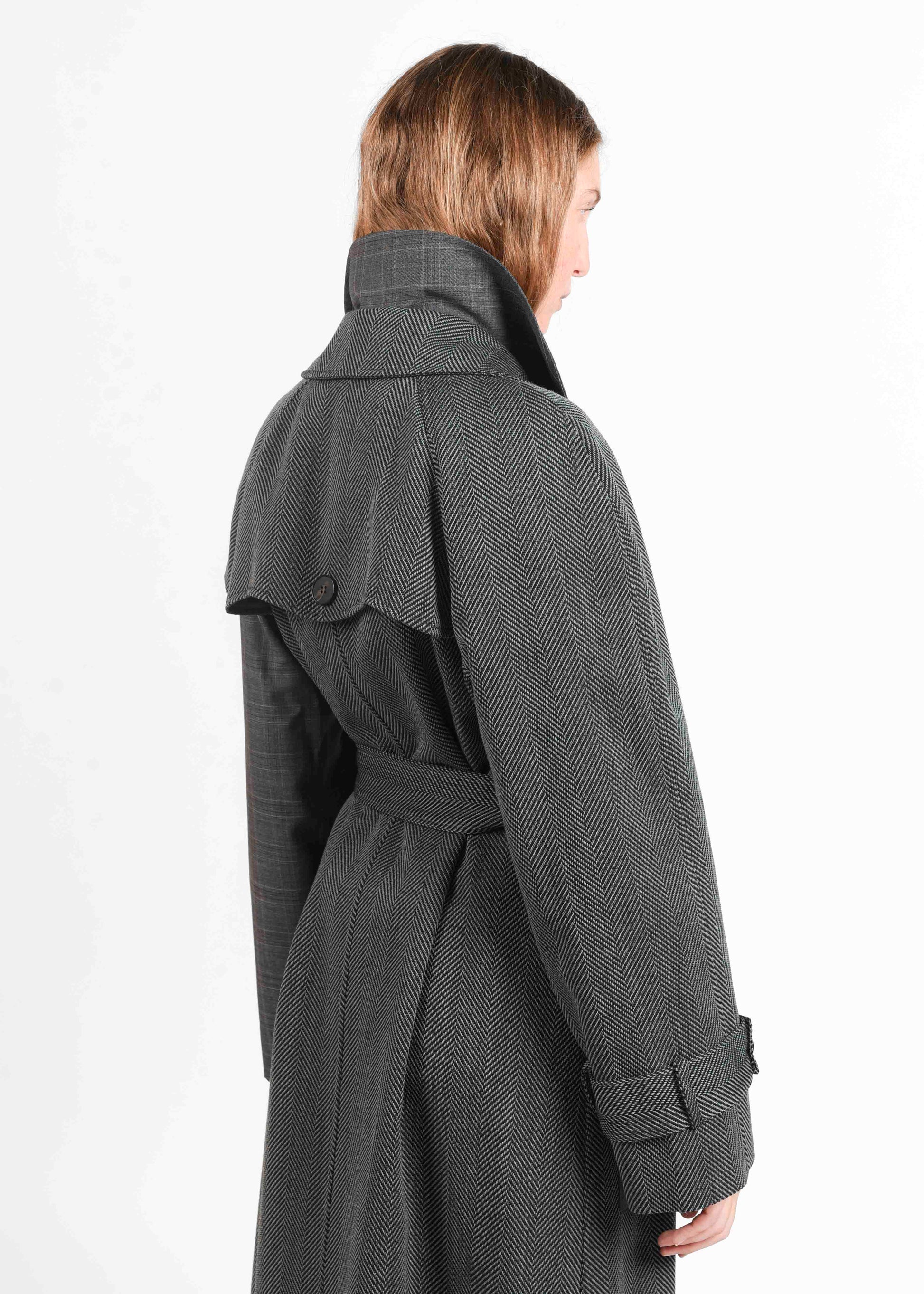 Cappotto trench bimateriale doppiopetto con cintura in vita e colletto removibile. Composizione: 55% lana vergine, 45% cotone.