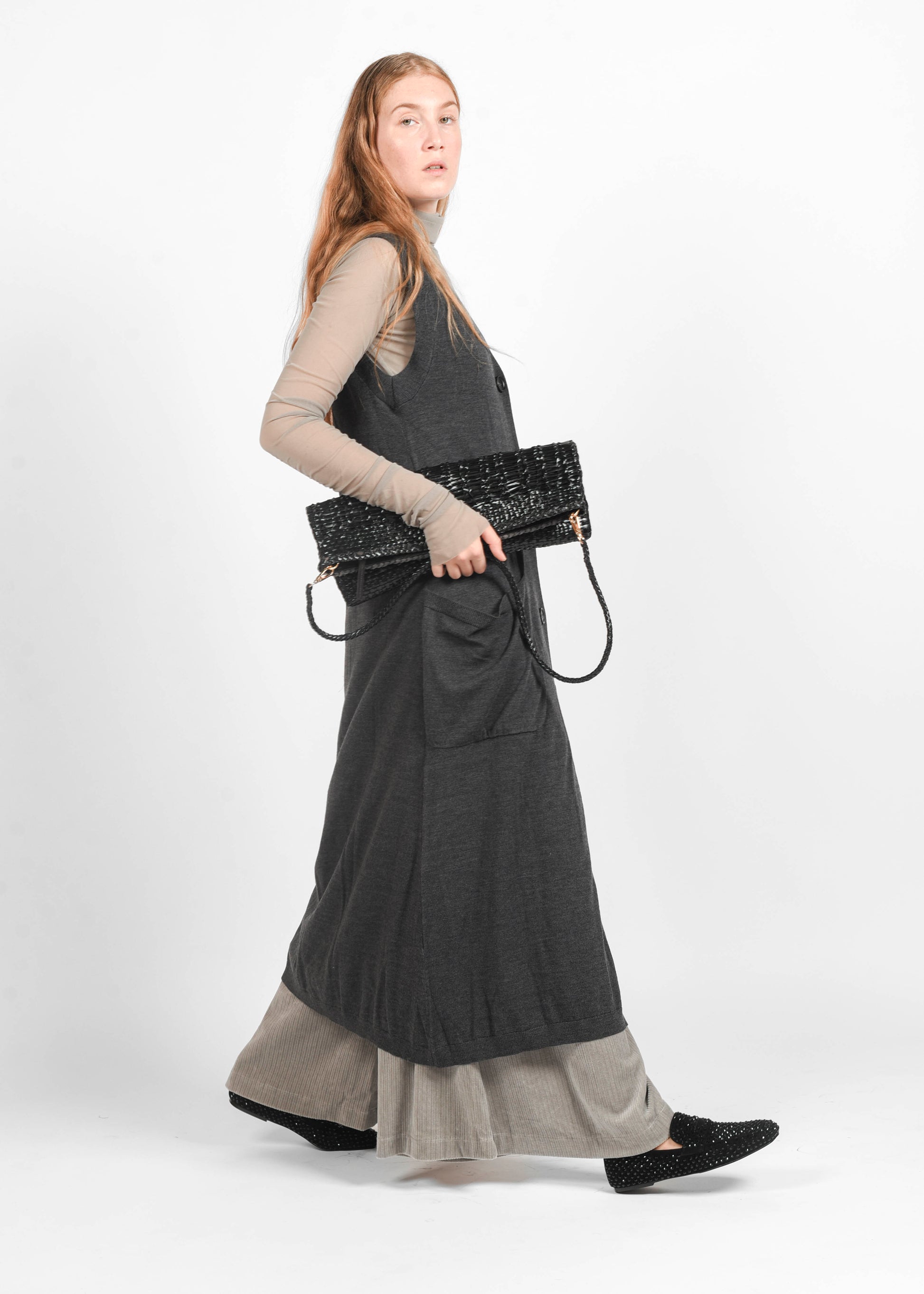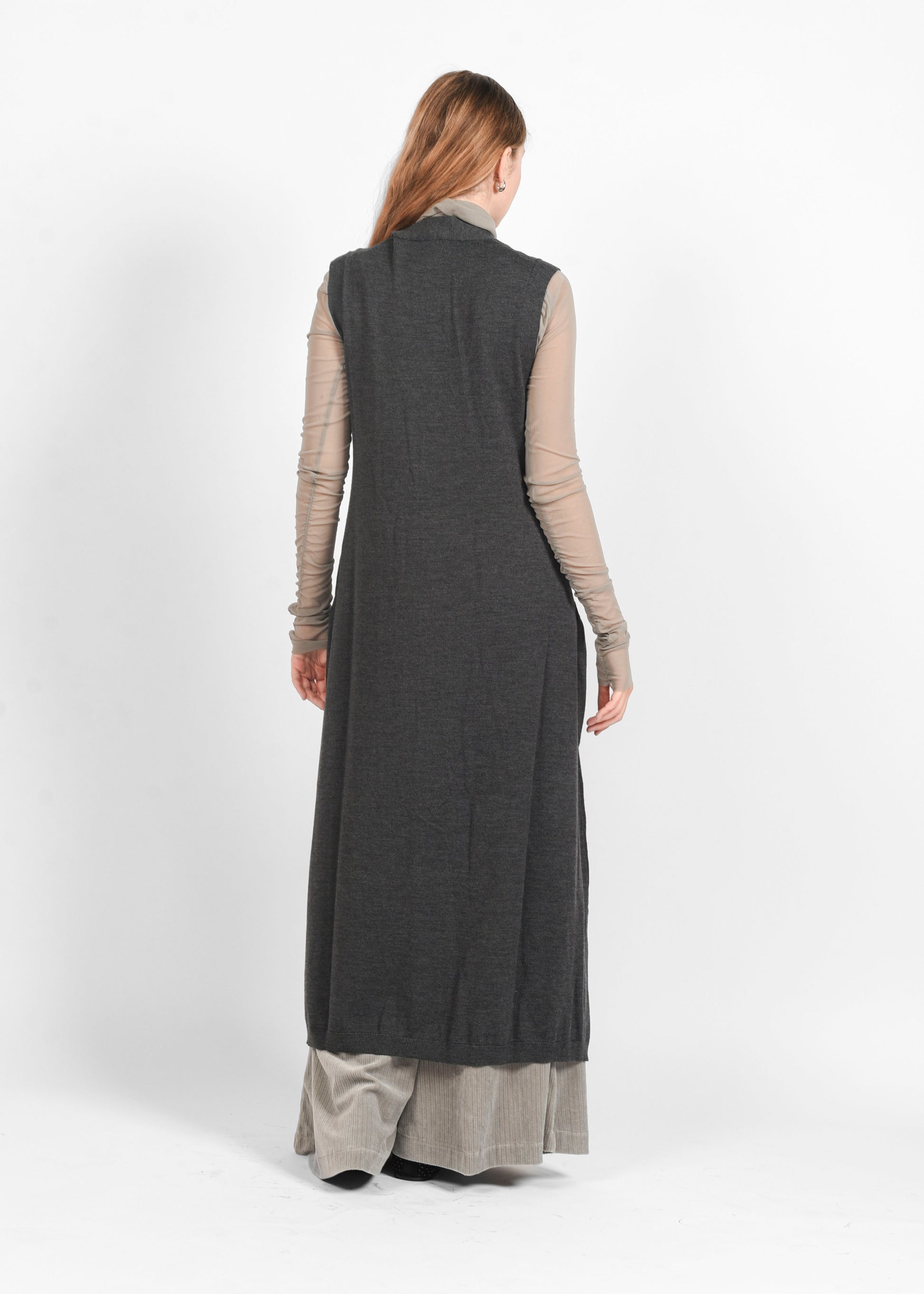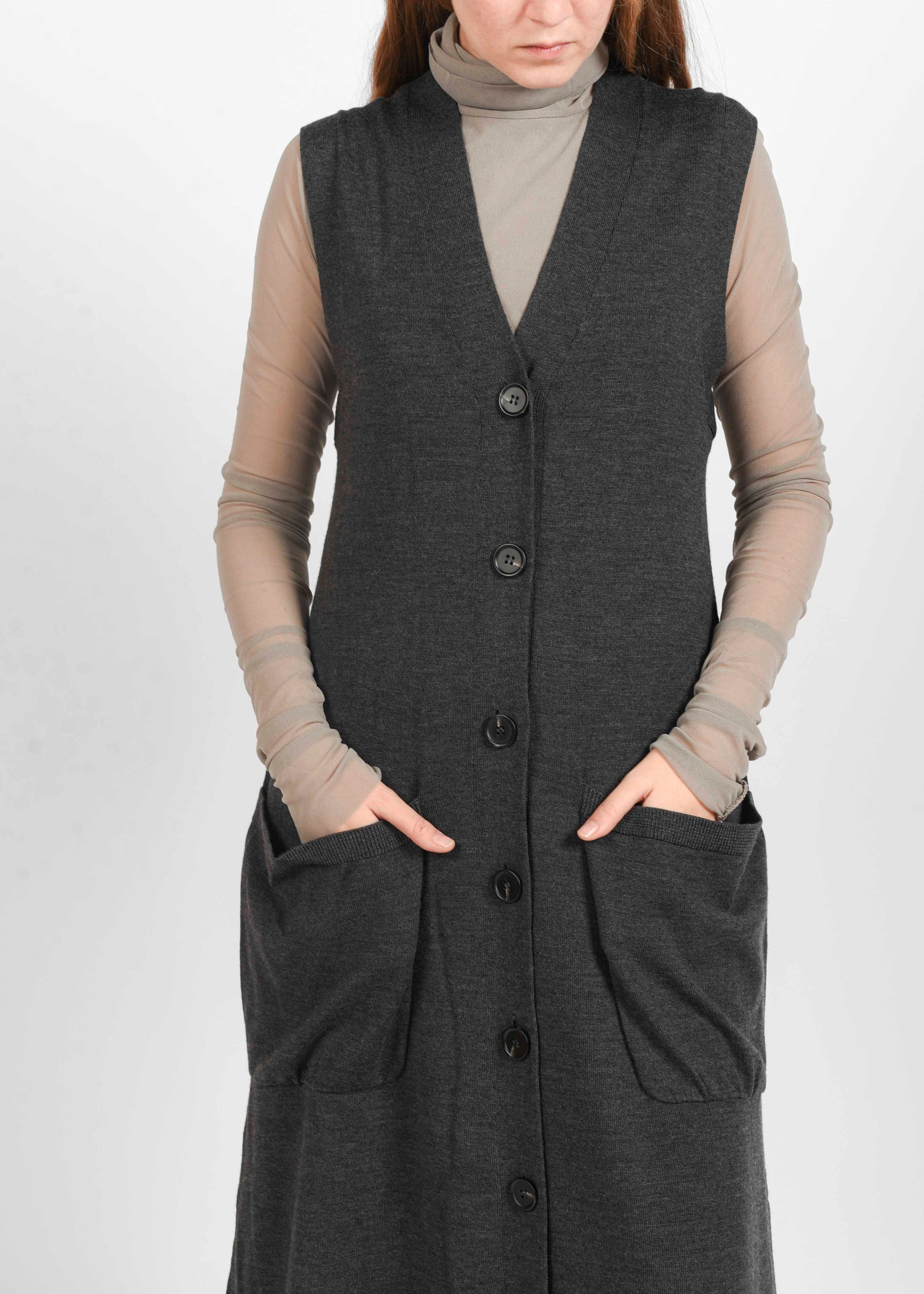 Cardigan lungo in lana merino, con scollo a V, bottoni grandi e tasconi frontali. Composizione: 100% lana merino.