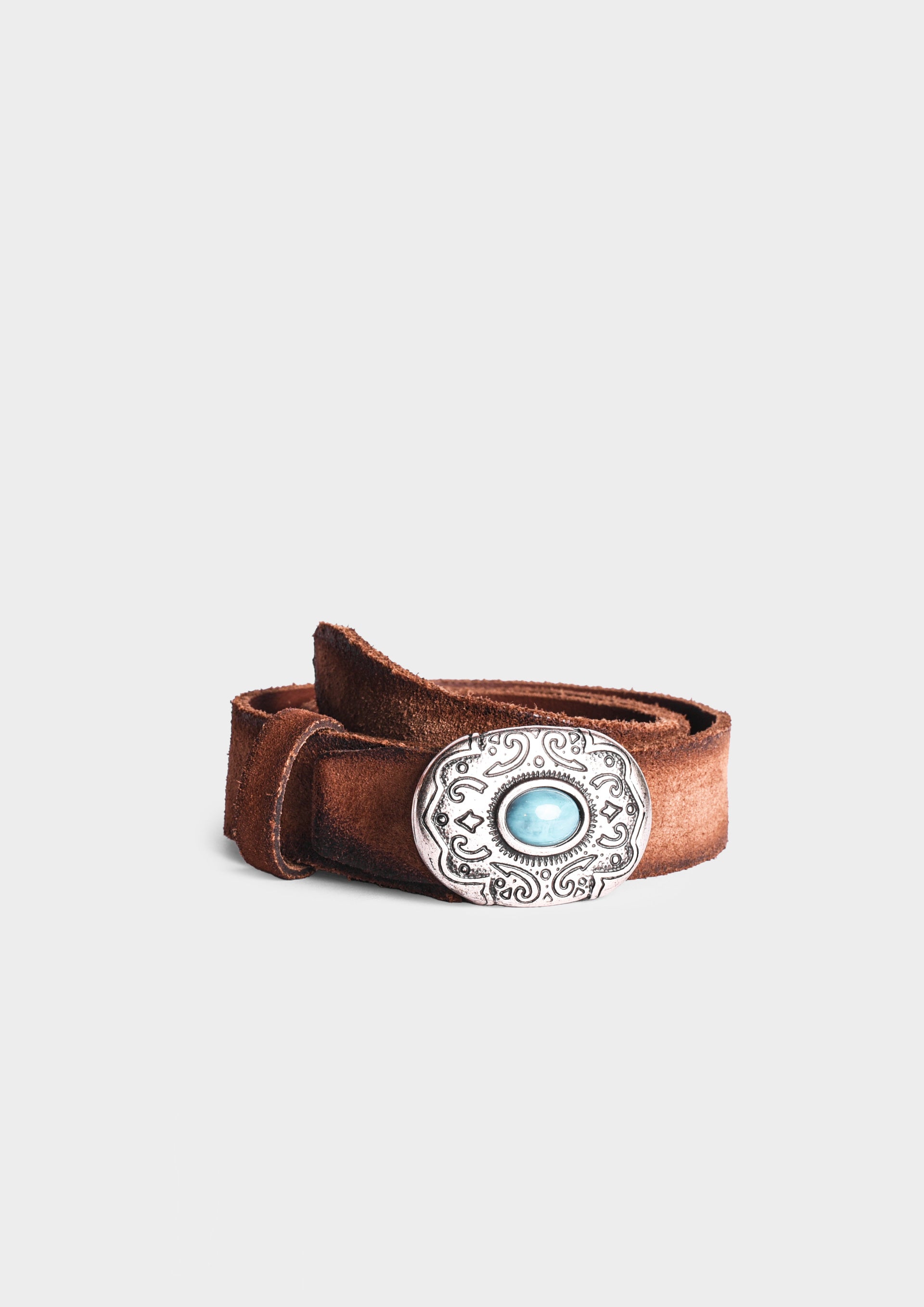 Cintura in pelle effetto vintage, caratterizzata da una fibbia in metallo decorata con dettagli incisi e una pietra turchese al centro. Il design boho-western la rende un accessorio perfetto per aggiungere un tocco di carattere ai tuoi outfit. Ideale da abbinare a jeans, vestiti o gonne per uno stile casual ma ricercato.