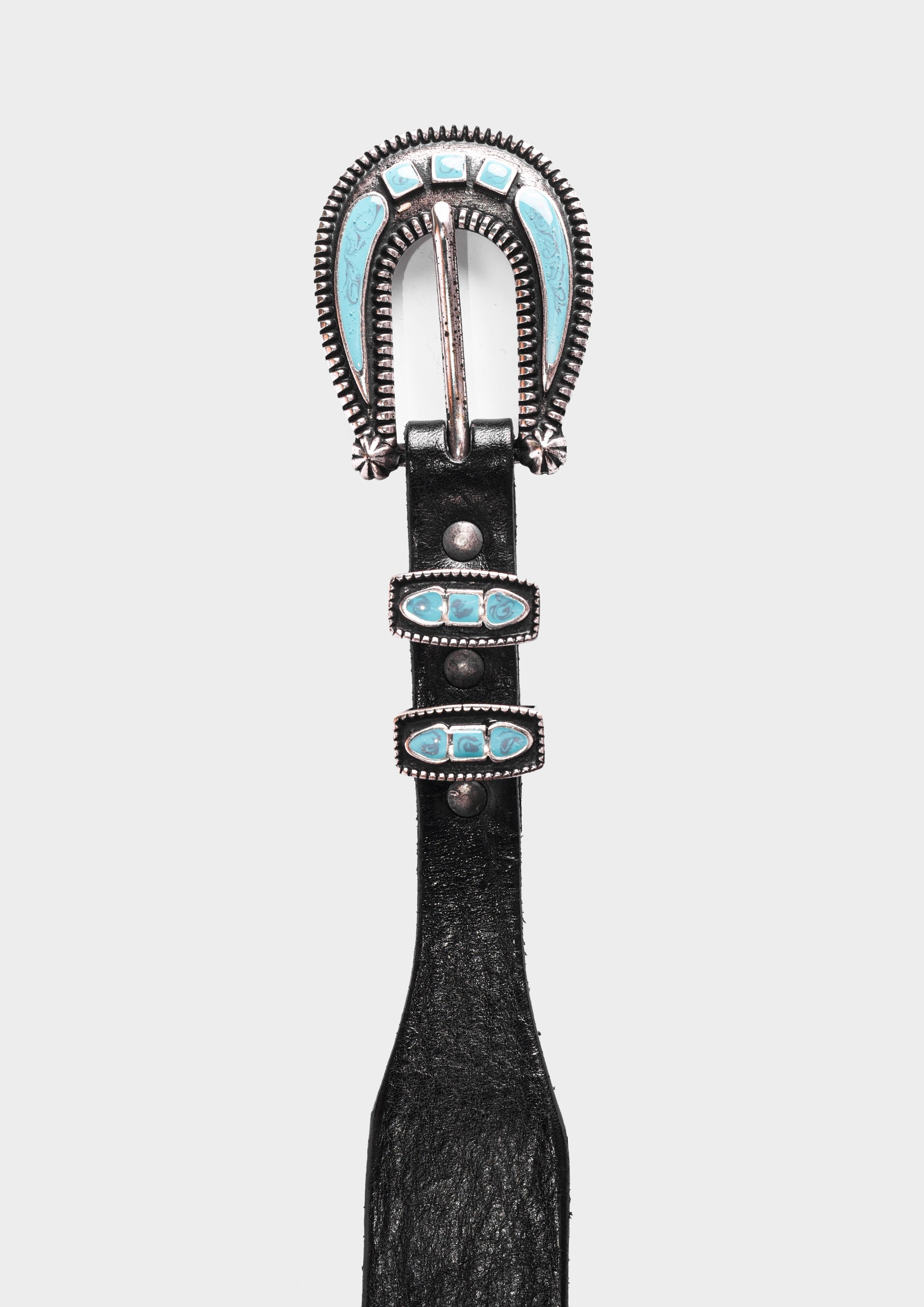 Cintura in pelle nera dal design elegante e ricercato, impreziosita da una fibbia in metallo lavorato con dettagli turchesi. Lo stile western vintage è enfatizzato dalle decorazioni incise e dagli inserti smaltati, che aggiungono un tocco di colore e originalità. Perfetta per completare look casual e boho-chic.