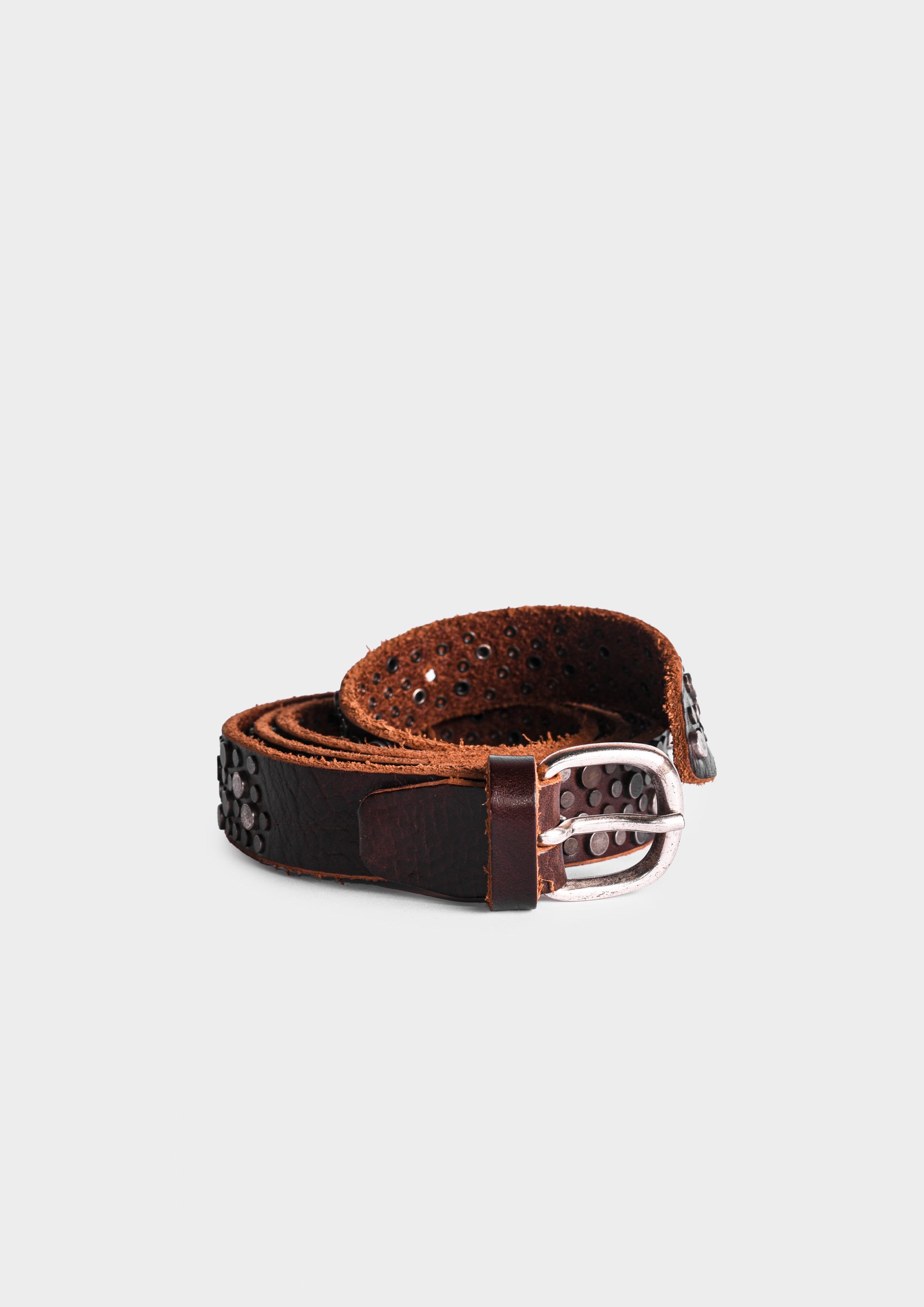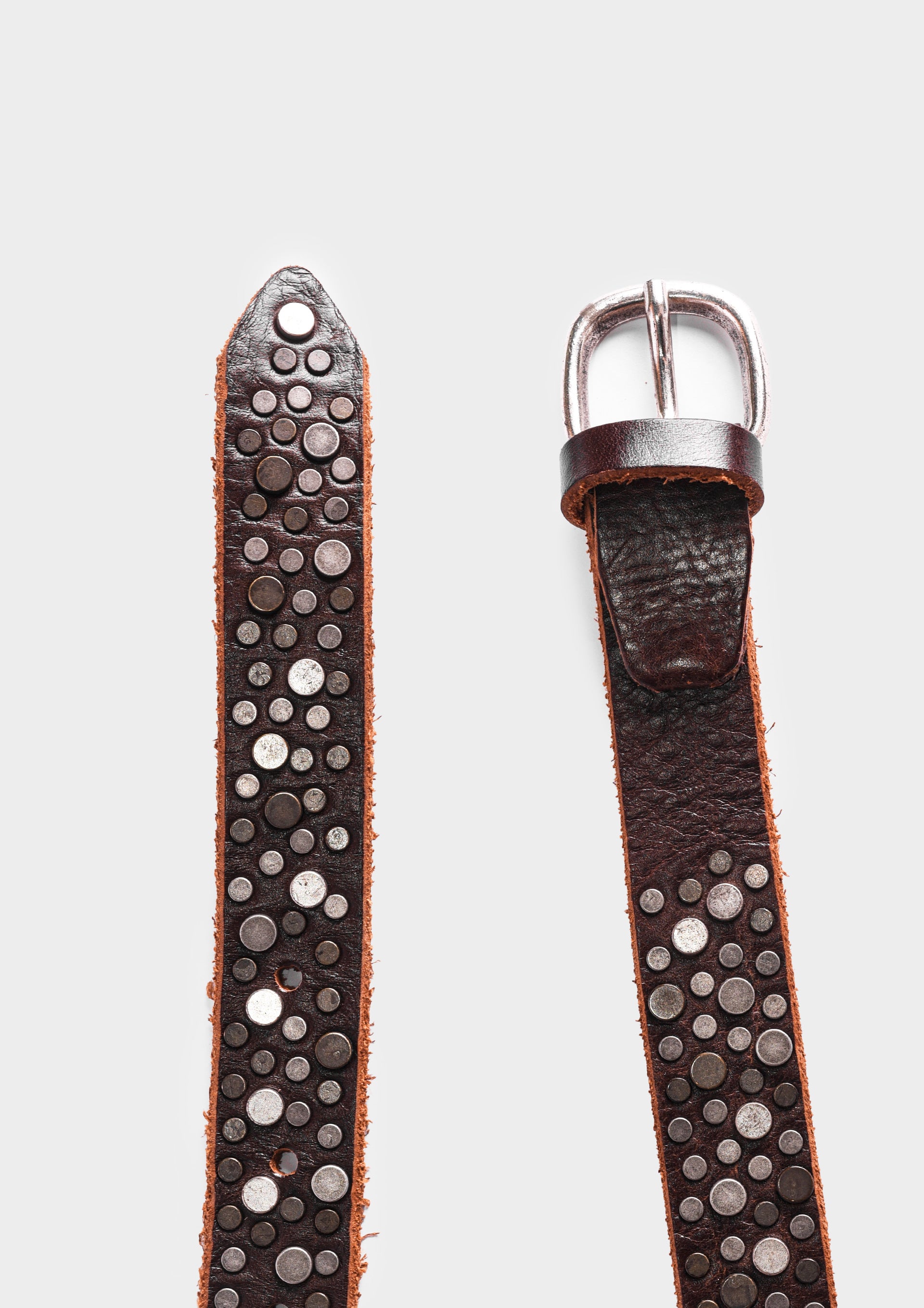 Cintura in pelle marrone con dettagli borchiati per un look grintoso e di carattere. Il design presenta una lavorazione con borchie tonde di diverse dimensioni, creando un effetto dinamico e accattivante. Dotata di fibbia in metallo argentato con effetto vintage, questa cintura è perfetta per aggiungere un tocco rock ai tuoi outfit. Ideale da abbinare a jeans, pantaloni o vestiti per un look casual ma deciso.