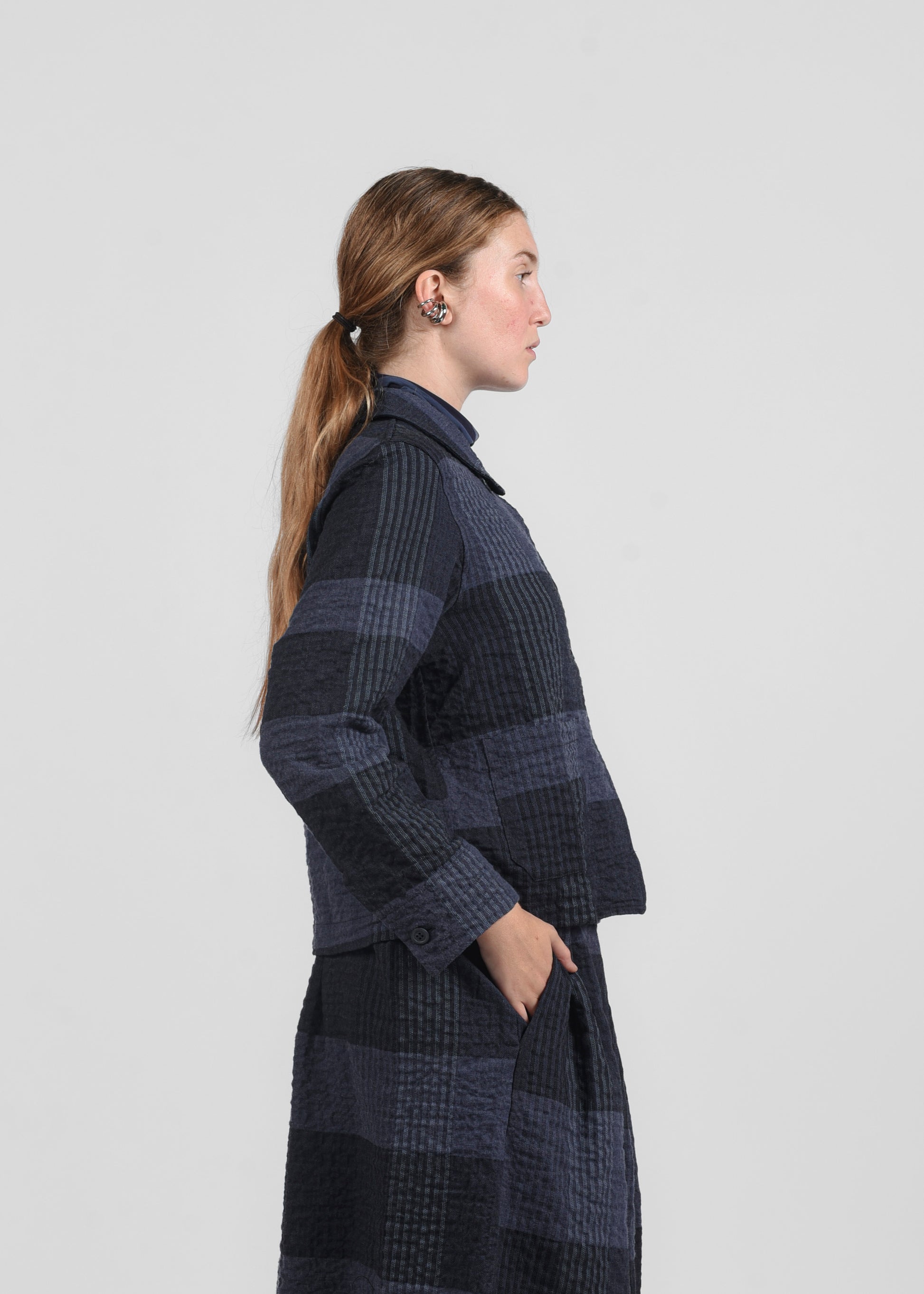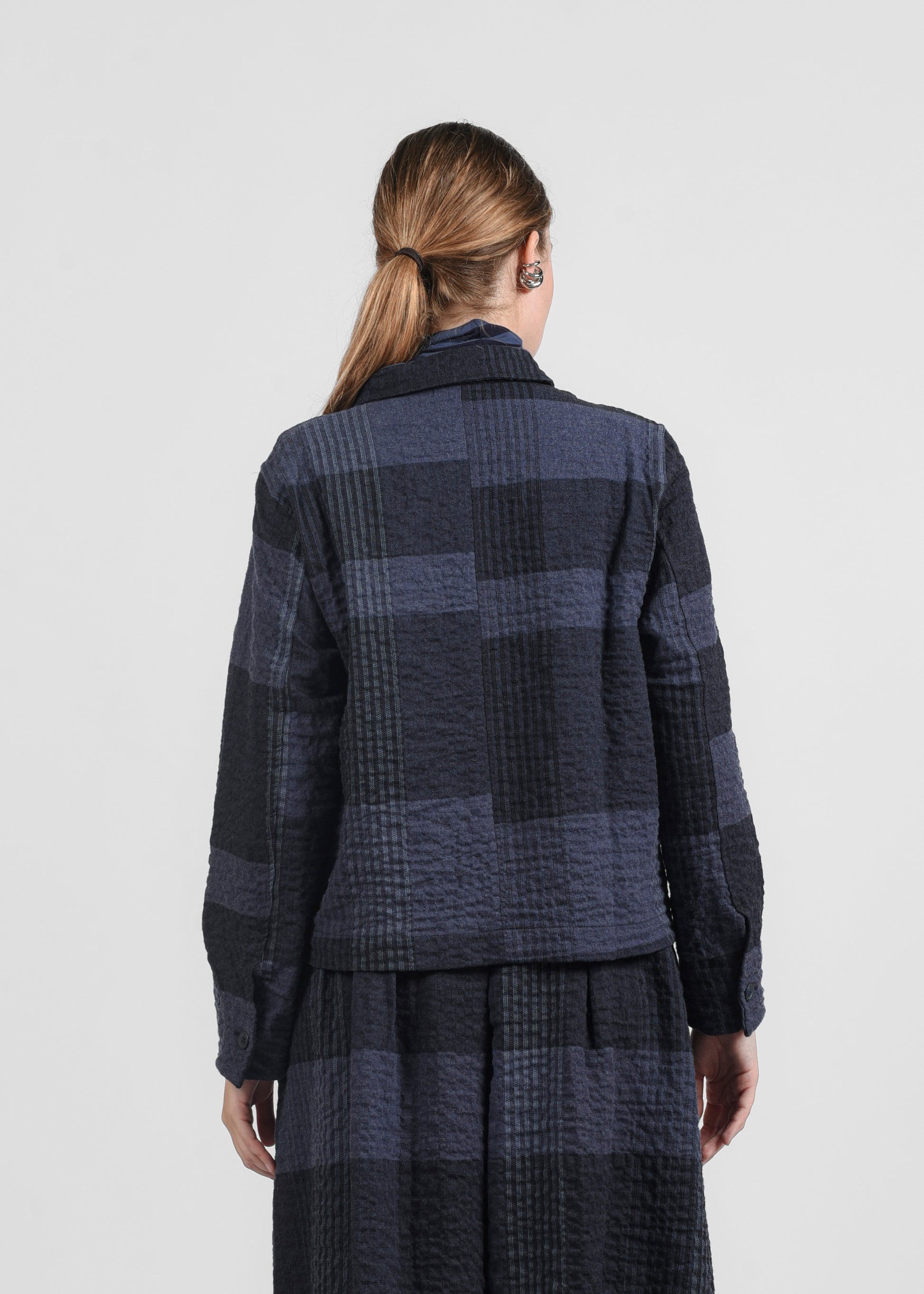 Giacca destrutturata in tessuto check, dal modello scatola e con quattro bottoni frontali. Linea leggermente goffrata che conferisce un look moderno e casual, versatile per outfit sia eleganti che quotidiani. Realizzata in 99% cotone e 1% elastan per comfort e vestibilità.