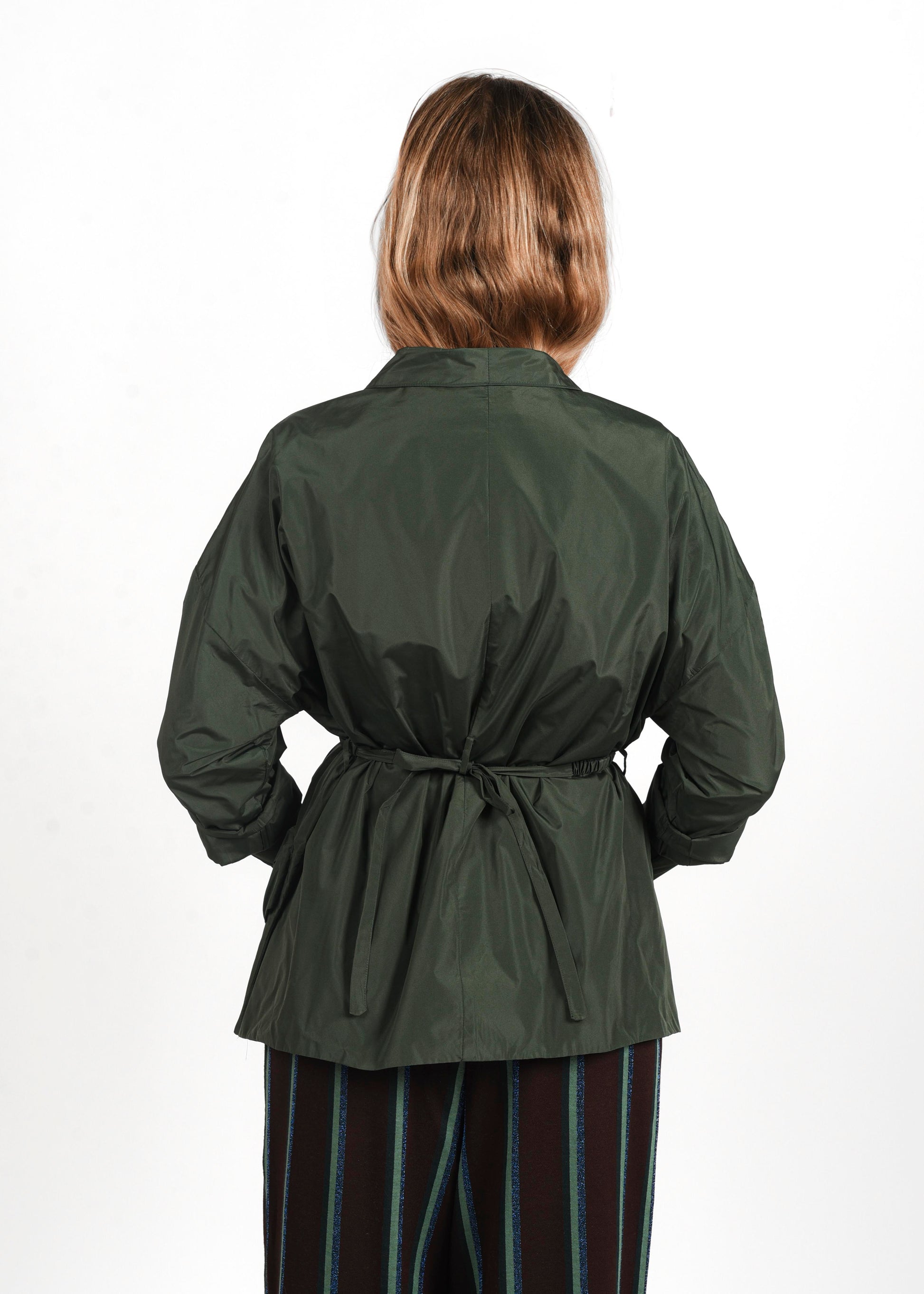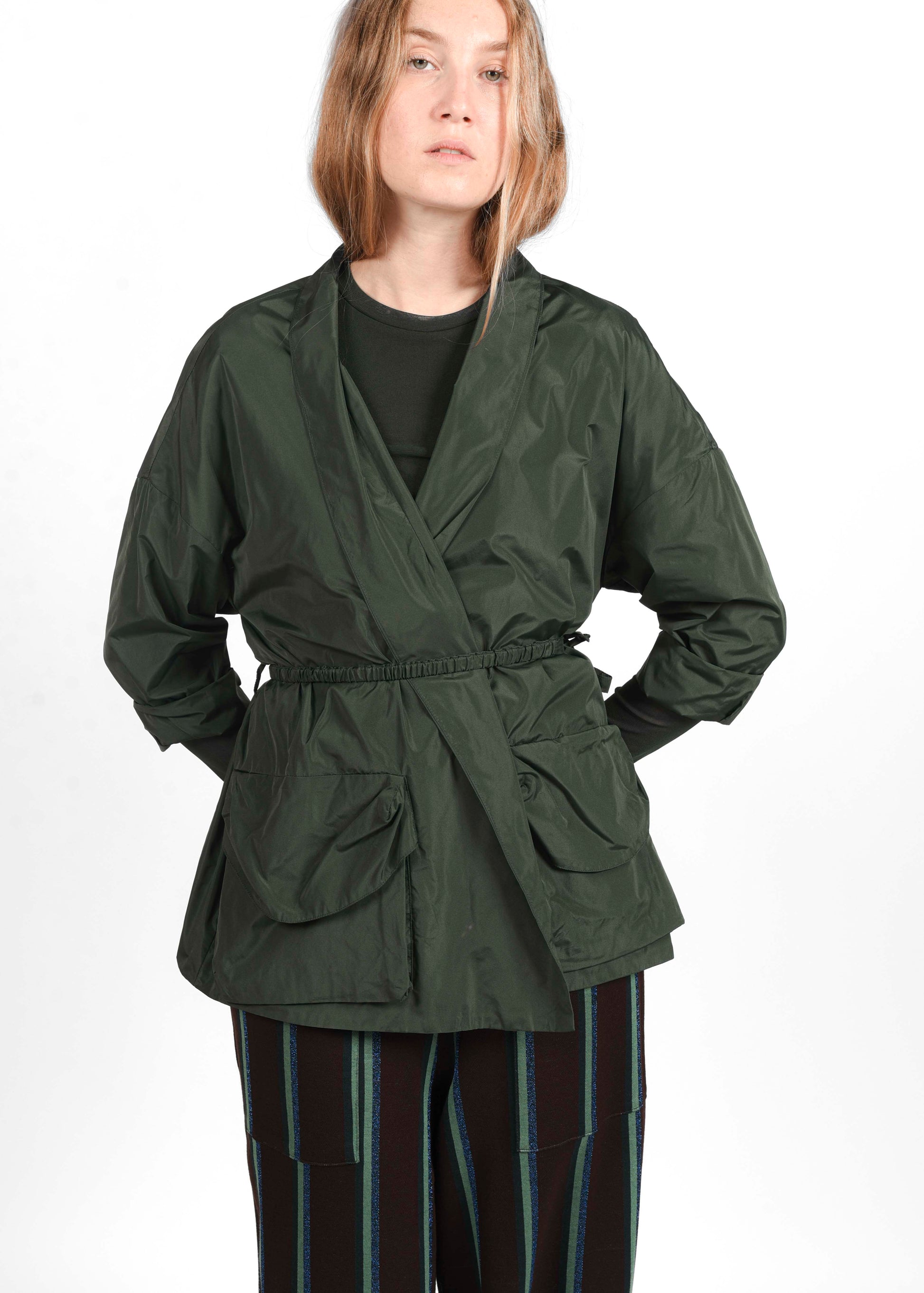 Giacca kimono in tessuto tecnico, con chiusura a portafoglio, cintura e tasconi frontali. Composizione: 100% poliestere.