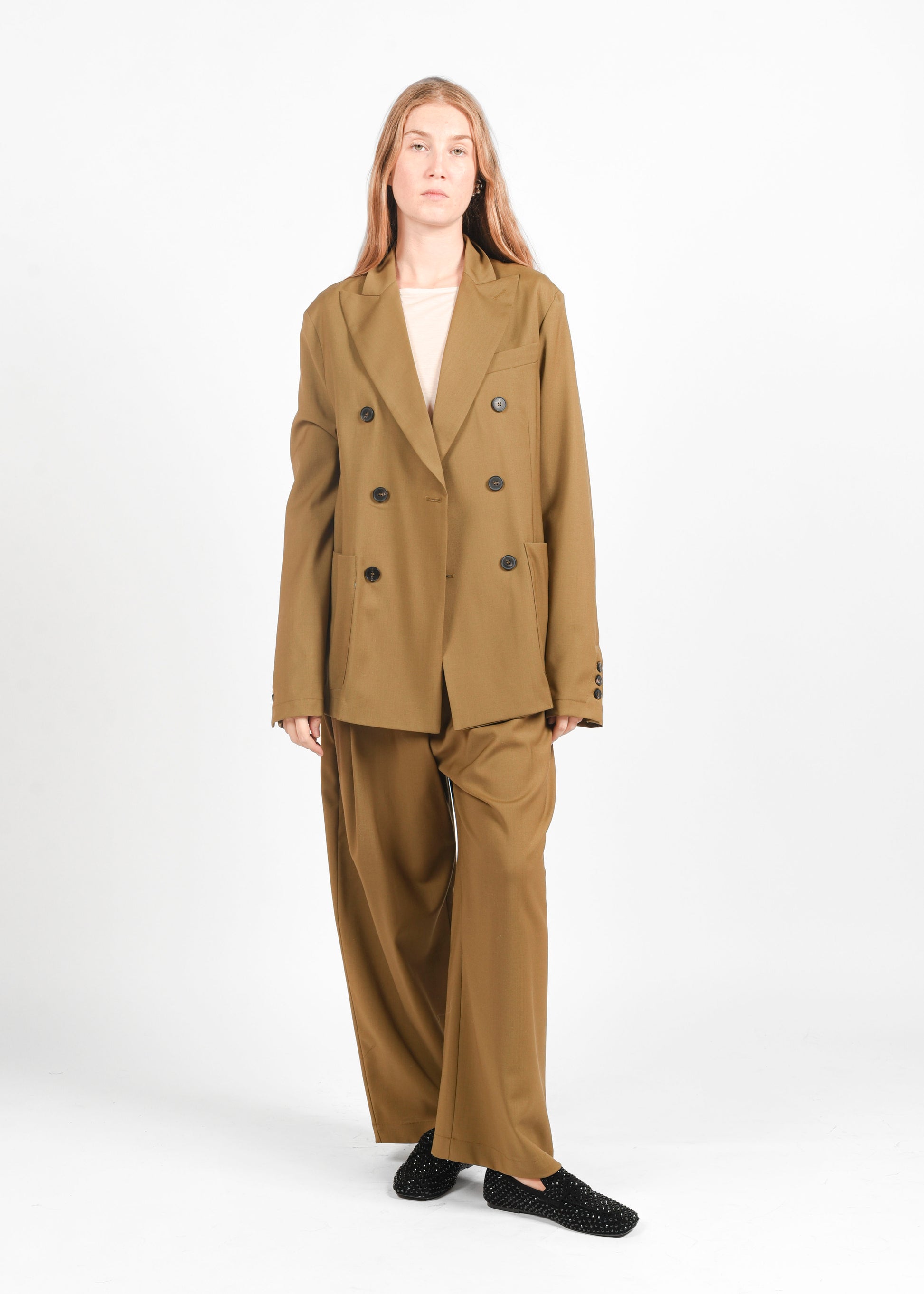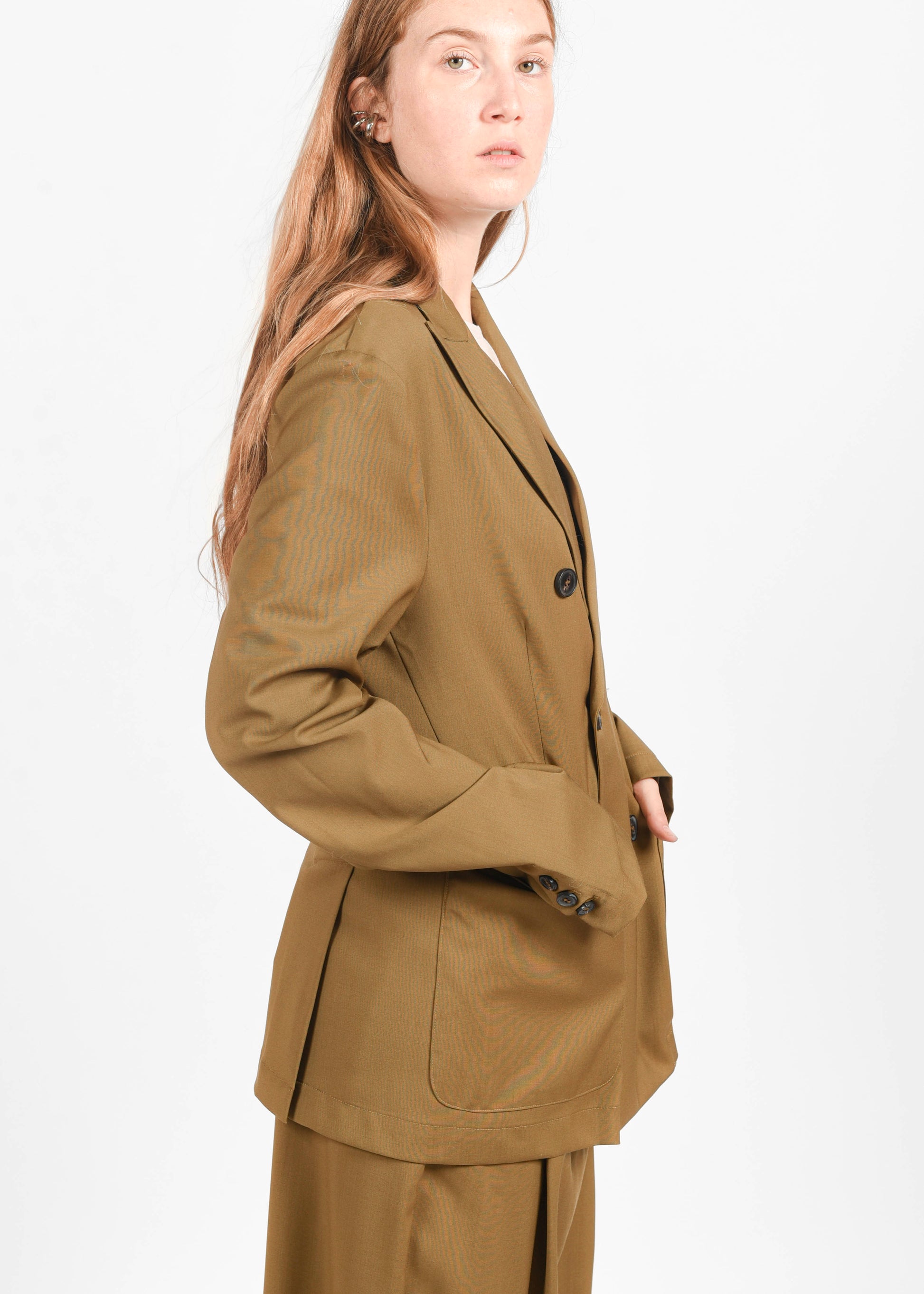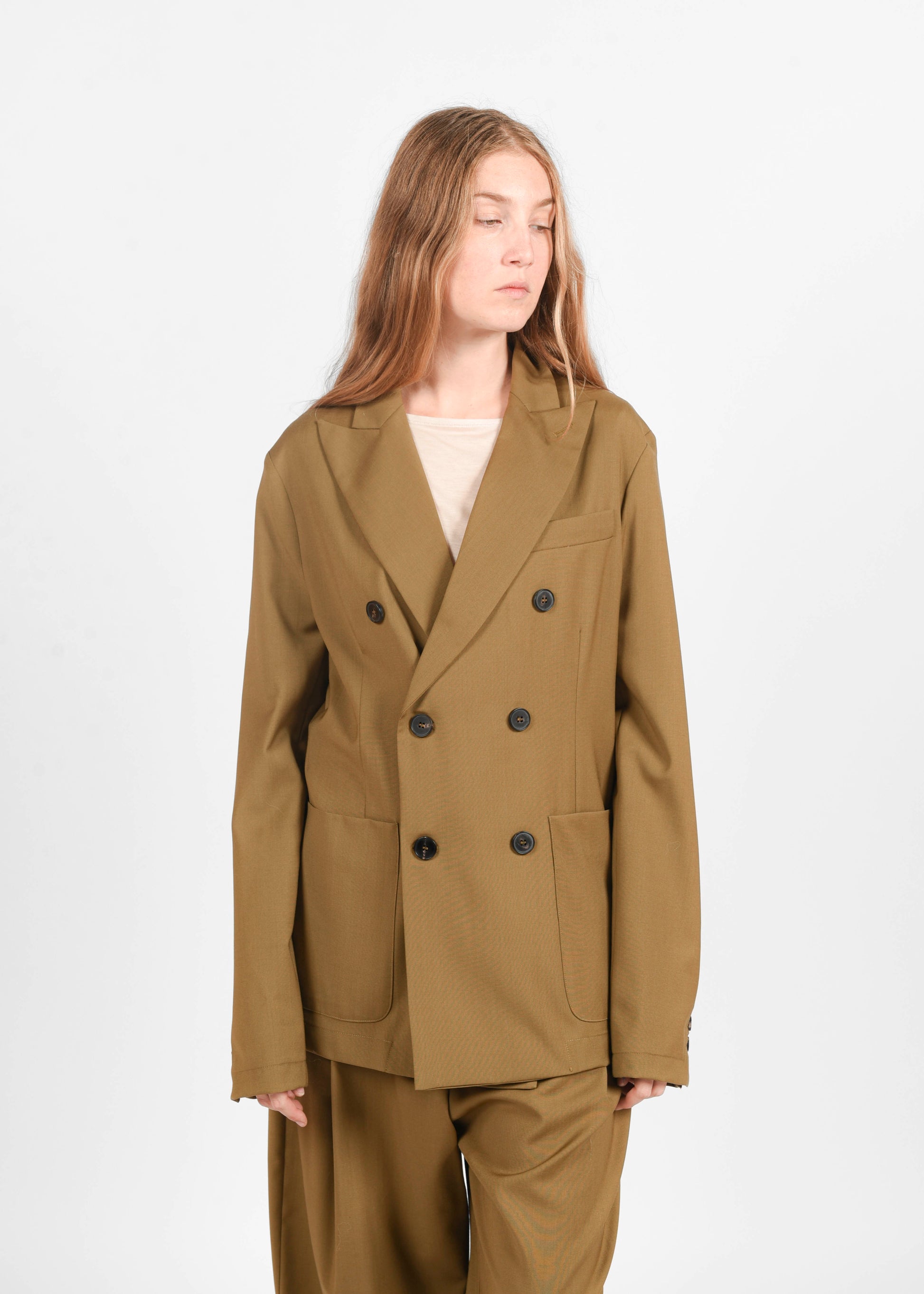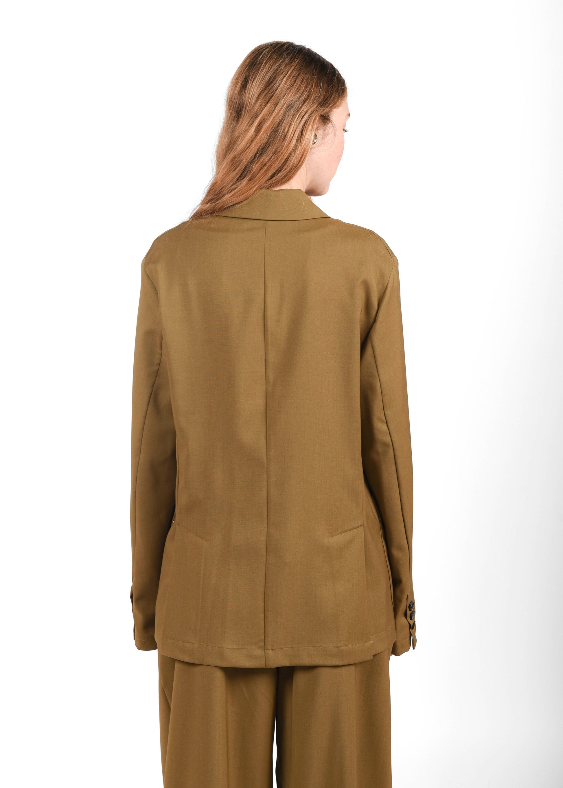Giacca doppiopetto sfoderata con tasche anteriori, doppio spacco sul retro e bottoni a contrasto.