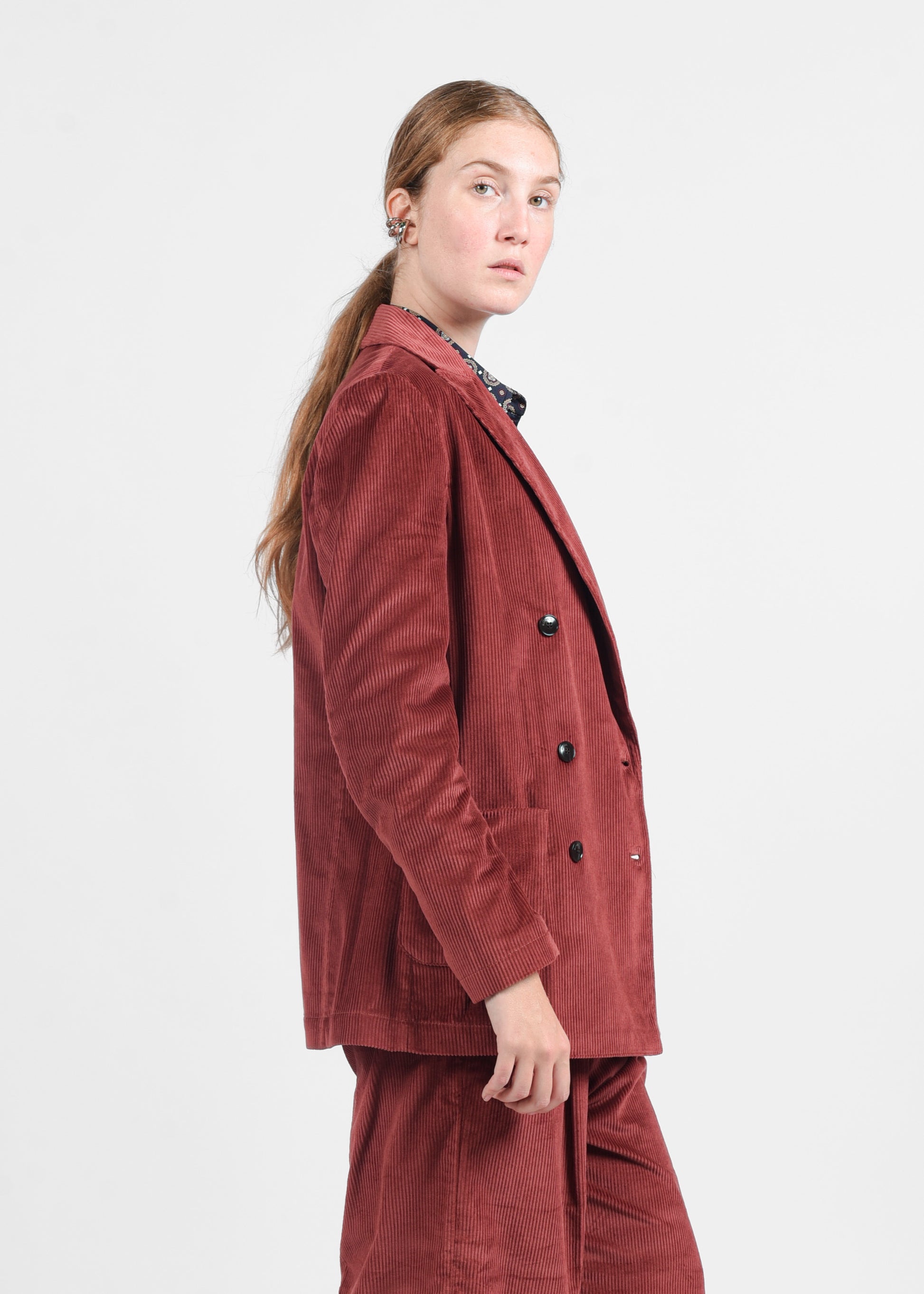 Giacca lunga doppiopetto in velluto a coste, con tasche anteriori. Dal taglio morbido e sofisticato, unisce comfort e stile, perfetta per look eleganti e casual chic.