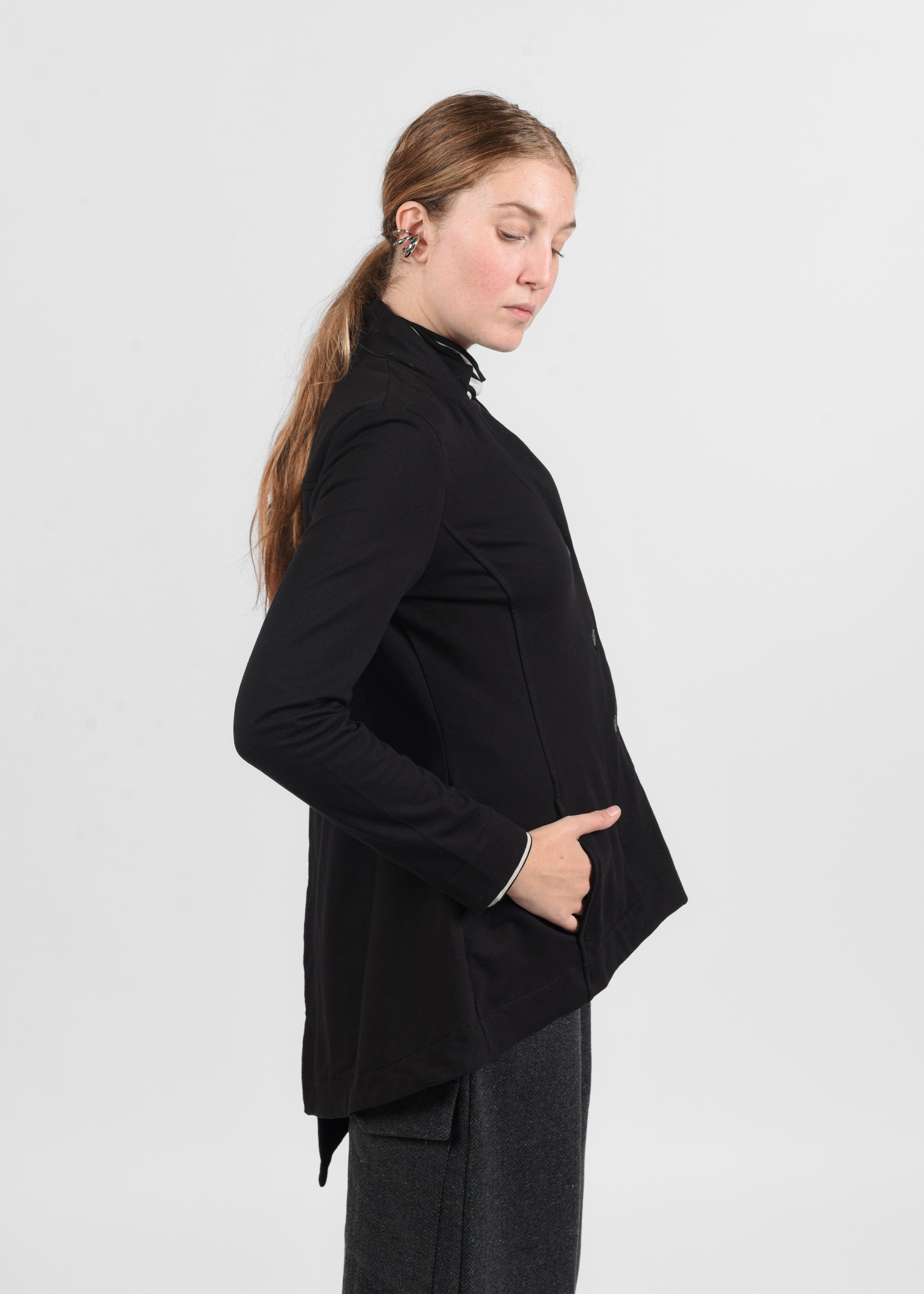 Giacca in jersey di cotone con chiusura a tre bottoni e parte posteriore dal taglio asimmetrico stile frac, che aggiunge dinamismo e carattere al capo. Realizzata in 95% cotone e 5% elastan, offre comfort, vestibilità e uno stile contemporaneo e versatile.