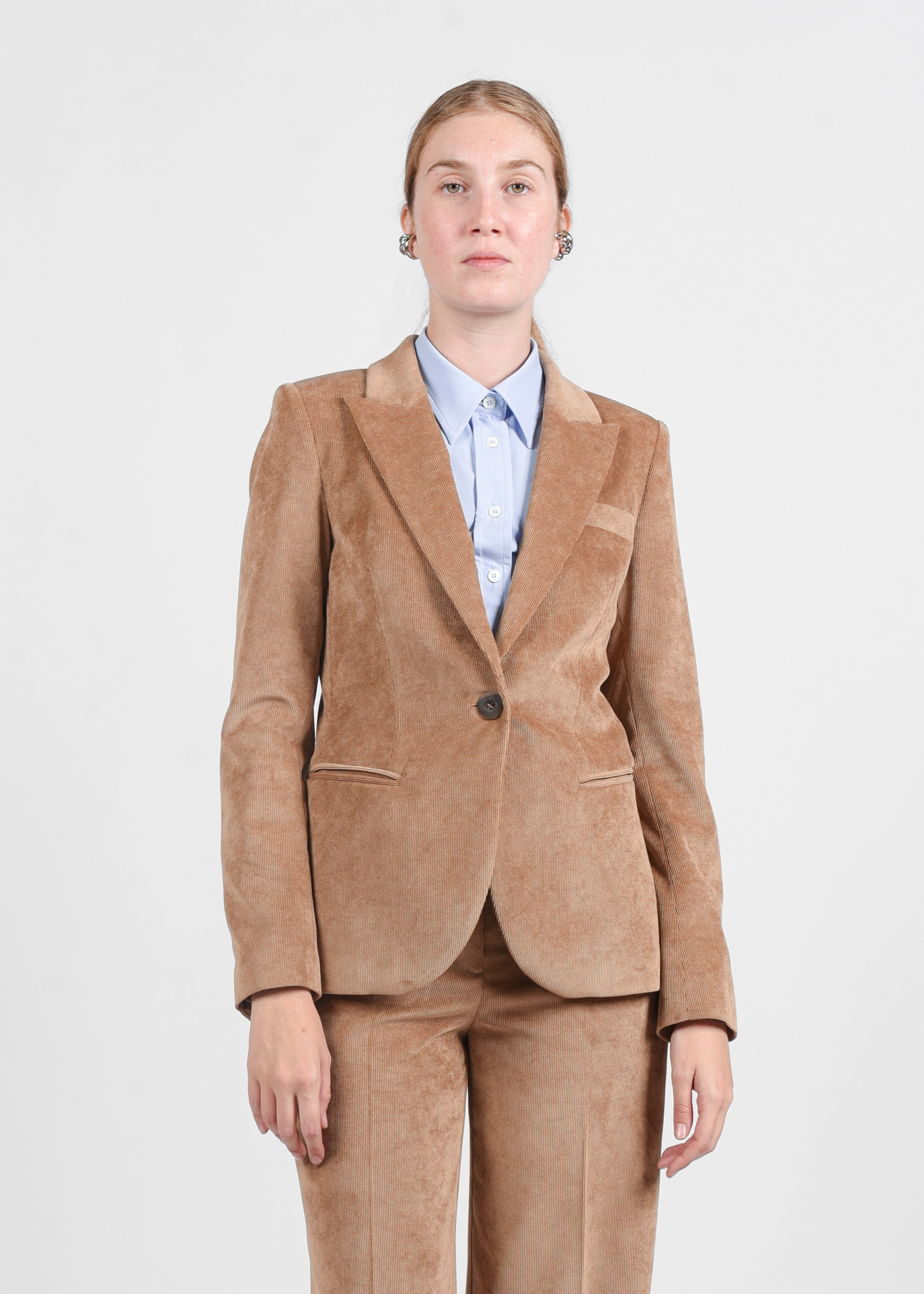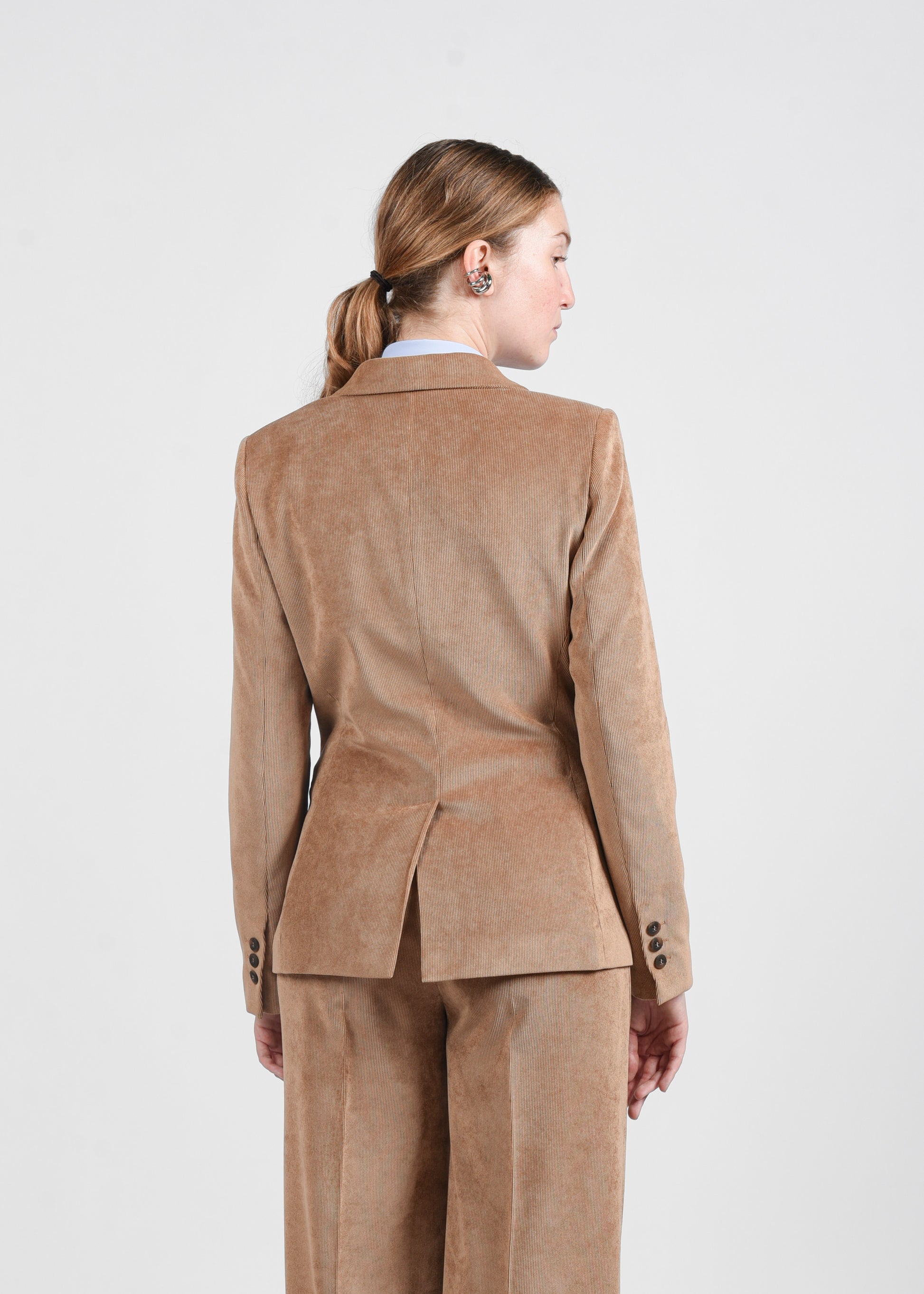 Giacca monopetto sciancrata in velluto a coste, dal taglio elegante e femminile. Caratterizzata da una vestibilità aderente che valorizza la silhouette, è realizzata in 85% poliestere, 12% poliammide e 3% elastan, offrendo comfort, morbidezza e un tocco sofisticato ideale per look formali o casual chic.