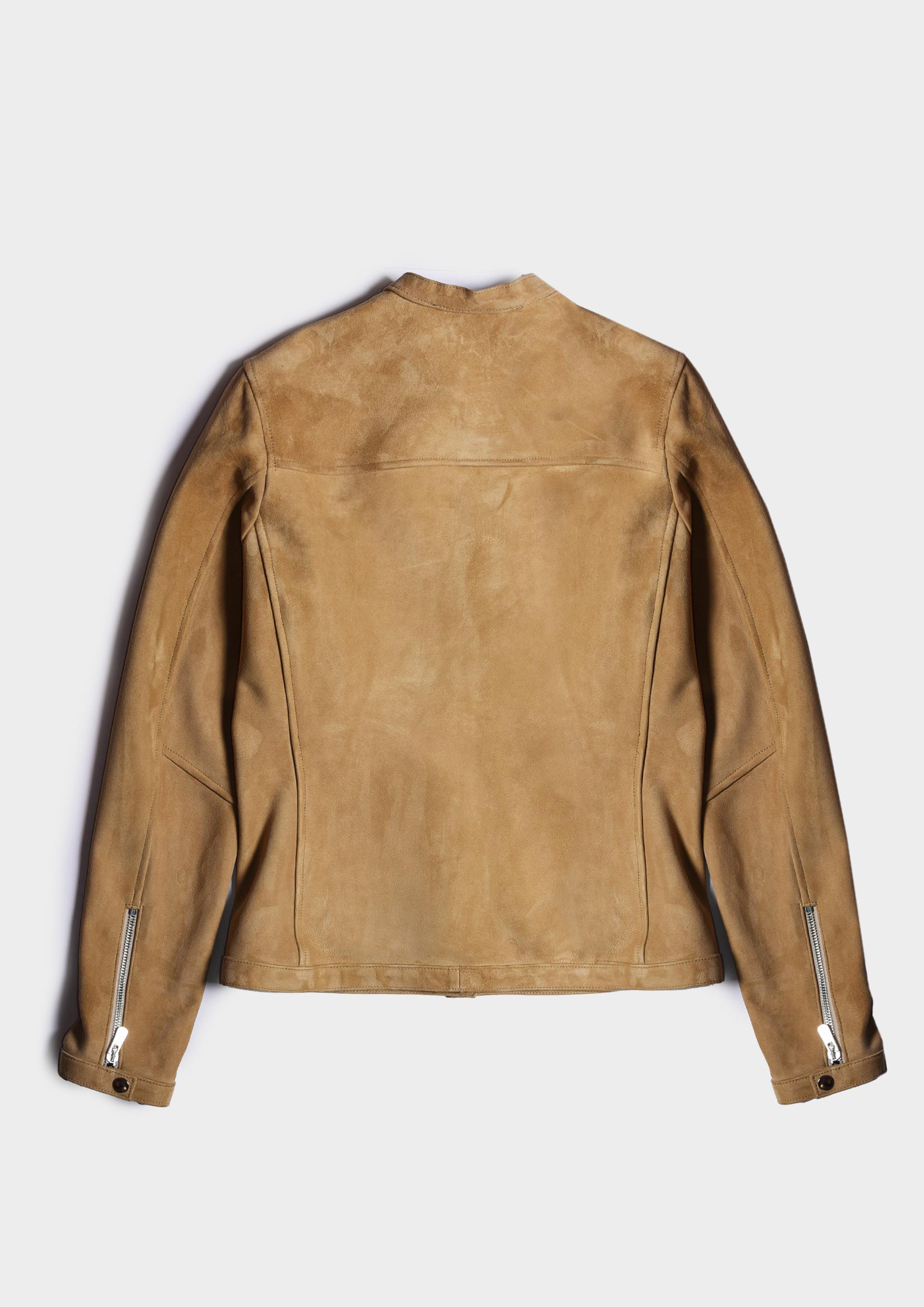 Questo è un classico giubbino in pelle sfoderato, realizzato al 100% in vera pelle. Presenta una zip frontale e due tasche laterali con chiusura a zip. Il colore beige chiaro e la finitura scamosciata gli conferiscono un look elegante e versatile.