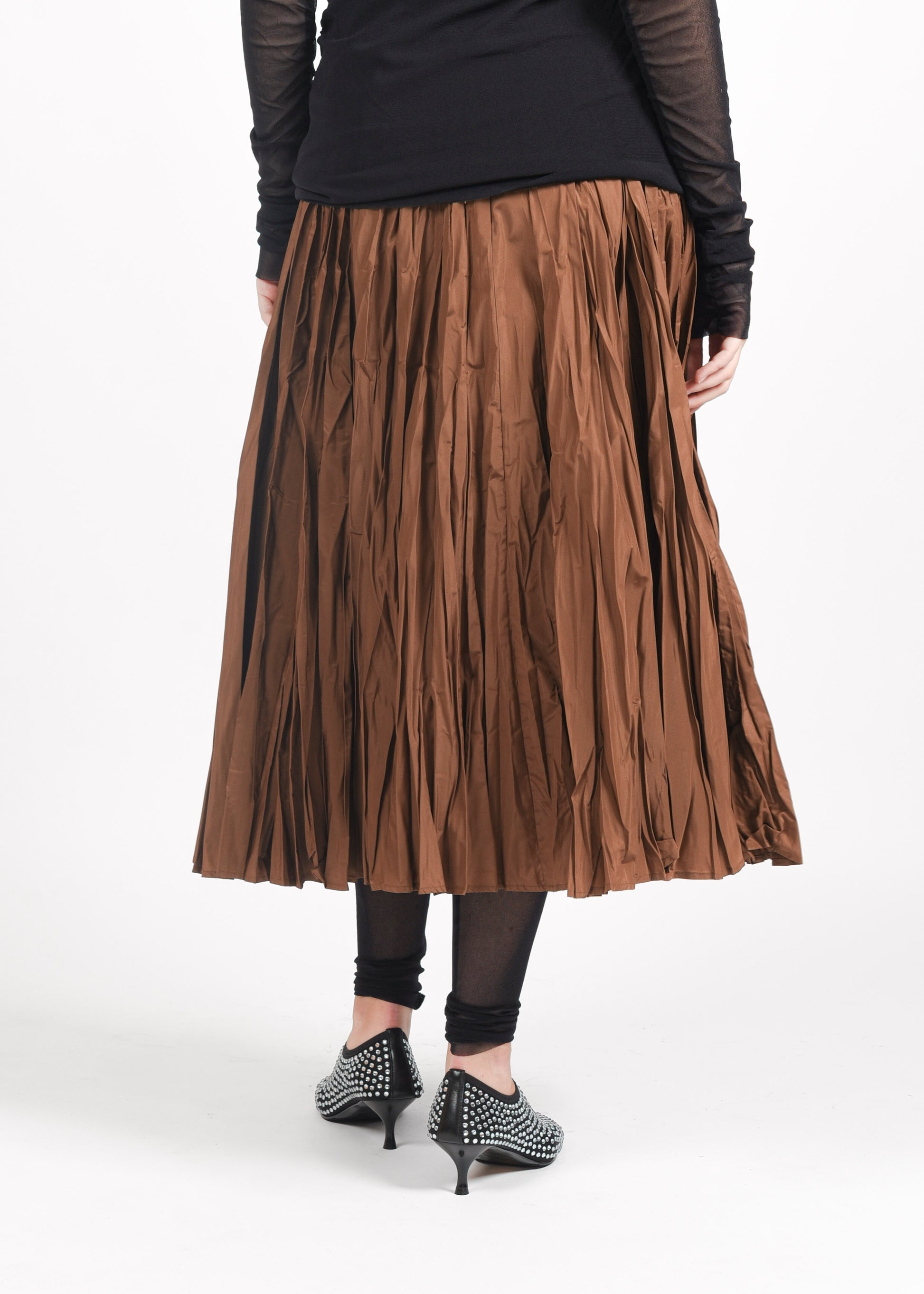 Gonna a ruota estremamente ampia con effetto a pieghe stropicciate, lunga, realizzata in tessuto tecnico. Elastico in vita con zip posteriore e tasche laterali.