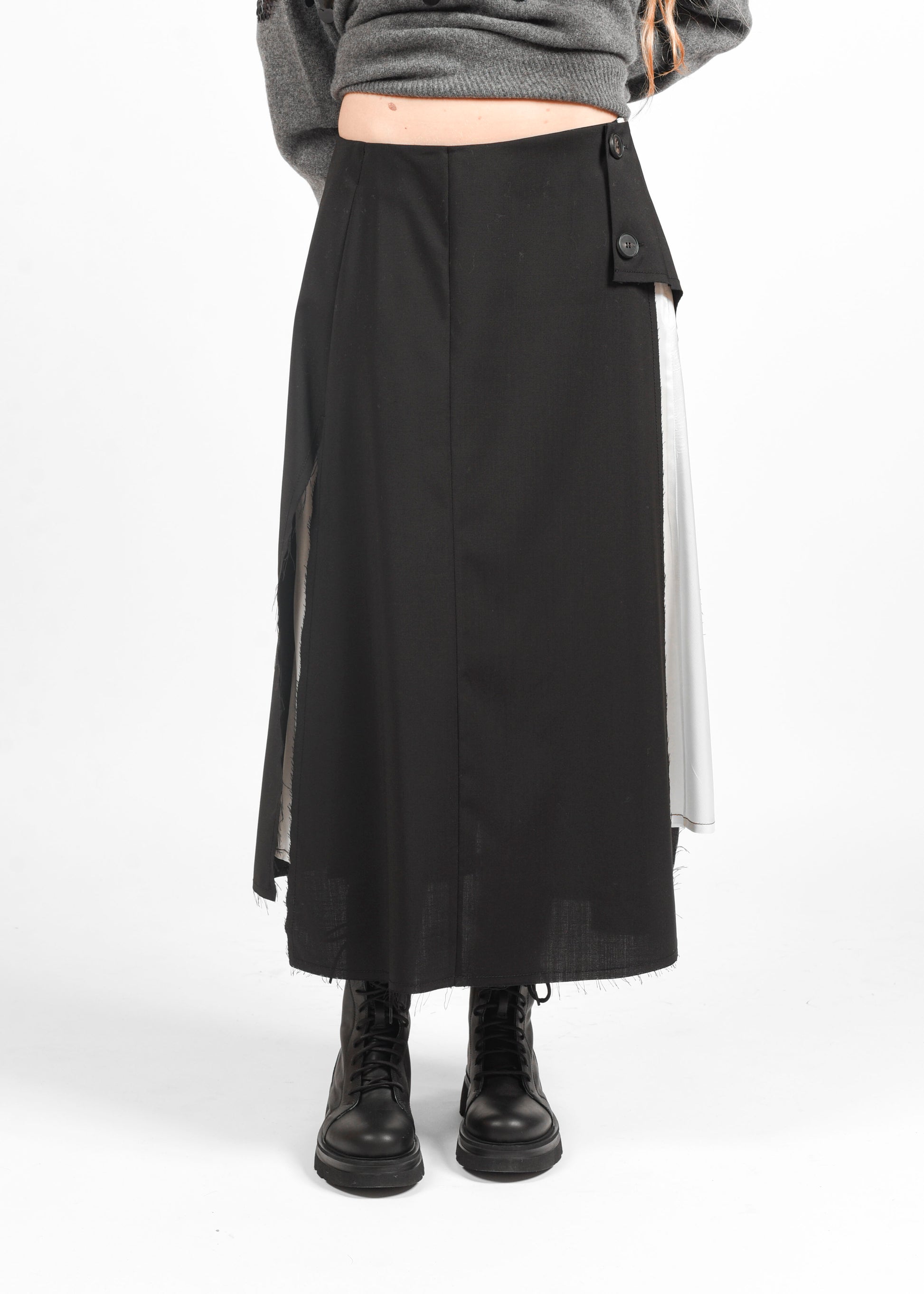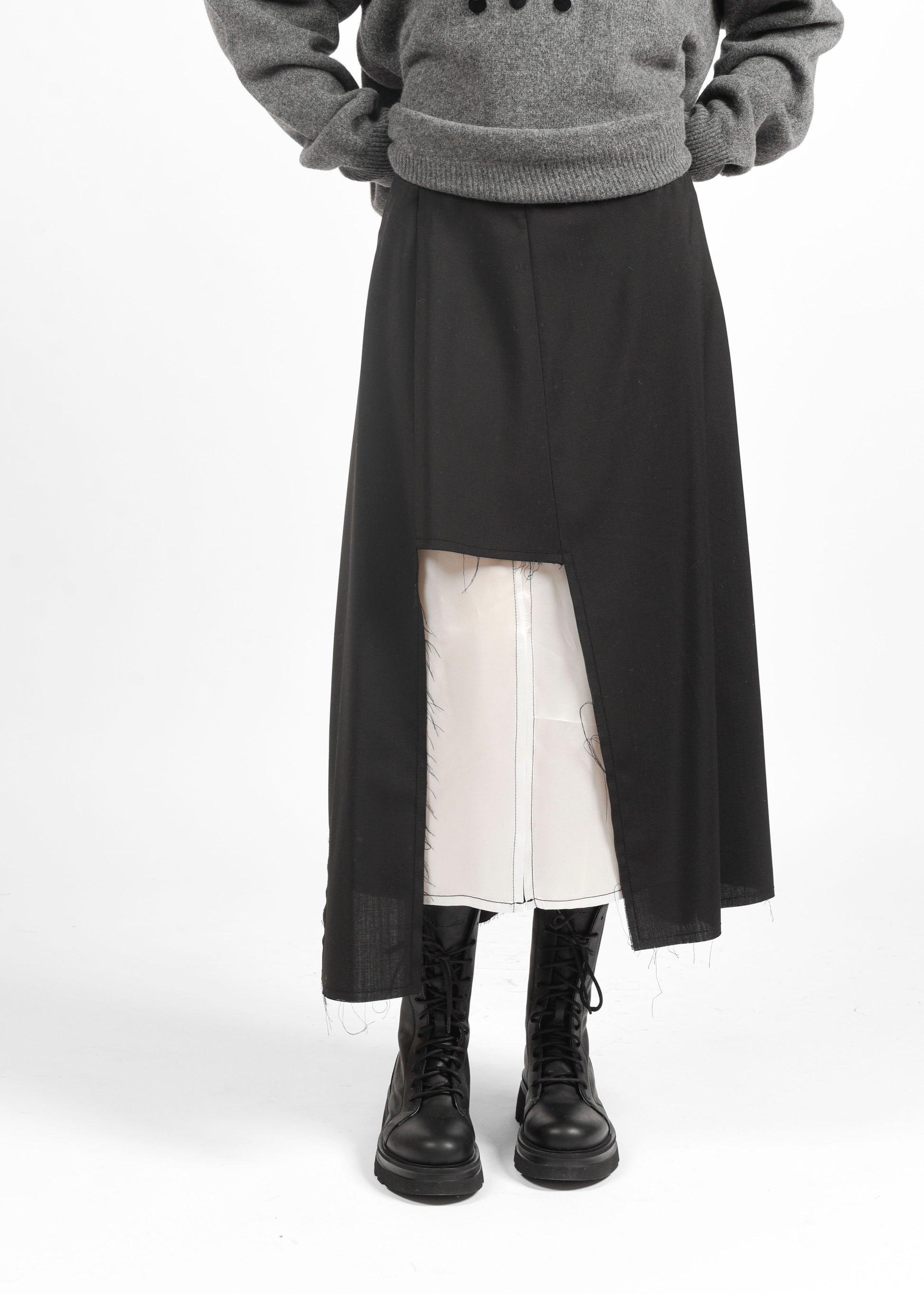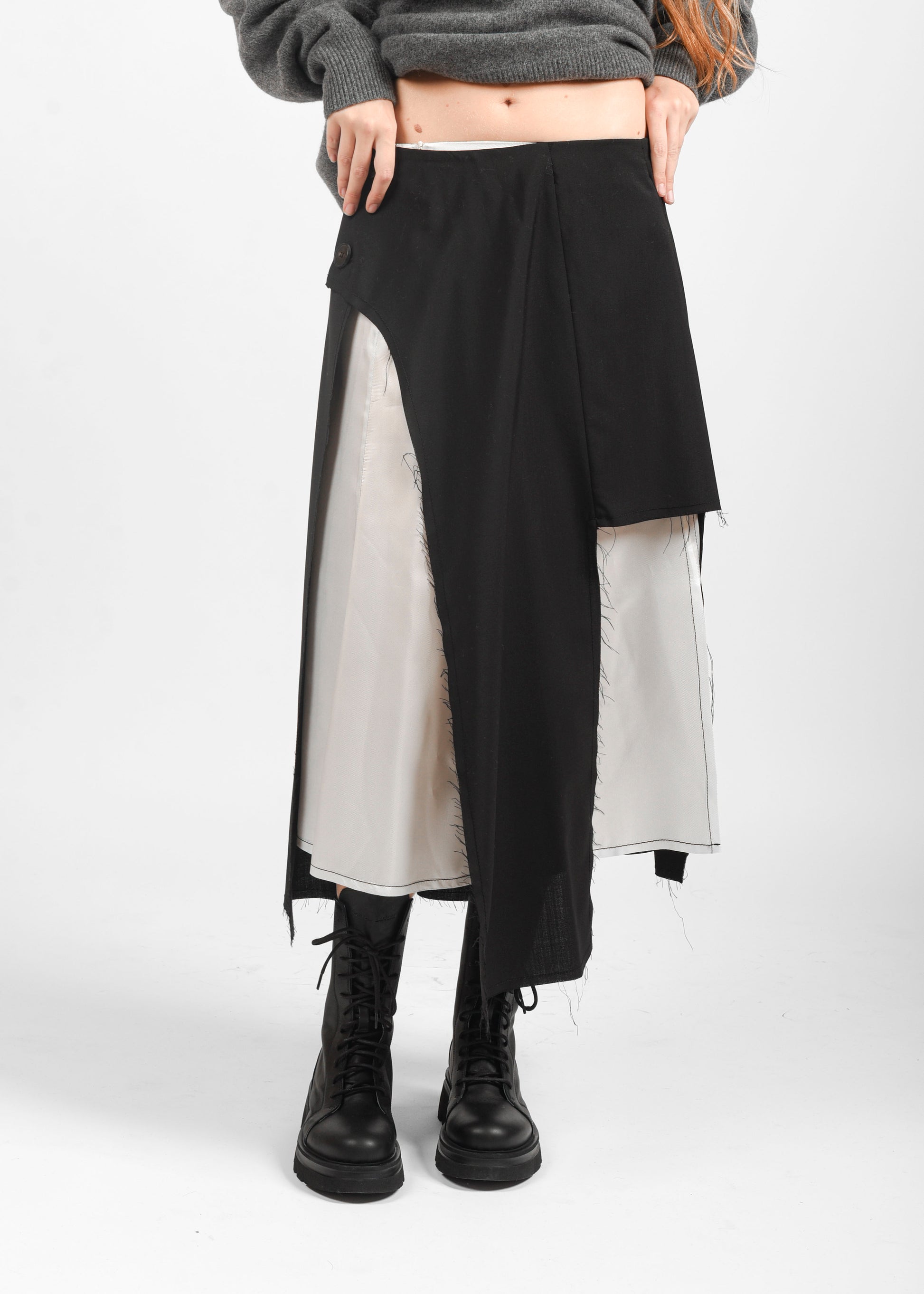 Gonna lunga doppia con sovrapposizione e sottana a contrasto a vista, rifinita a taglio vivo. Modello versatile, indossabile in diversi modi.