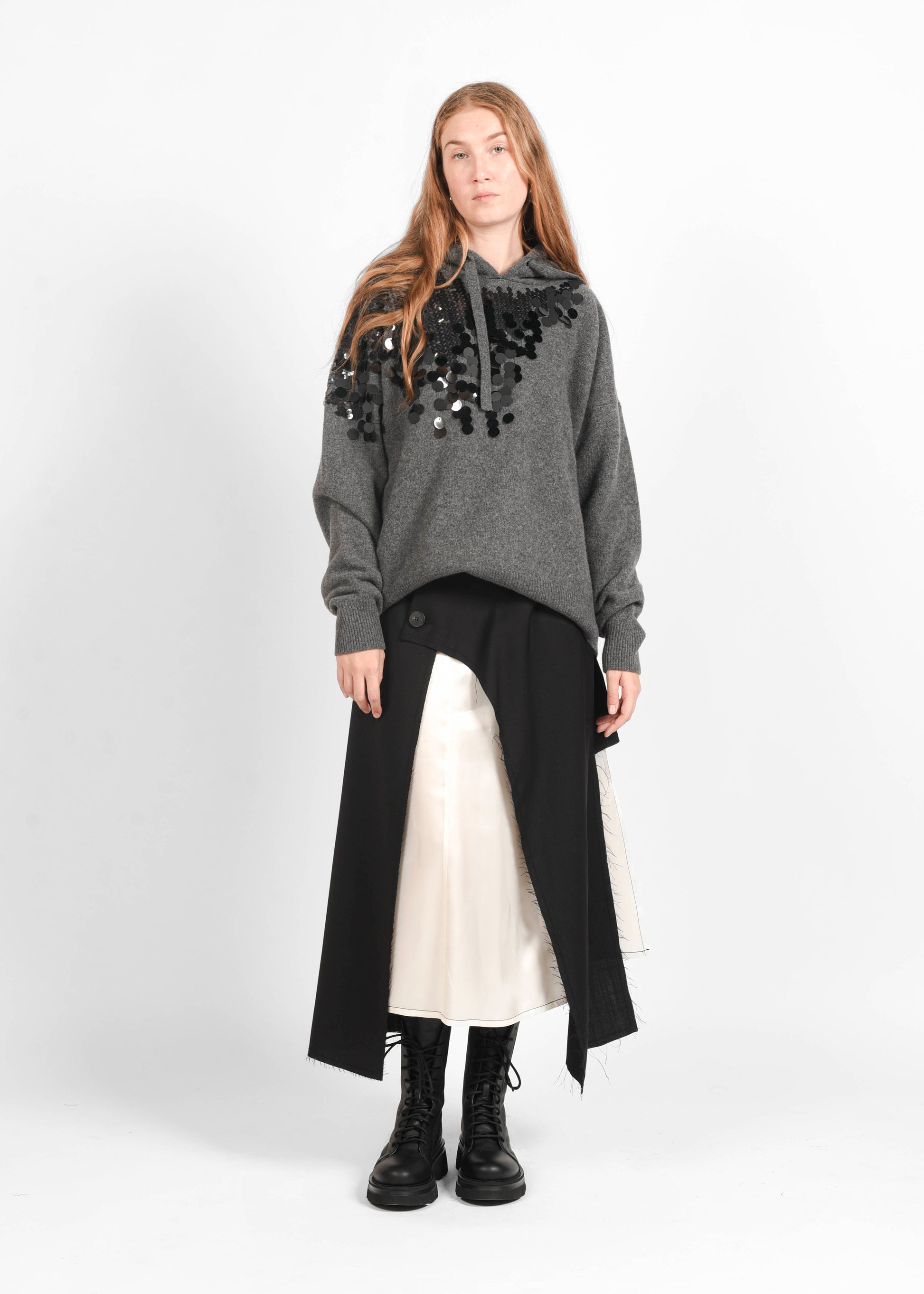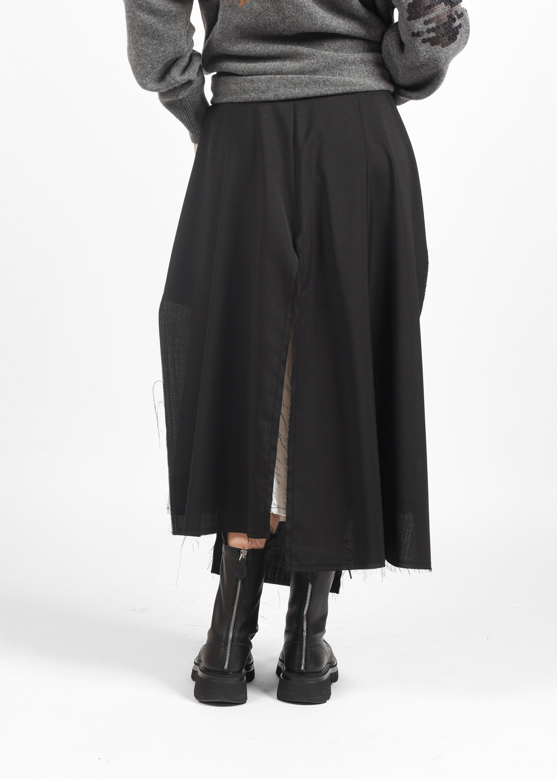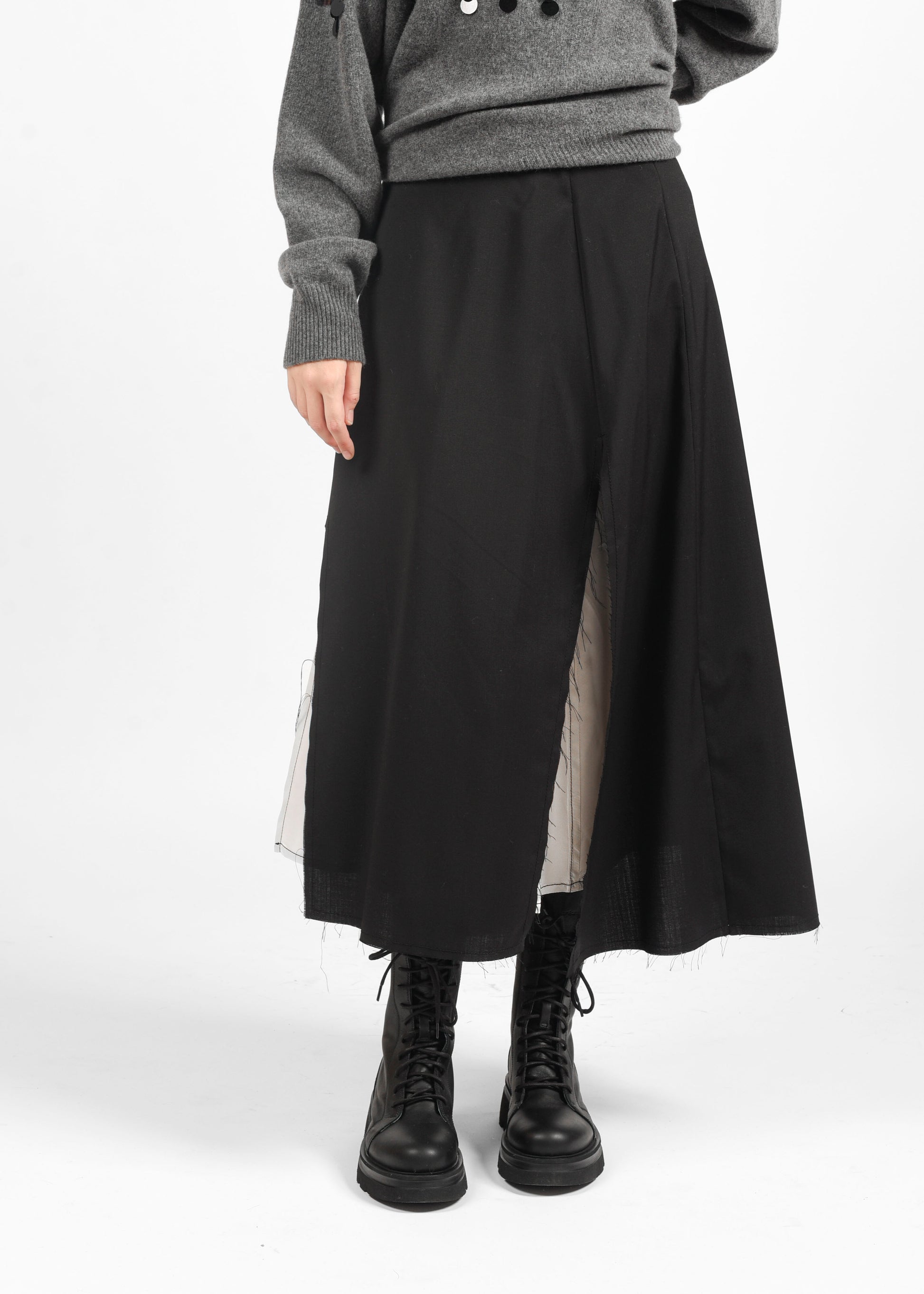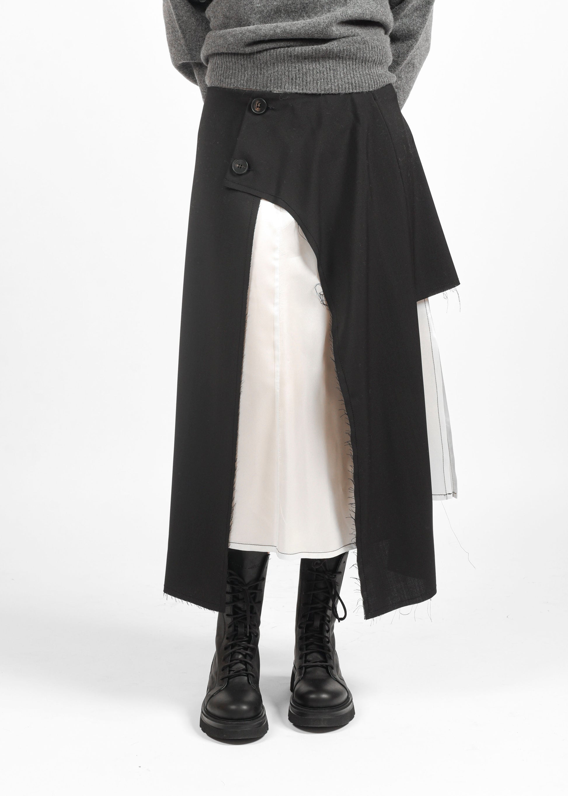 Gonna lunga doppia con sovrapposizione e sottana a contrasto a vista, rifinita a taglio vivo. Modello versatile, indossabile in diversi modi.