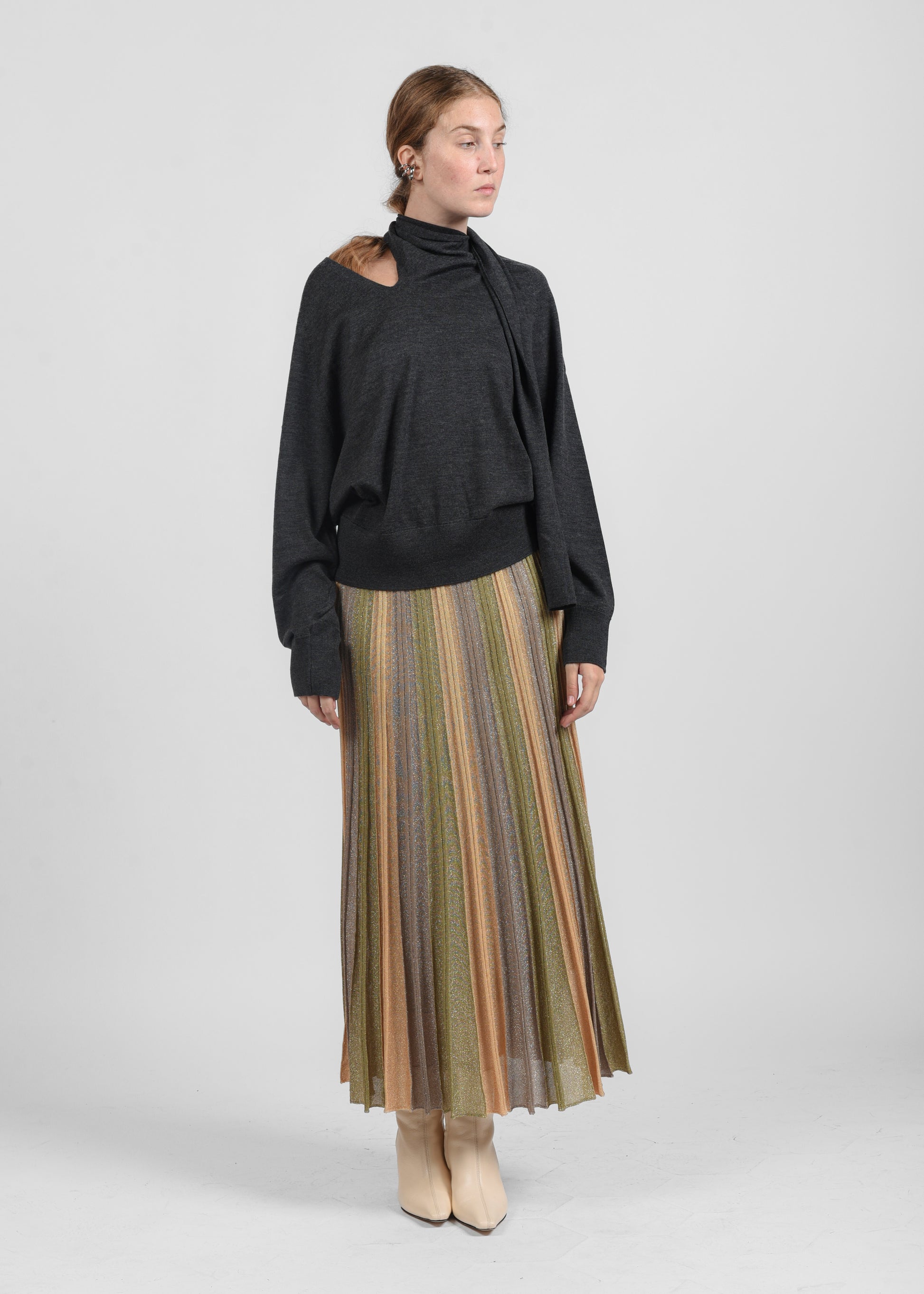 Gonna con elastico in vita, caratterizzata da una lavorazione plissé che dona movimento e leggerezza. Il filo lurex inserito nel tessuto la rende particolarmente luminosa ed elegante, ideale per look serali e sofisticati. Composizione: 56% viscosa, 29% cupro, 15% poliestere metallizzato.