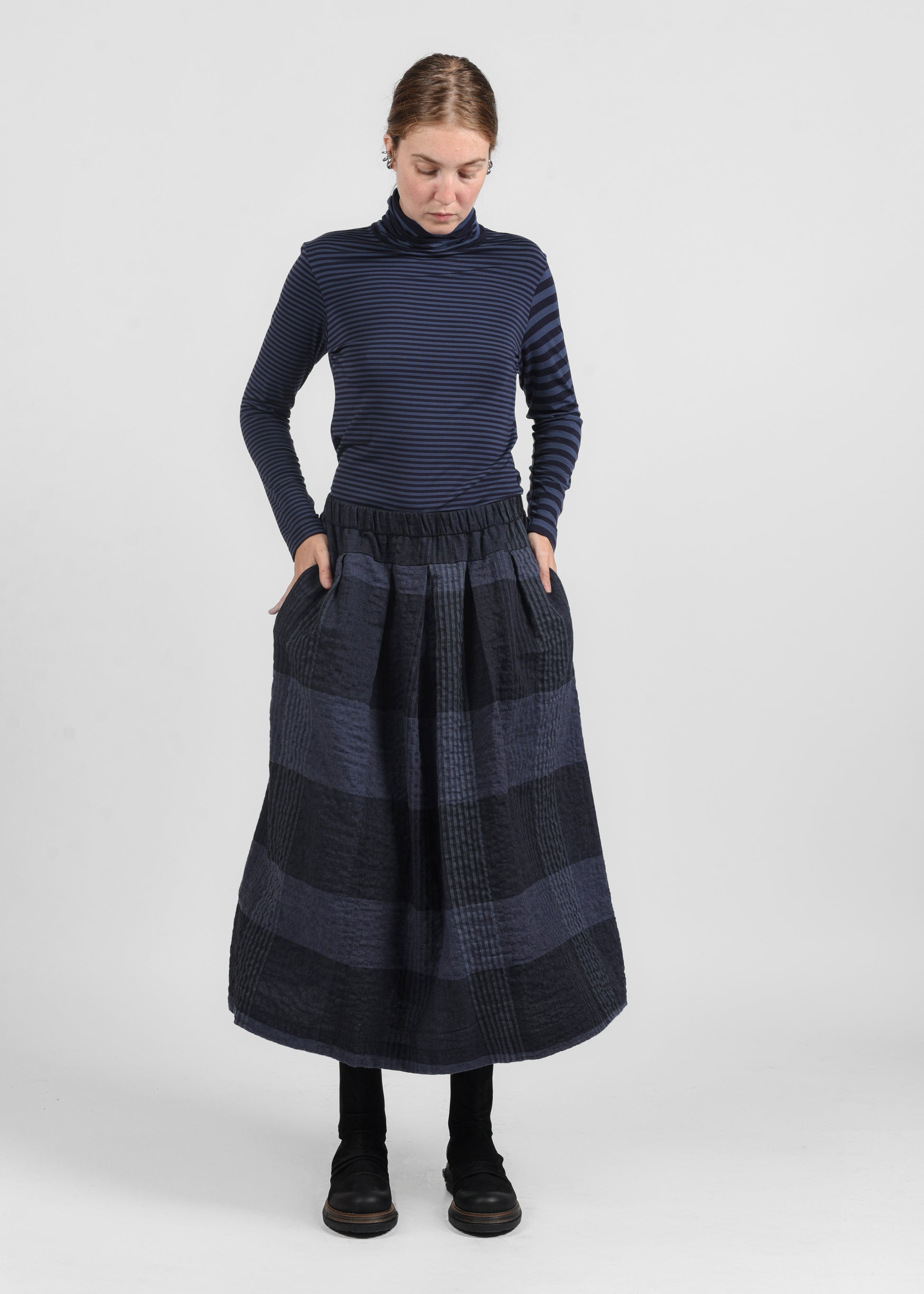 Gonna ampia MIDI con elastico in vita, caratterizzata da una fantasia check. Linea morbida e fluida per comfort e stile casual chic. Realizzata in 99% cotone e 1% elastan, garantisce vestibilità e comfort durante tutta la giornata.