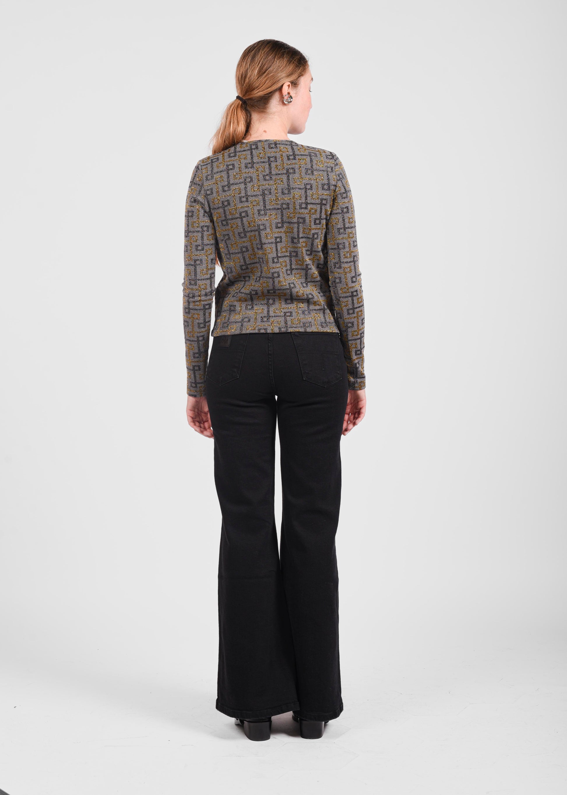 Jeans a vita alta, dal taglio asciutto nella parte superiore e scampanato sul fondo, per una silhouette slanciata ed elegante. La lunghezza lunga lo rende perfetto da abbinare a tacchi o stivali.