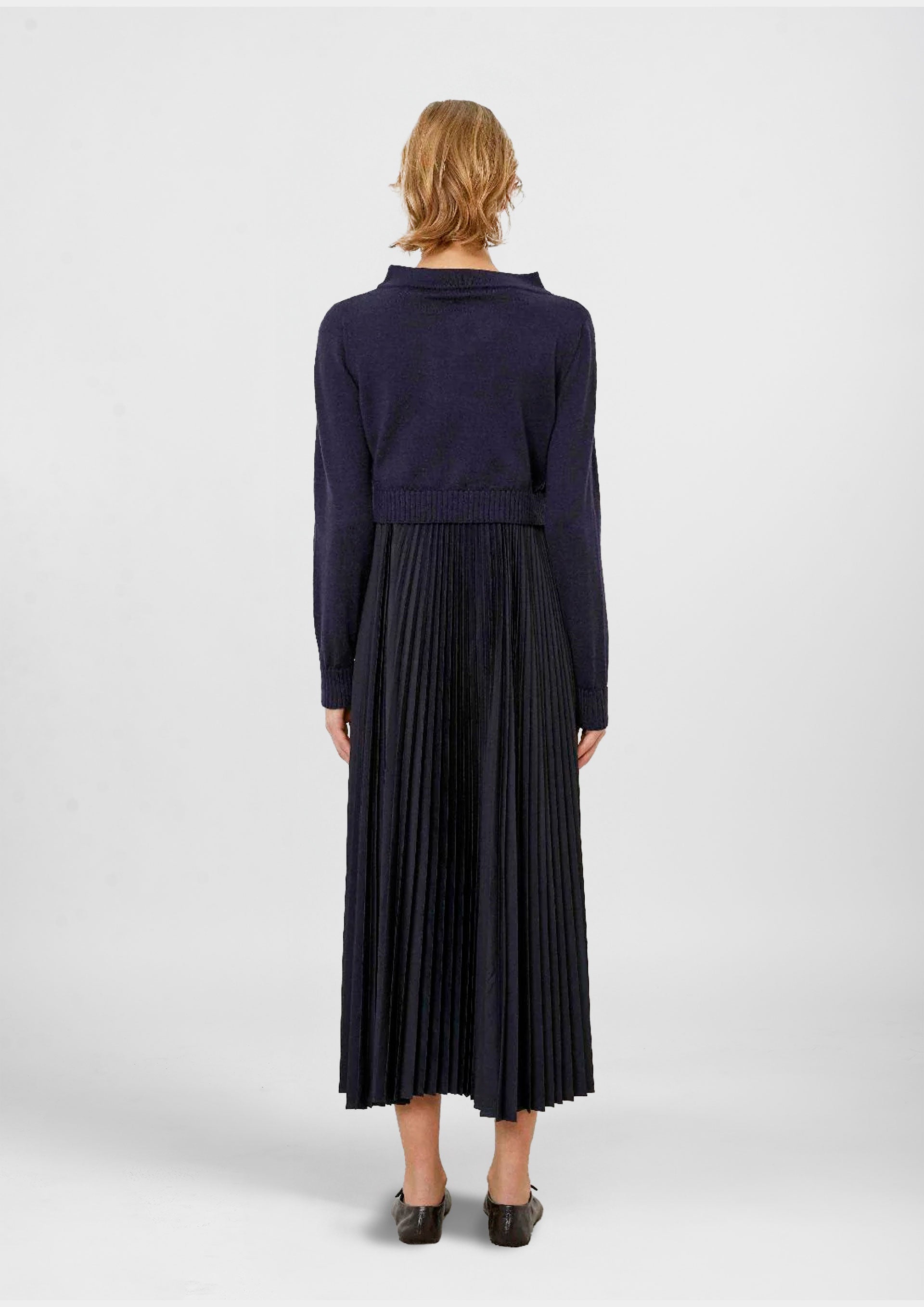 Completo composto da vestito lungo plissé con bretelle regolabili e maglia crop a manica lunga abbinata. La maglia è realizzata in 100% lana vergine, mentre l’abito è confezionato in 100% poliestere. Un look elegante e contemporaneo che unisce praticità e stile.
