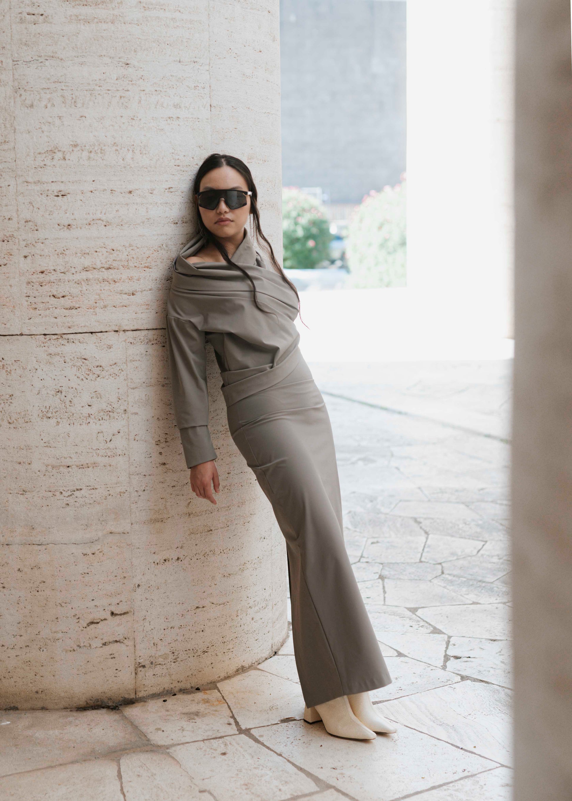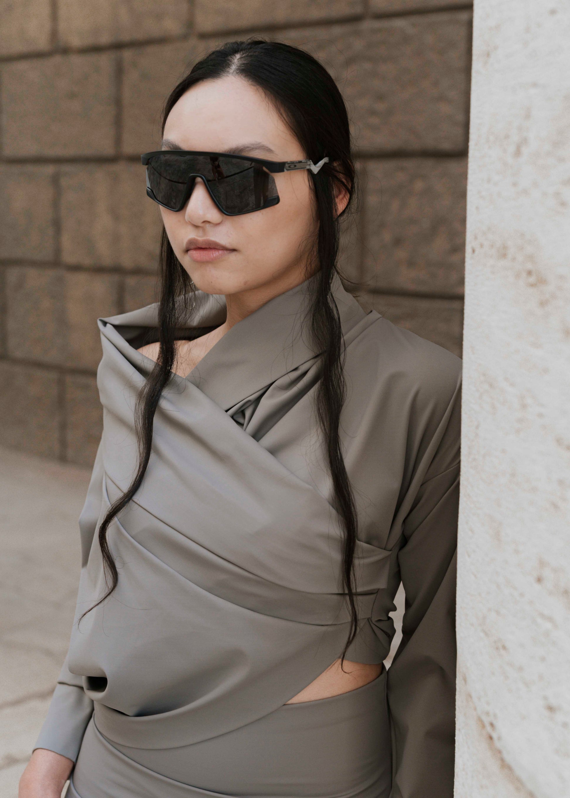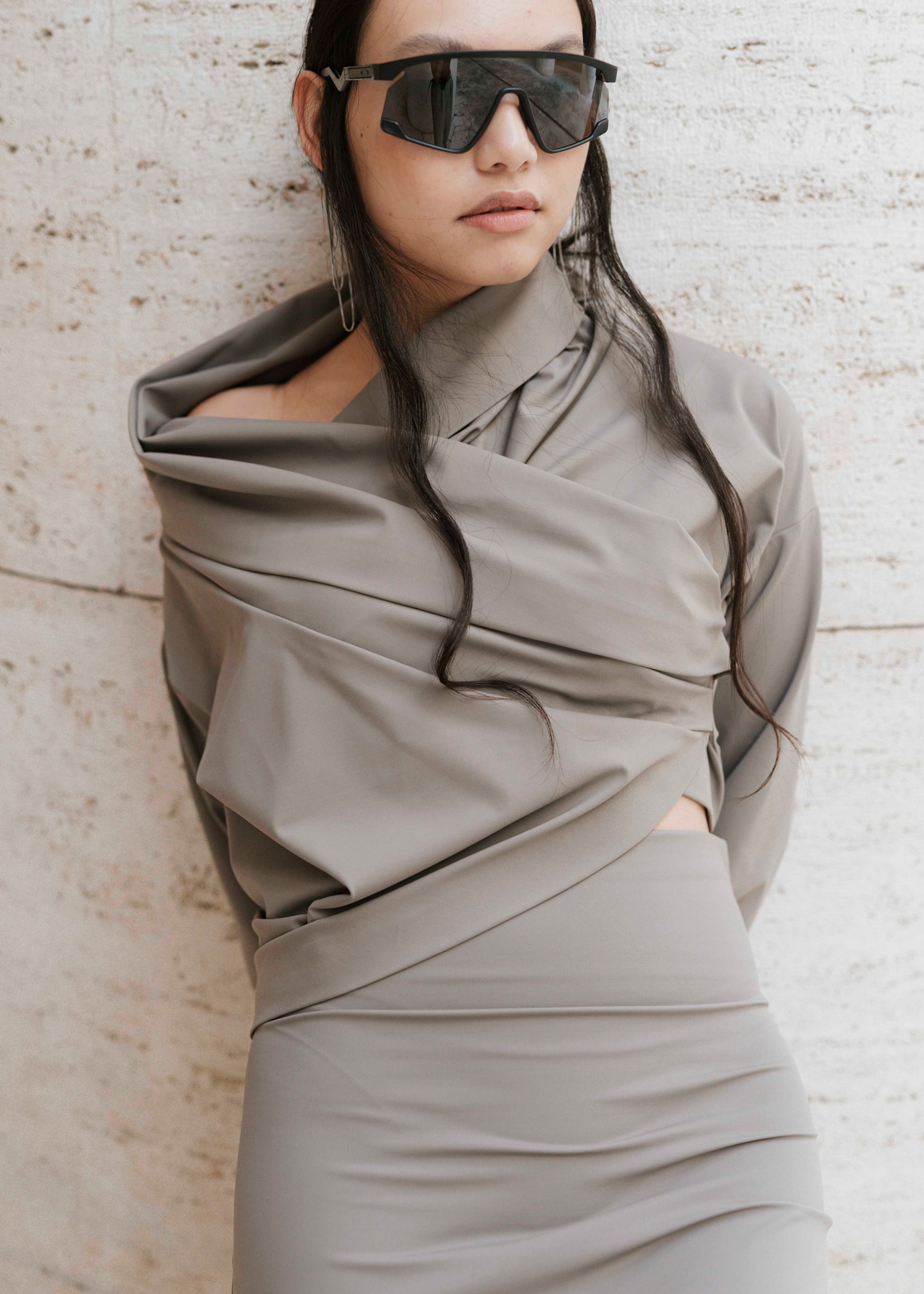 Maglia irregolare con scollo a V e collo arricciata sui fianchi. Composizione: 85% poliammide, 15% elastan.