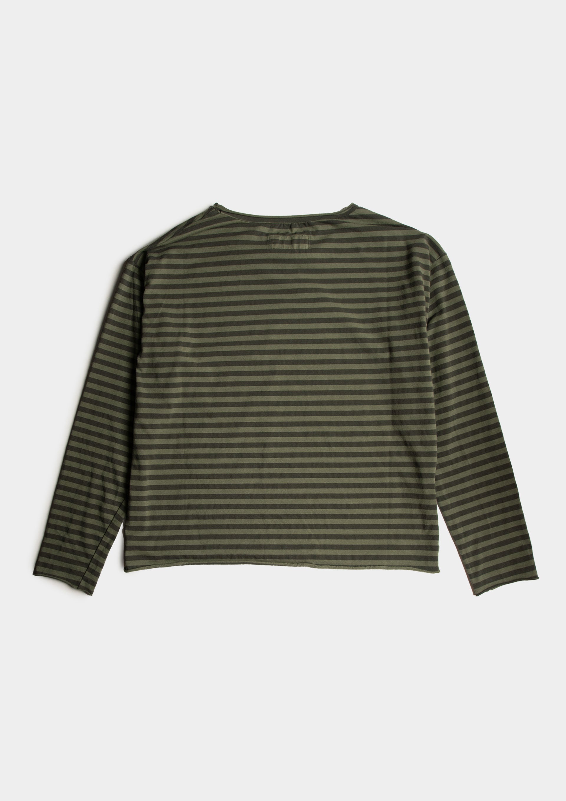 T-shirt dal taglio a scatola, girocollo con finiture a taglio vivo, fantasia a righe.