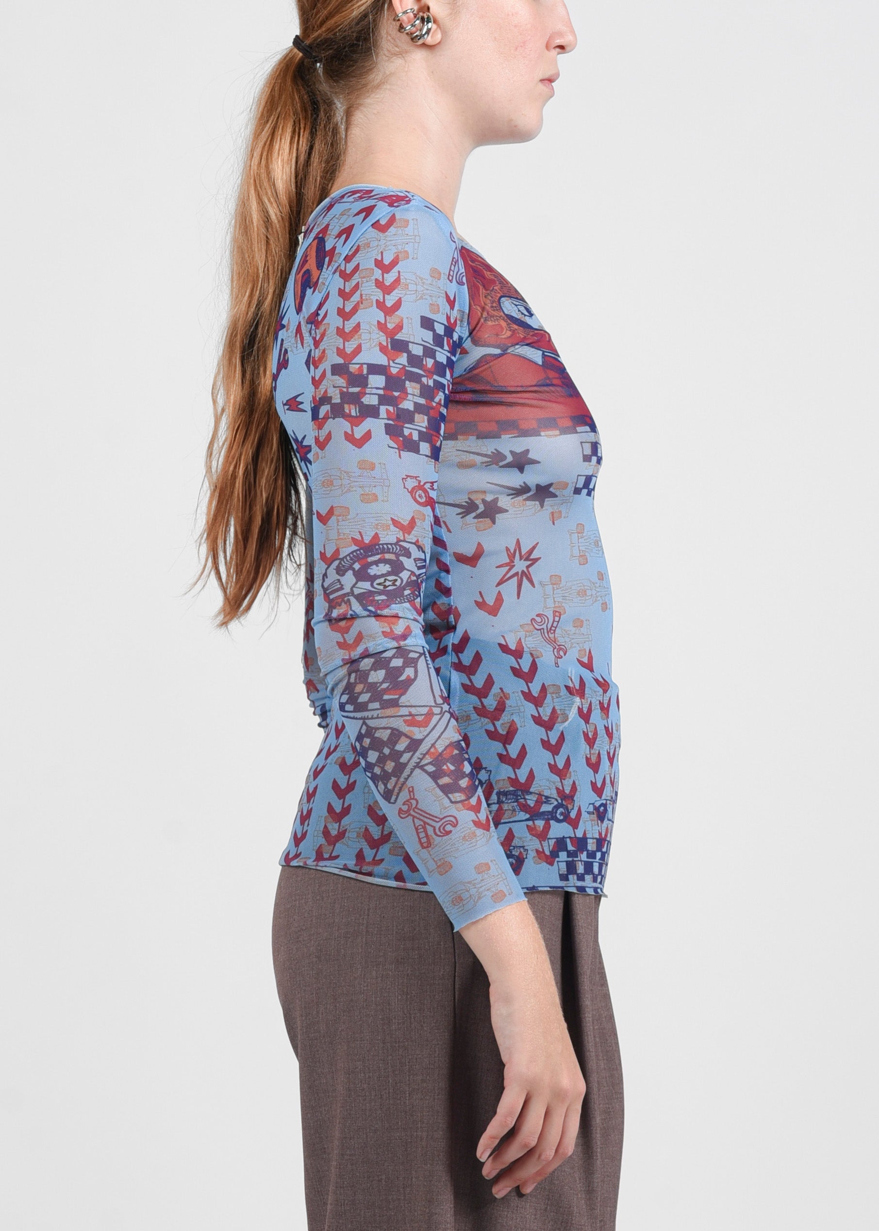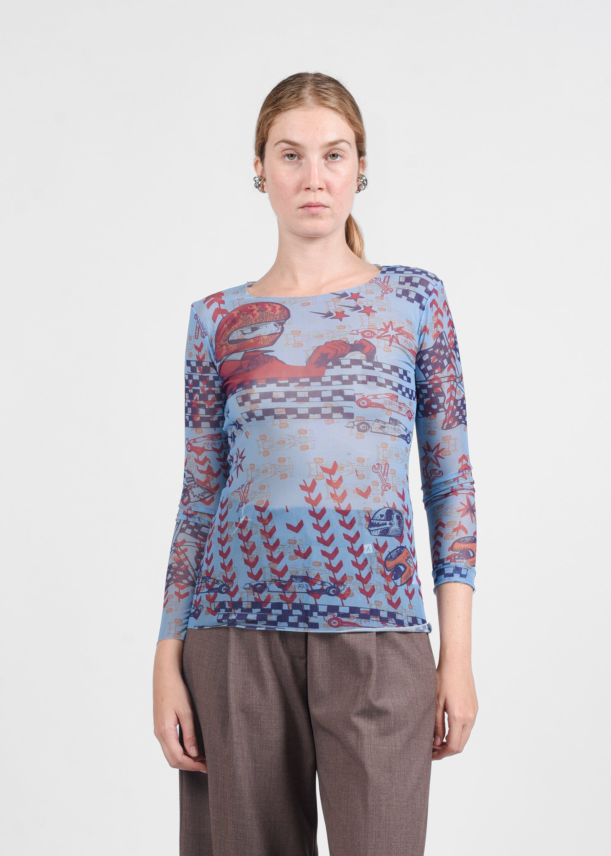 Maglia realizzata in tulle stampato, semi-trasparente e morbidissima, con scollo girocollo ampio e fit aderente. Un capo leggero e sofisticato, ideale per look contemporanei e di tendenza.