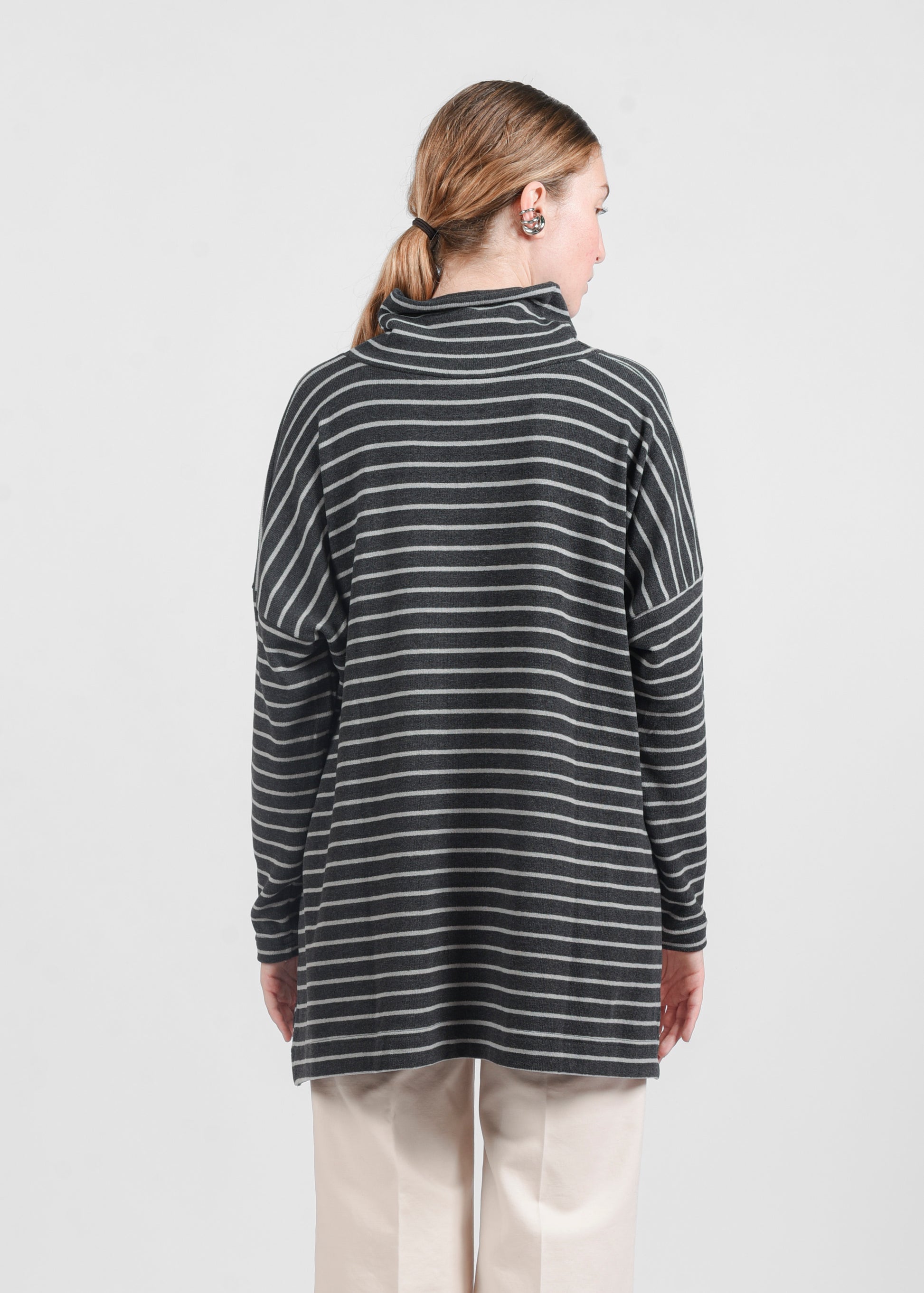 Maglia a collo alto morbido, modello scarola, con spacchetti laterali e fantasia a righe sul retro. La parte posteriore è leggermente più lunga rispetto al davanti, con spalle ascesa per un fit moderno e confortevole. Realizzata in 48% cotone, 48% poliestere e 4% elastan