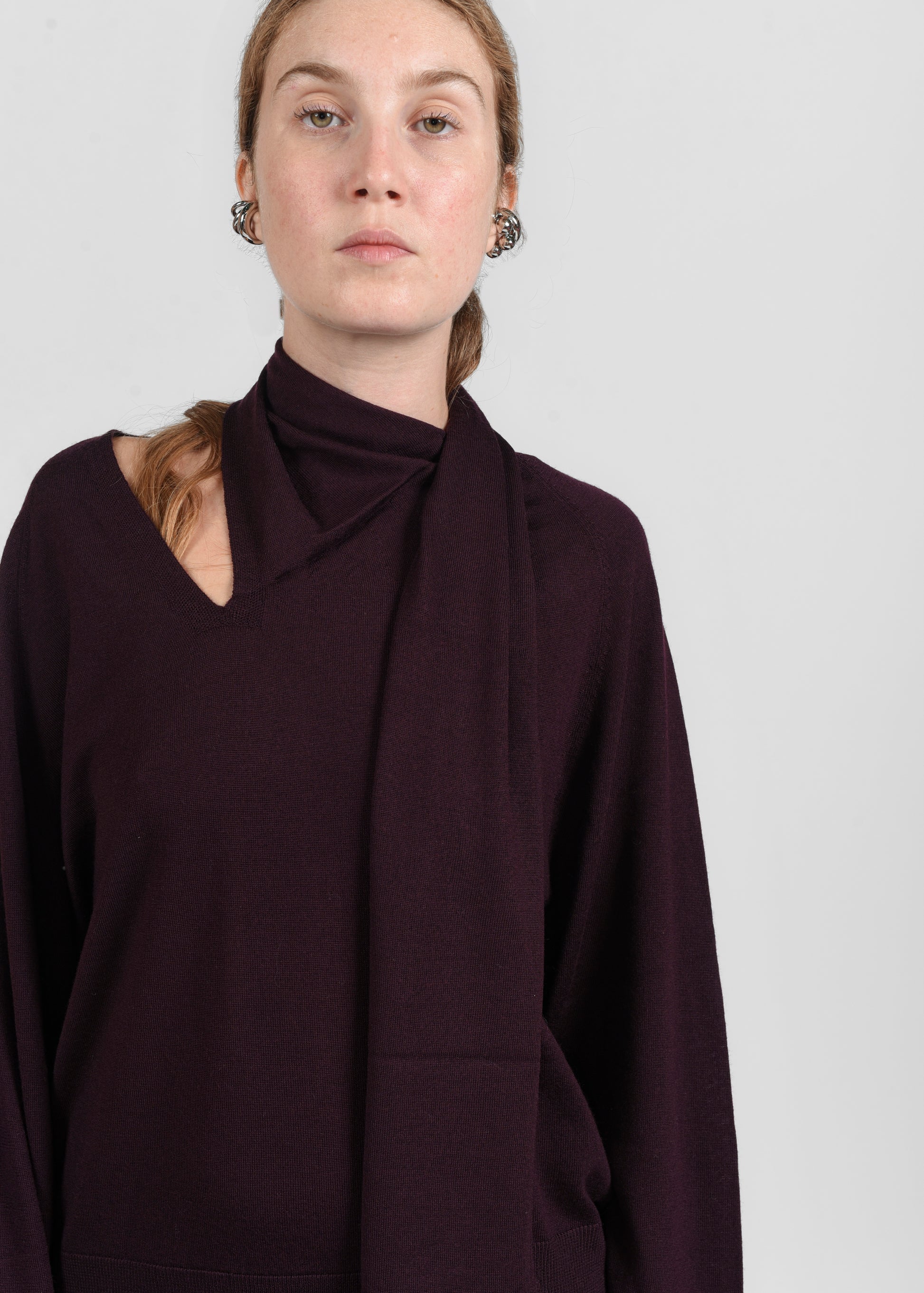 Un maglione versatile e sofisticato, impreziosito da una sciarpa integrata che permette di trasformarlo con un semplice gesto: da uno scollo a V essenziale a un dolcevita avvolgente.