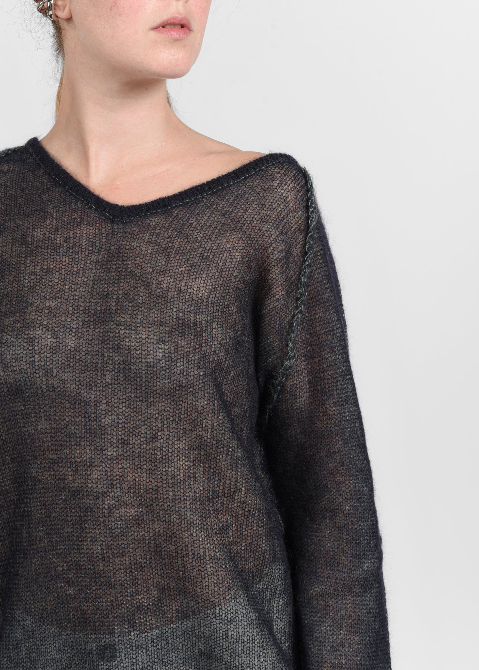 Lo scollo a V valorizza la linea del collo, mentre l’effetto mélange dona profondità e movimento al tessuto.