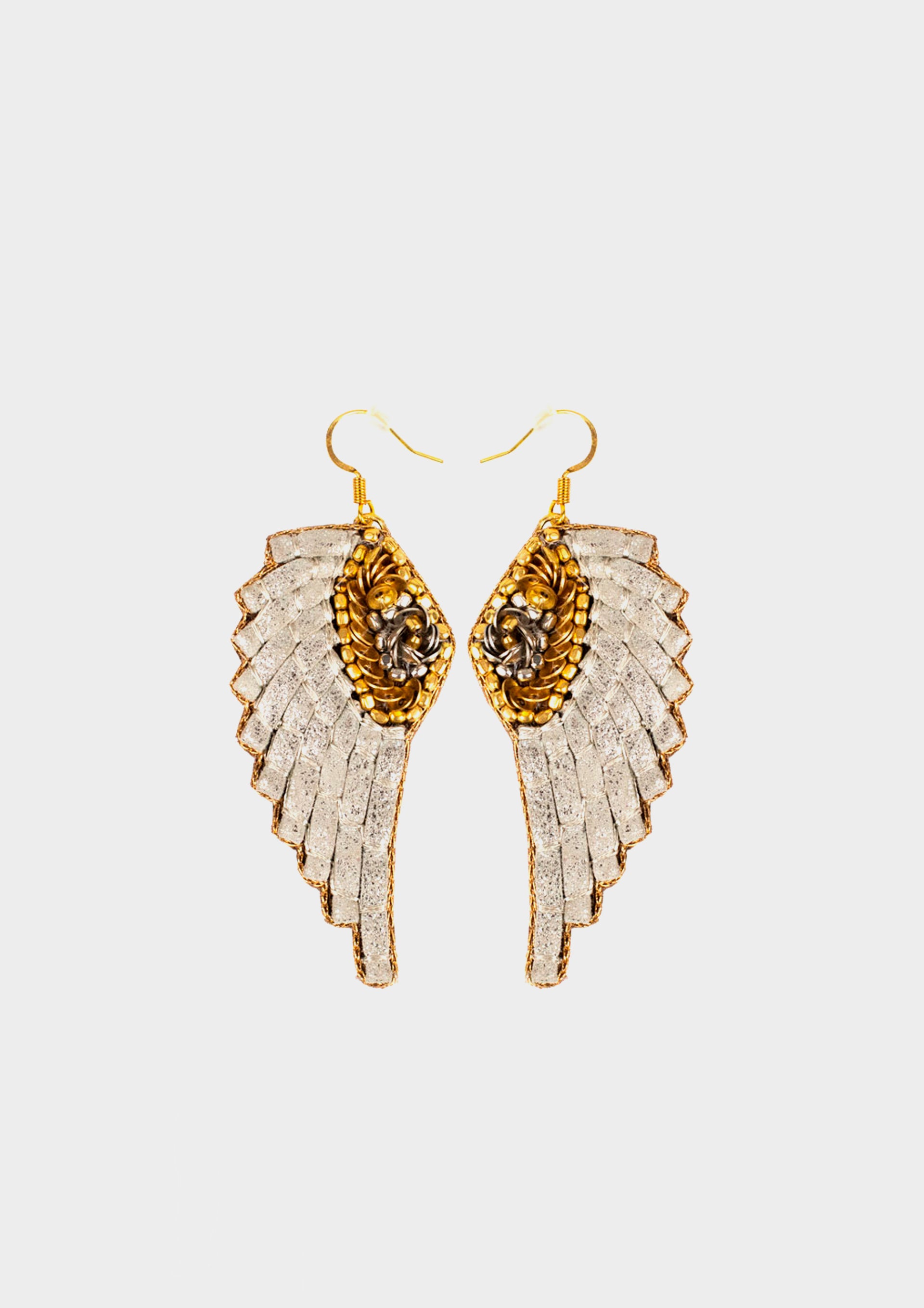 Orecchini ricamati a mano con filo di seta e sottili strisce di pelle, a forma di ali d'angelo. Fodera in pelle e gancio in acciaio inossidabile.