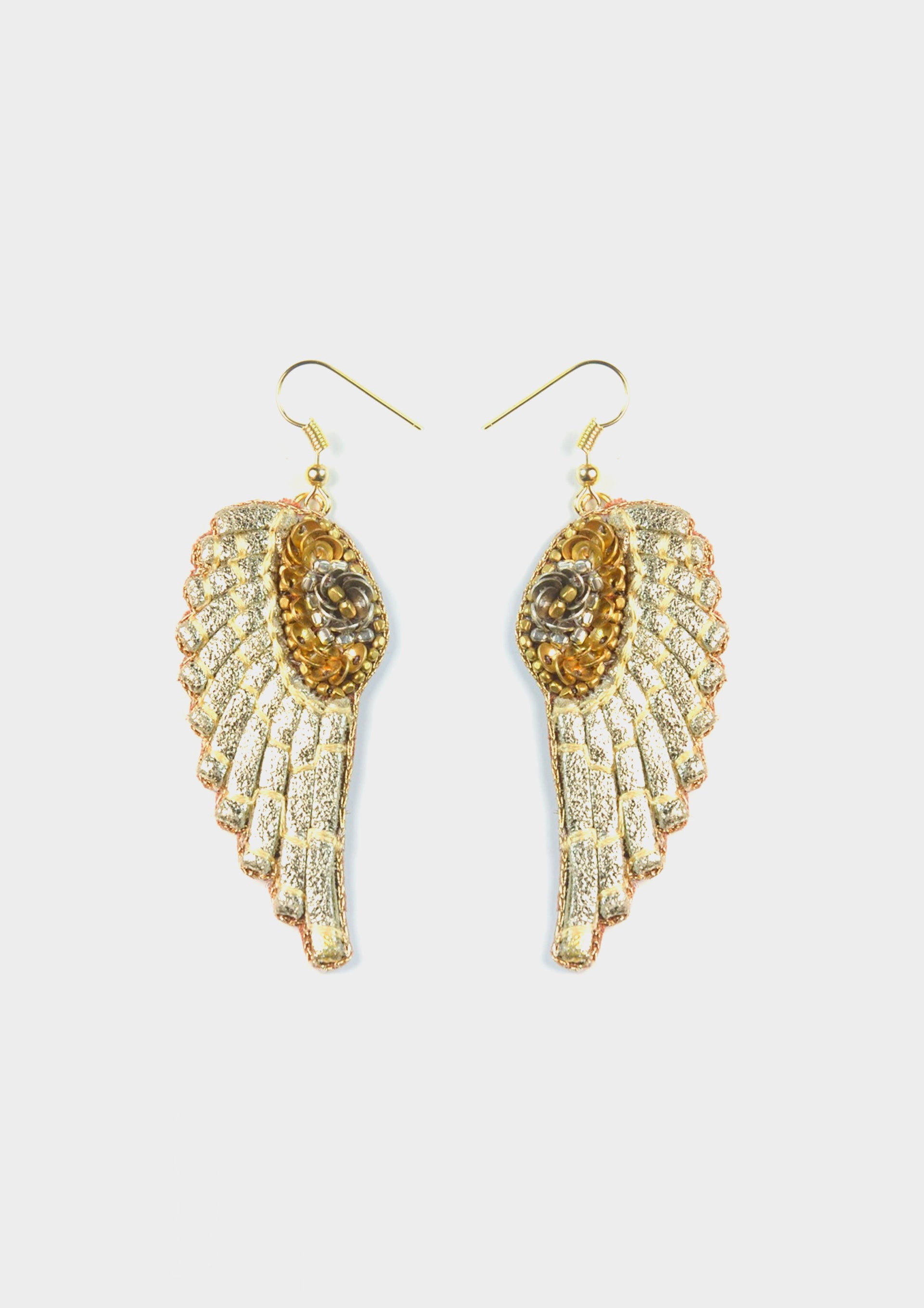Orecchini ricamati a mano con filo di seta e sottili strisce di pelle, a forma di ali d'angelo. Fodera in pelle e gancio in acciaio inossidabile.