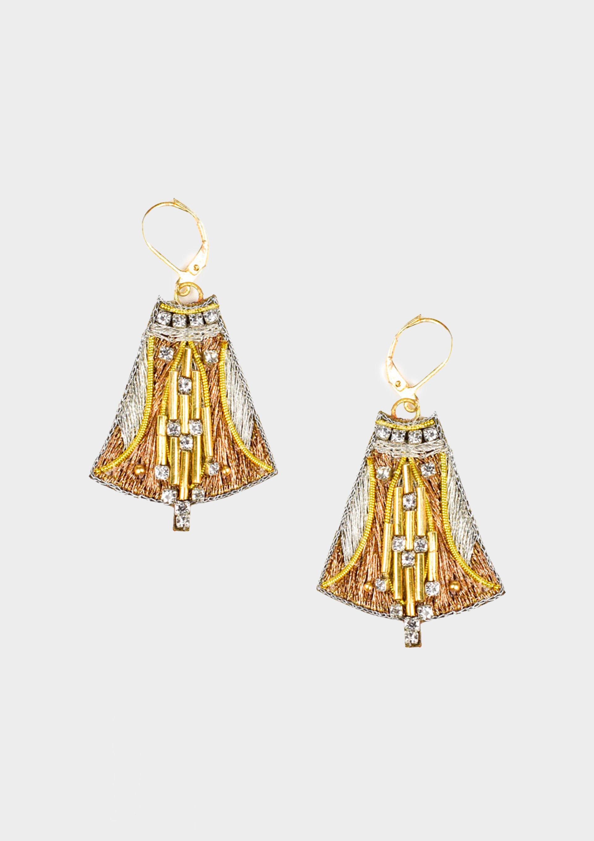 Orecchini metallici ricamati a mano con filo metallico. Perline e strass in ottone, fodera in morbida pelle, ganci in acciaio inox e ottone antiallergico.