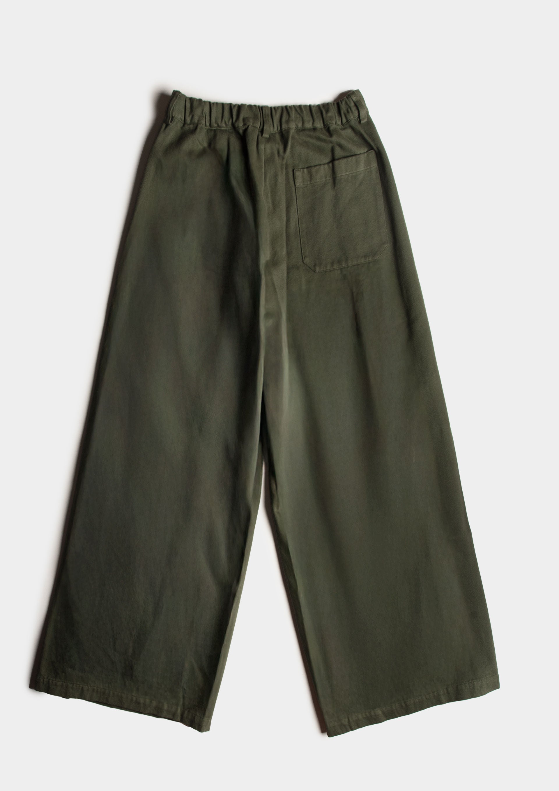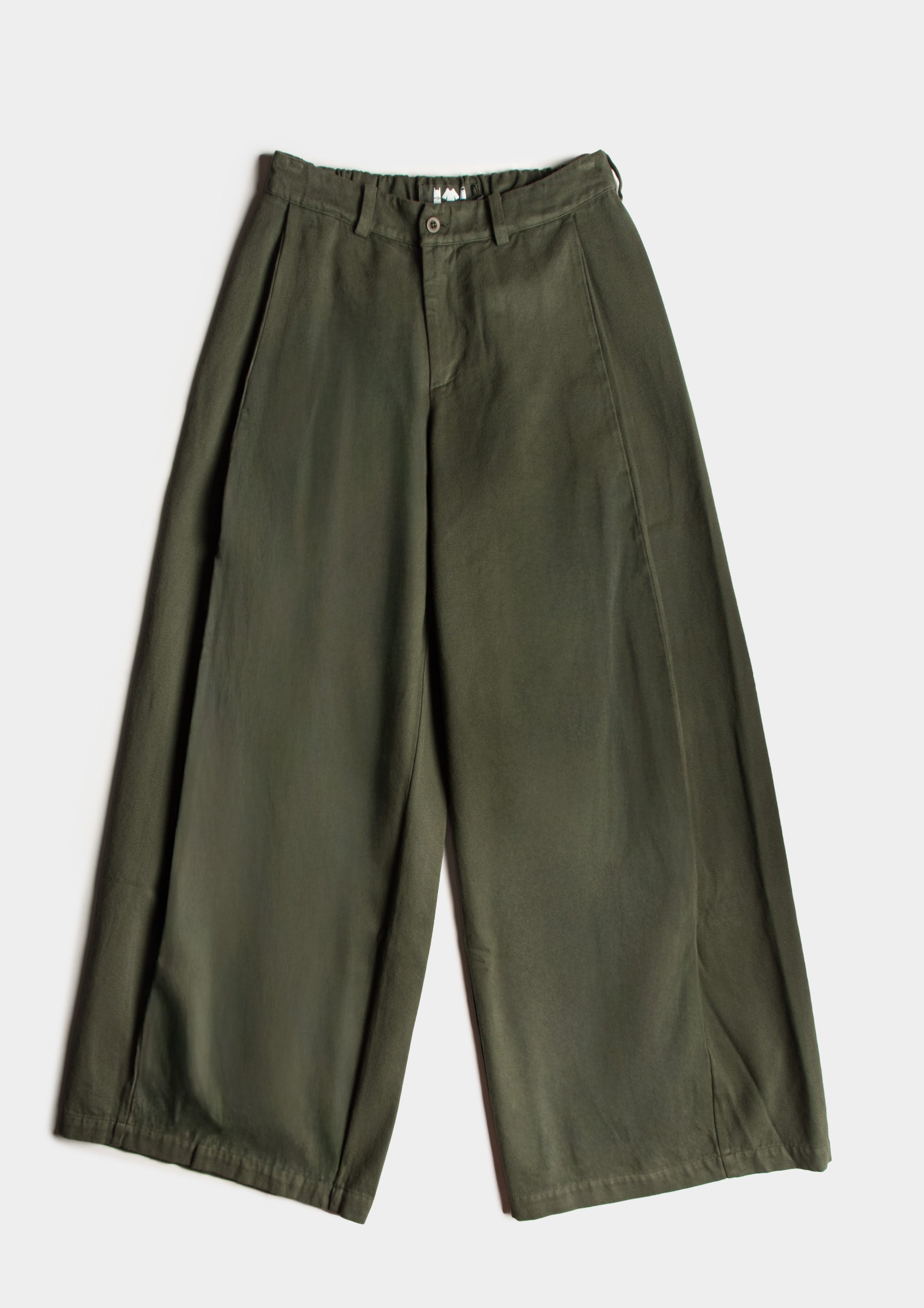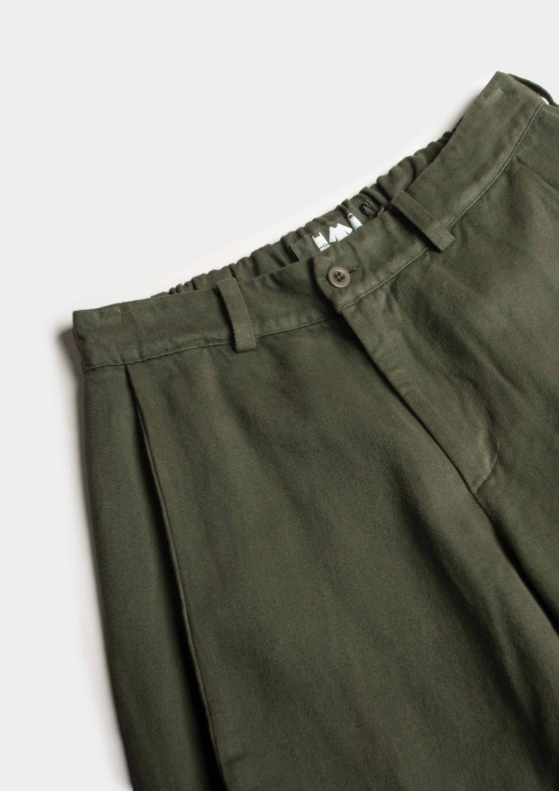 Pantalone palazzo con elastico in vita sul retro, tasche e pinces frontali.