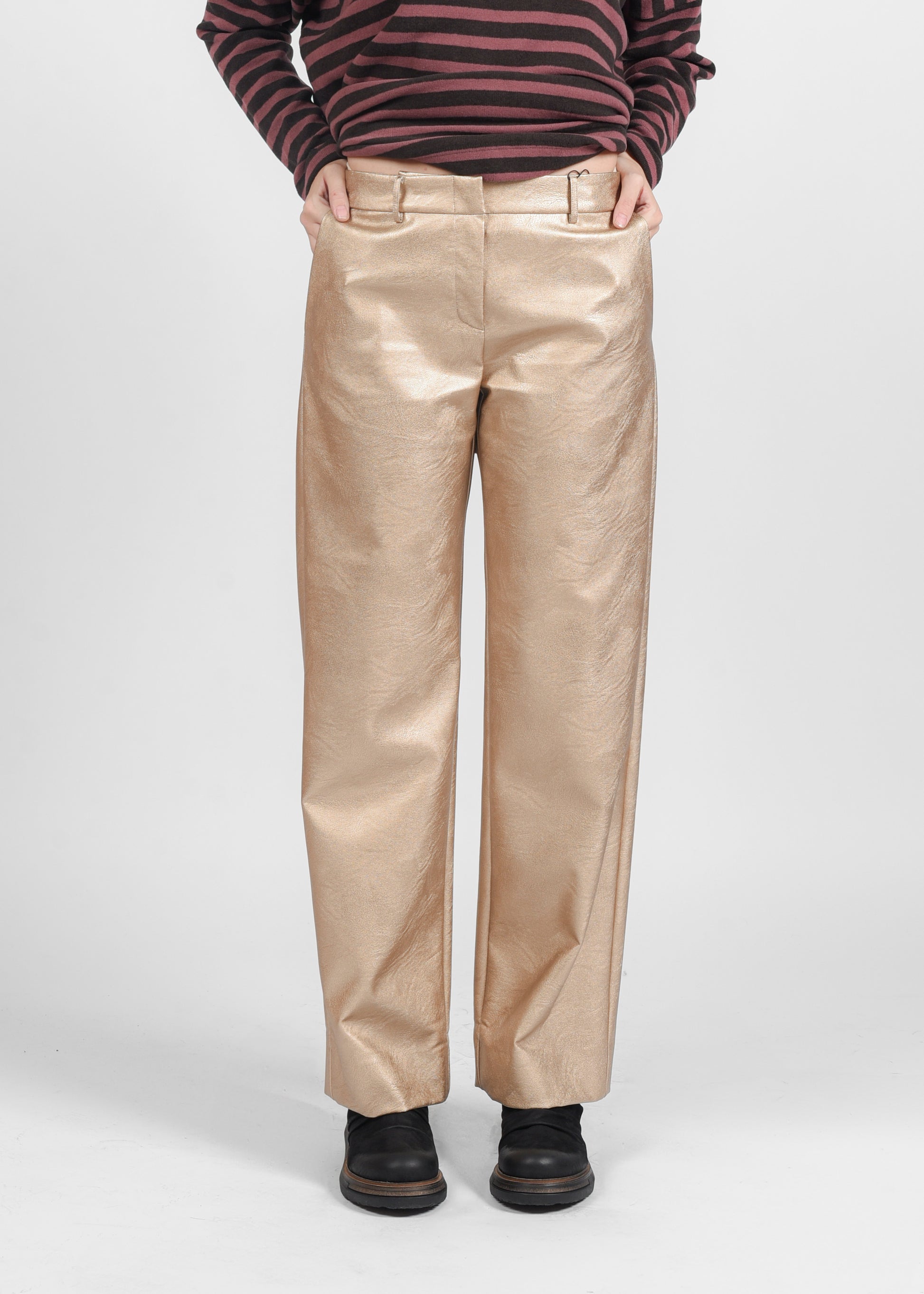 Pantalone dritto in eco-pelle con vestibilità regolare. Presenta due tasche posteriori, passanti in vita e lunghezza fino ai fianchi, per un look contemporaneo e strutturato. Realizzato in 55% viscosa e 45% poliuretano, con fodera interna in 67% poliestere e 33% acetato, garantisce comfort e vestibilità ottimale.