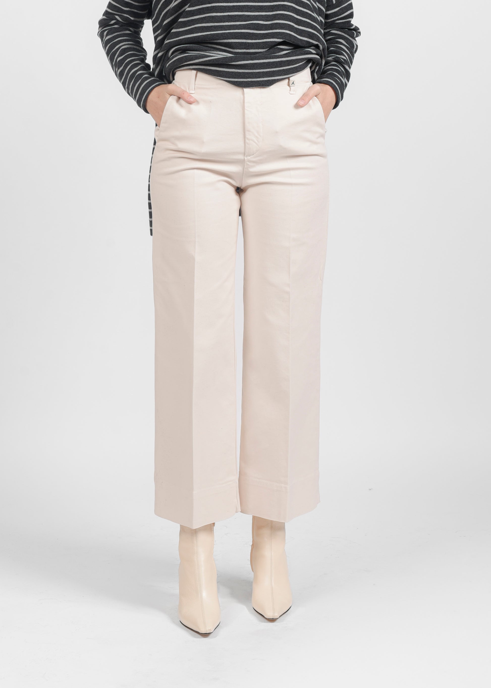 Pantalone dritto con bacchettatura alta sul fondo, tasche laterali e tasca a filo sul retro. Realizzato in 97% cotone e 3% elastan, offre comfort, vestibilità e un tocco elegante, ideale per look raffinati e quotidiani.