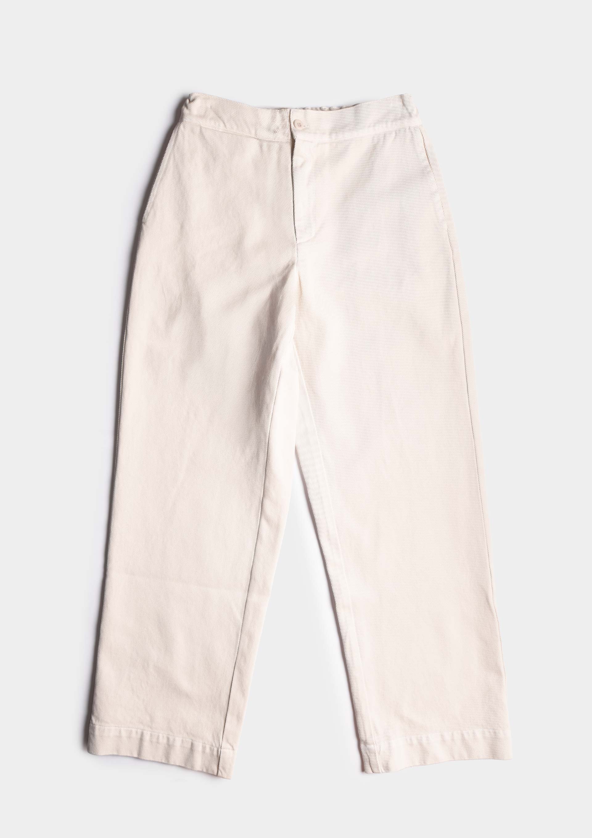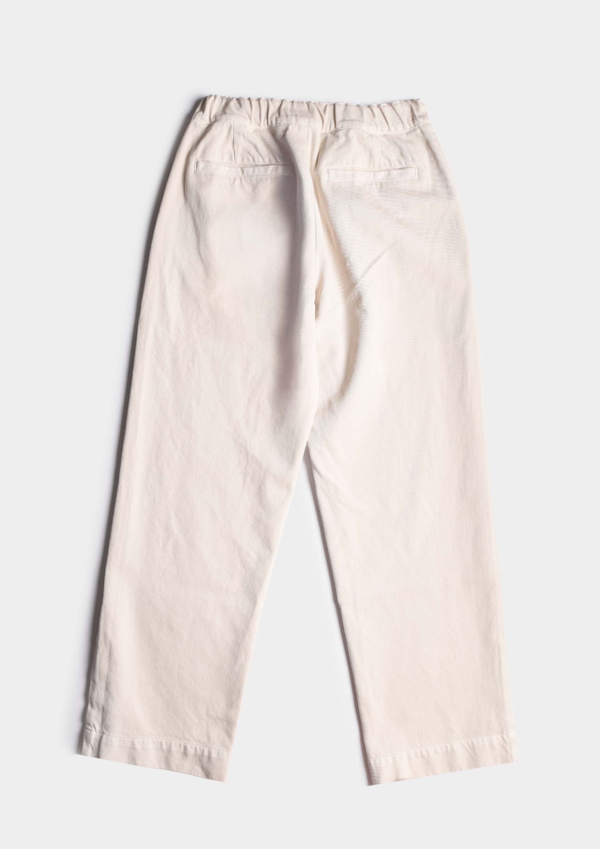 Pantalone con elastico in vita sul retro, tasche frontali e taschino, gamba dritta. Composizione: 100% cotone.