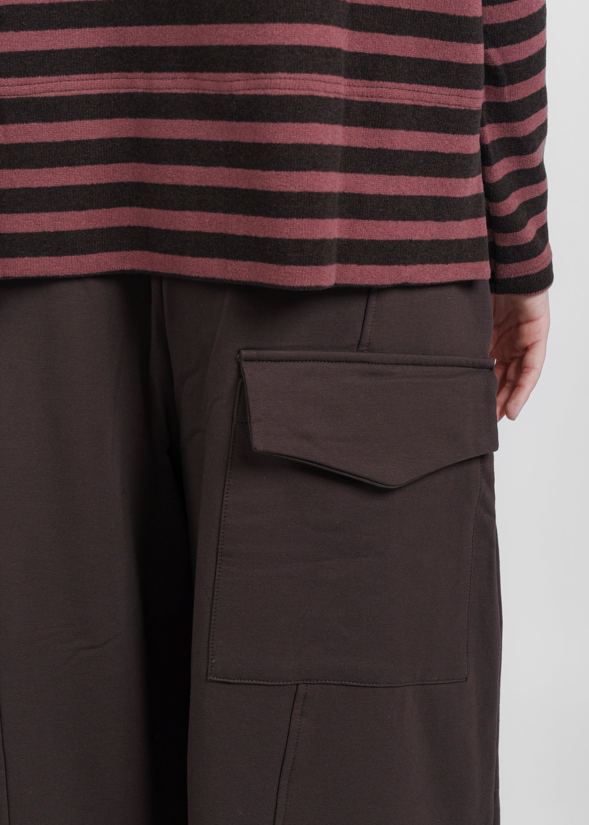 Pantalone modello ovetto, lunghezza al malleolo, con elastico in vita per una vestibilità comoda. Presenta una tasca a patta sul retro della gamba destra. Realizzato in 95% cotone e 5% elastan, offre comfort, elasticità e facilità di movimento.