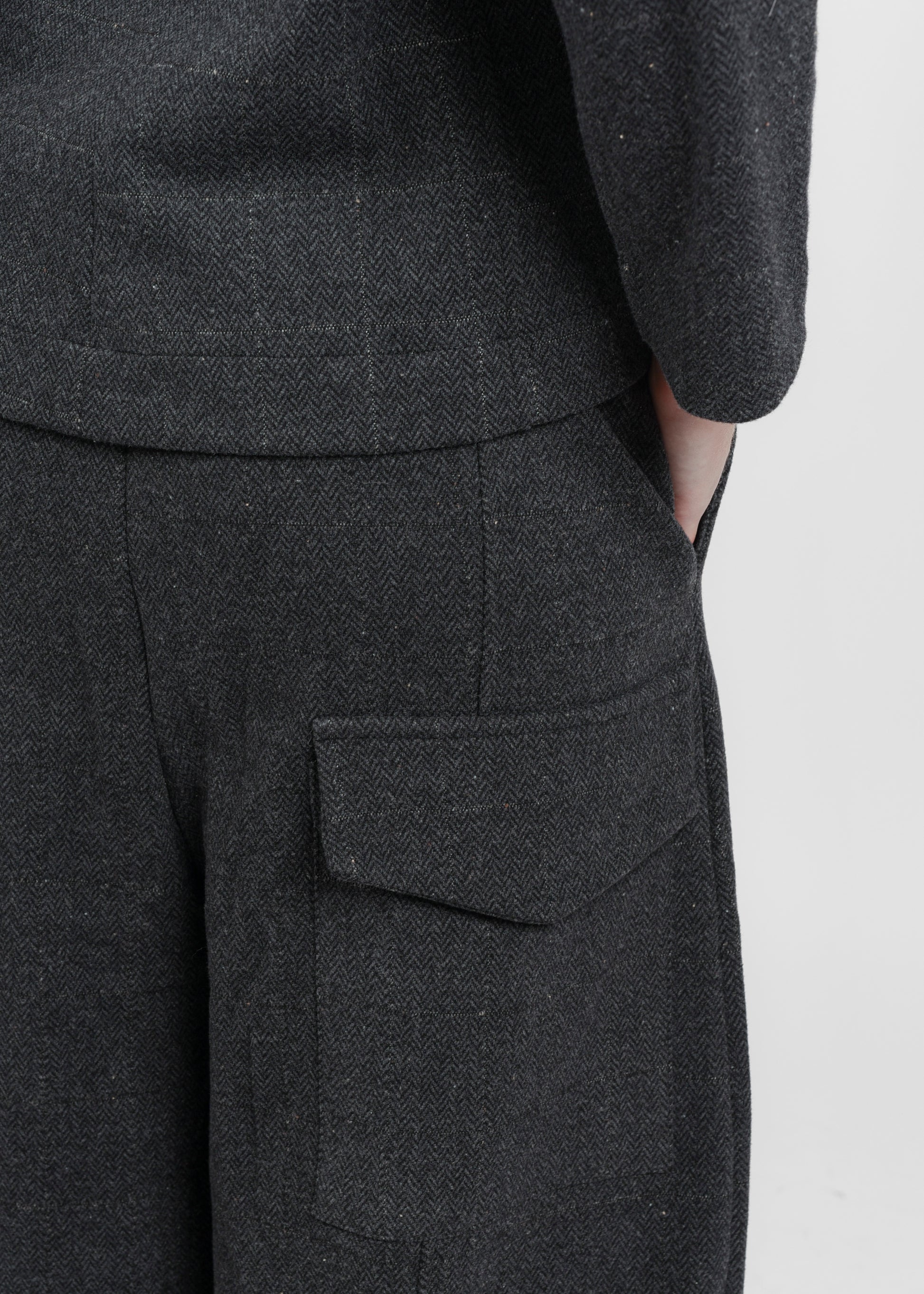 Pantalone modello ovetto, lunghezza al malleolo, con elastico in vita per una vestibilità comoda. Presenta una tasca a patta sul retro della gamba destra e realizzato in tessuto spigato dalla texture raffinata. Composizione: 35% cotone, 35% poliestere, 19% viscosa, 7% poliammide, 2% seta, 2% elastan.