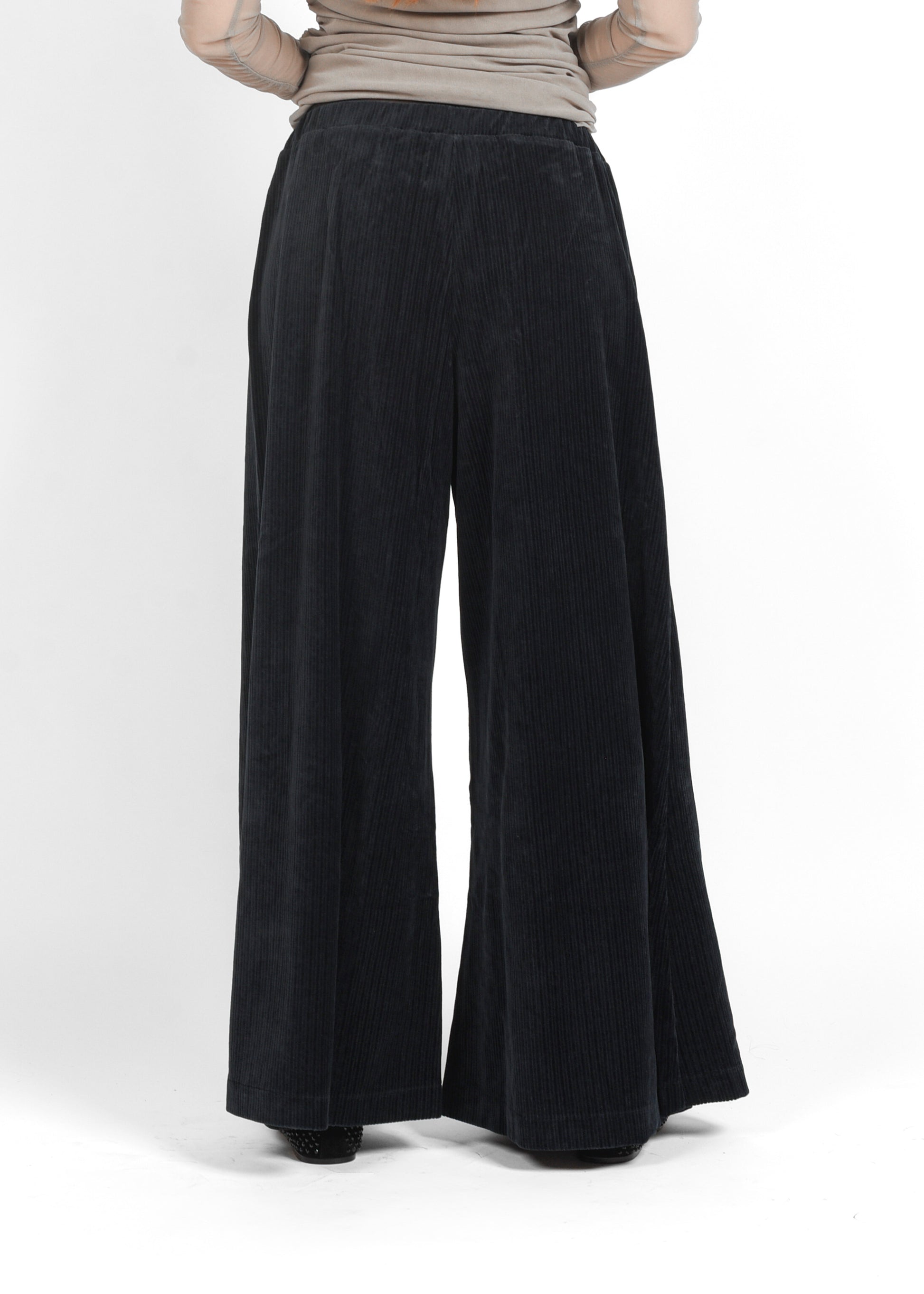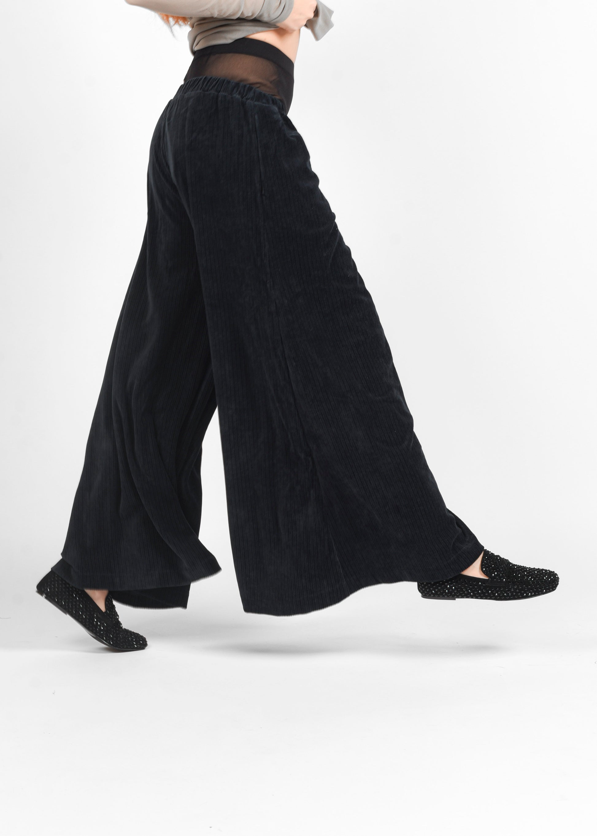Pantalone palazzo con elastico in vita e gamba molto ampia, realizzato in vellutino gessato tono su tono, con tasche laterali.