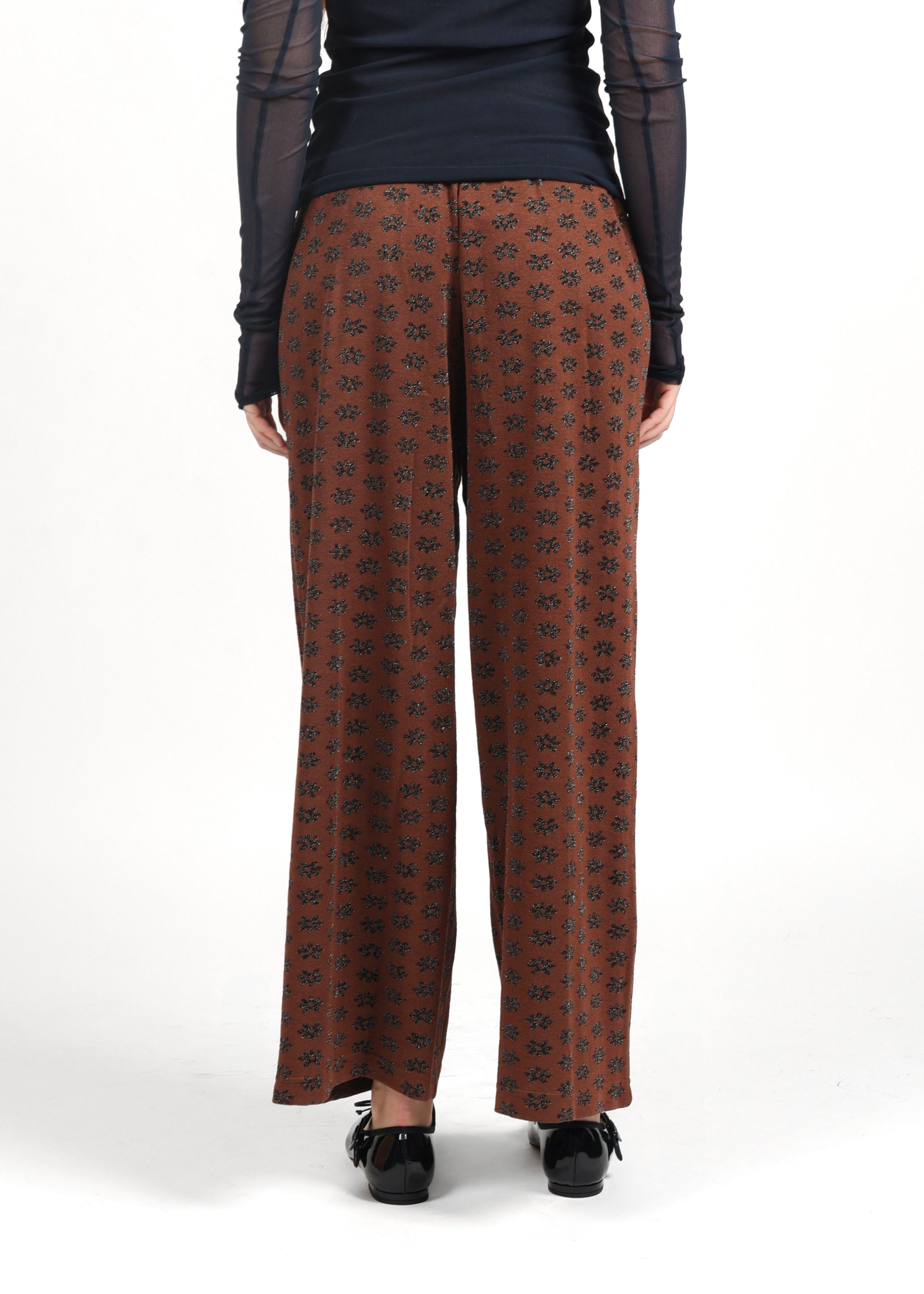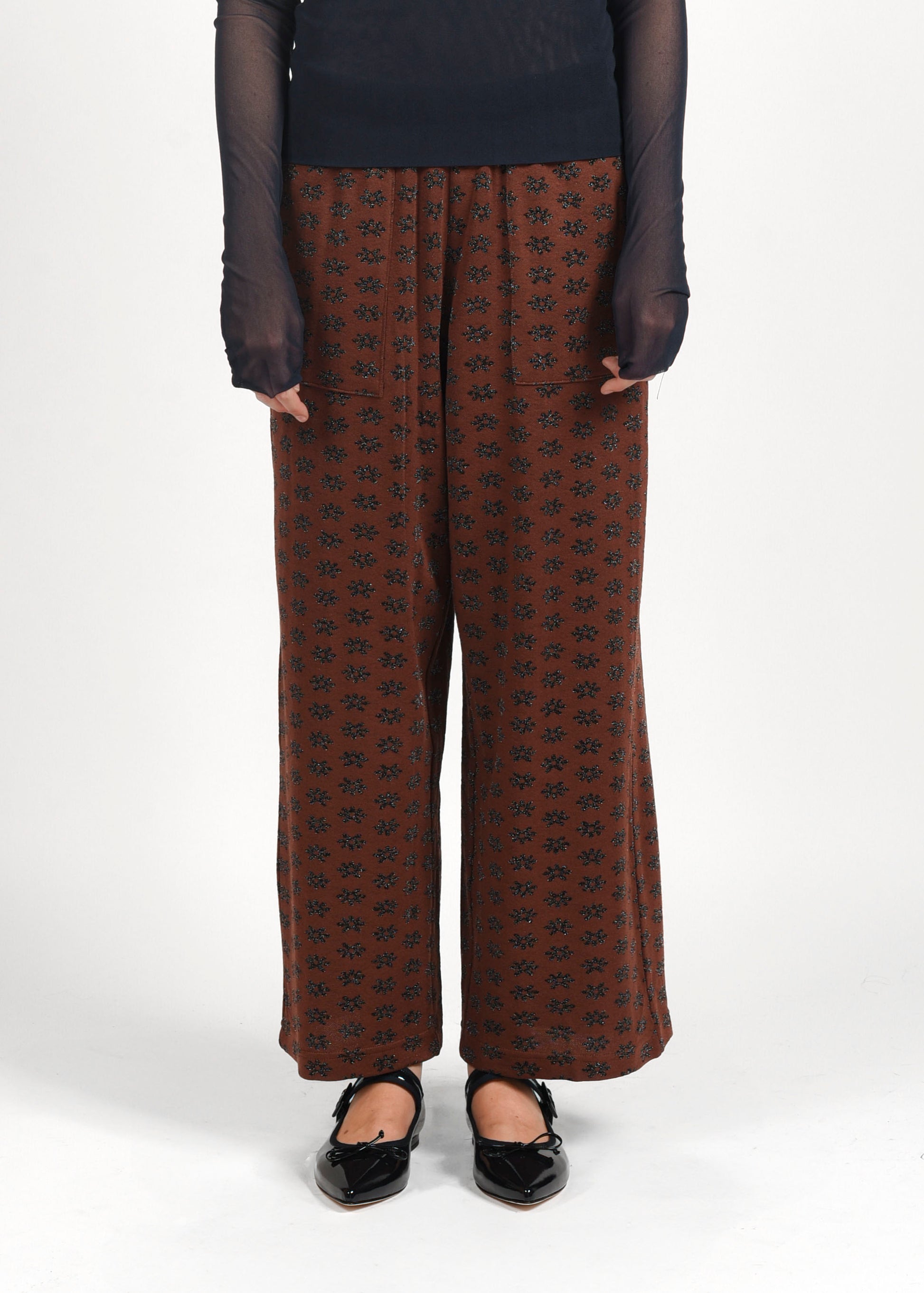 Pantalone a gamba dritta con elastico in vita e tasche frontali, fantasia con dettagli luminosi.