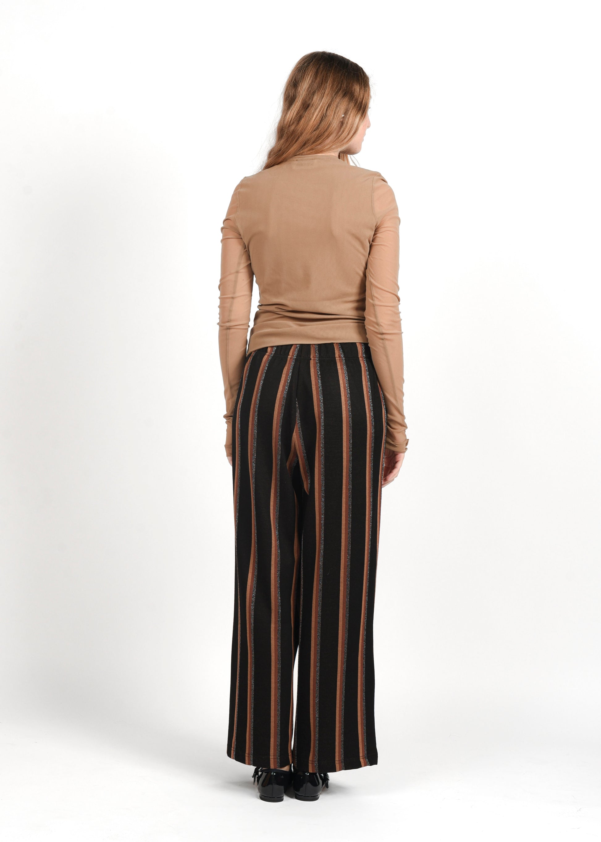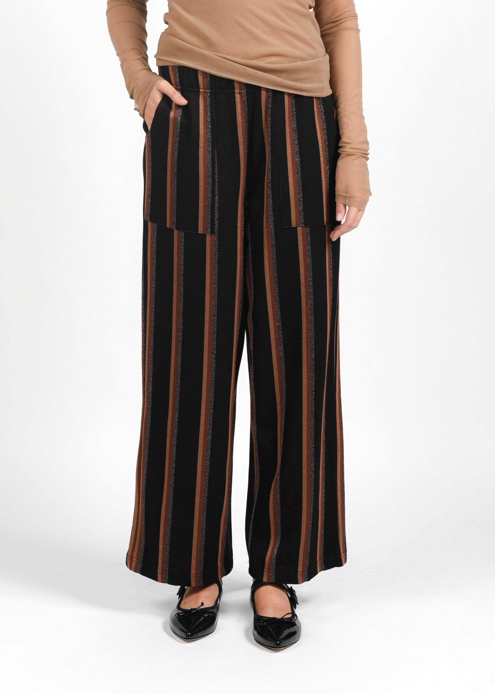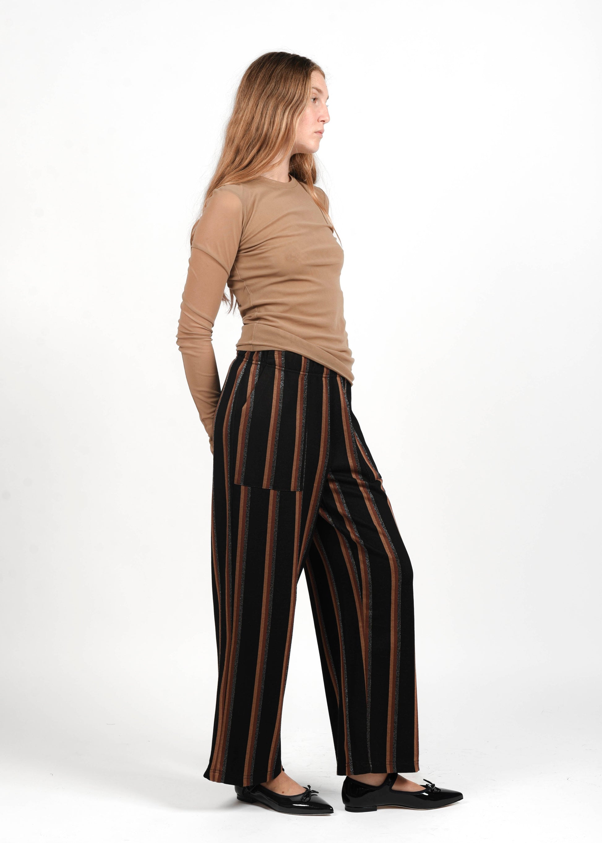 Pantalone a gamba dritta con elastico in vita e tasche frontali, fantasia a righe con dettagli luminosi tra le righe.