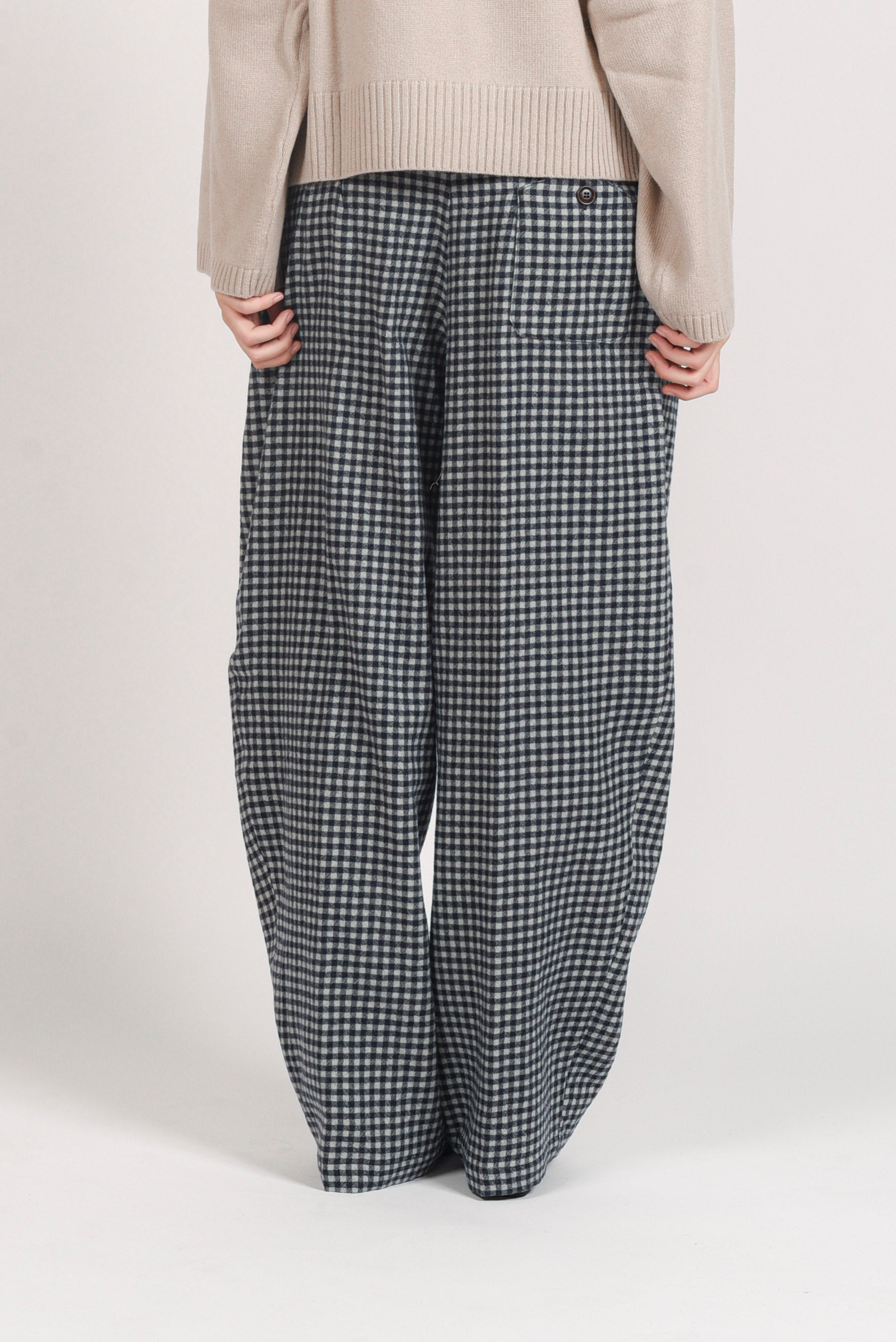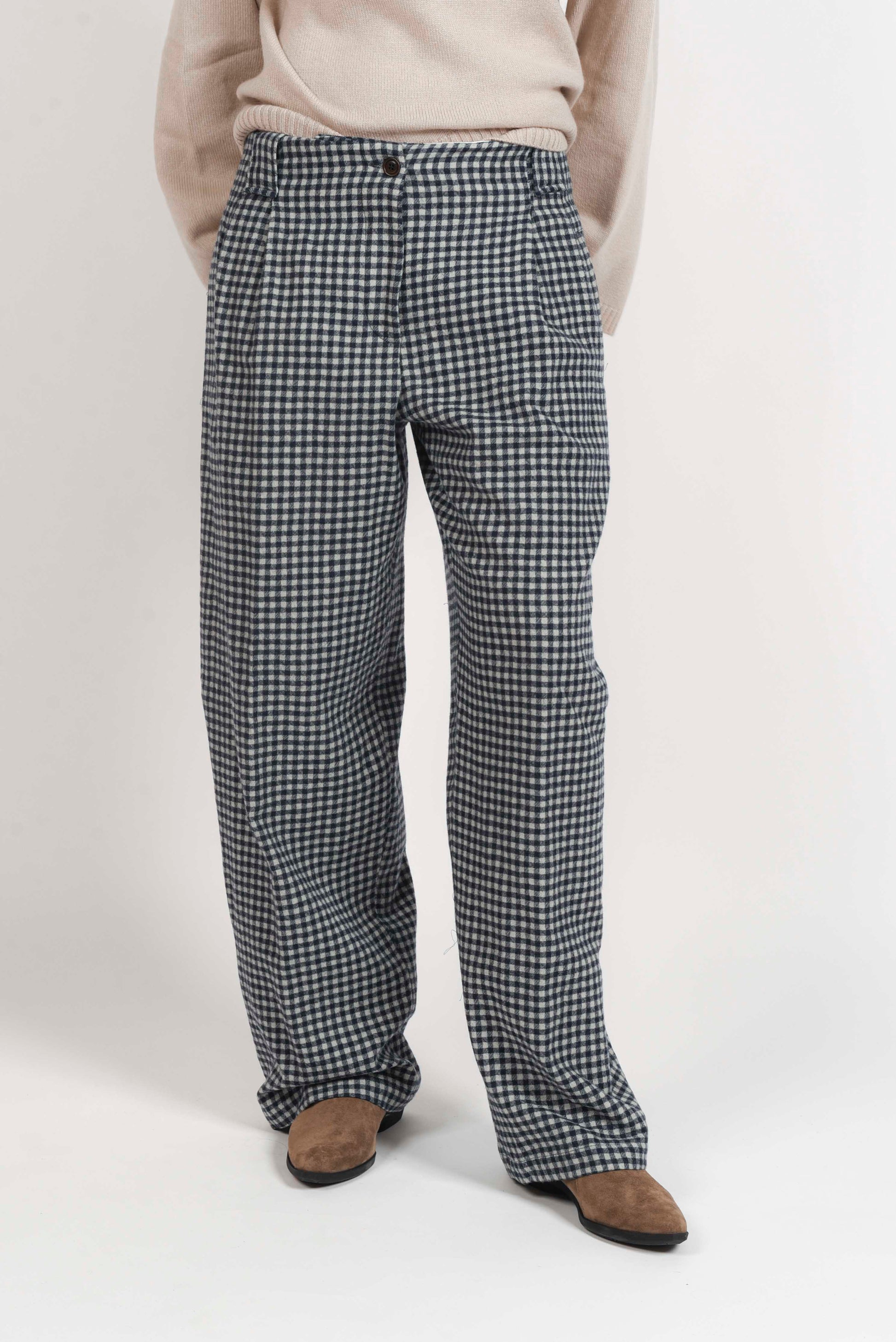 Pantalone modello carota a vita alta, con pence, tasche a filo e fantasia a quadri.