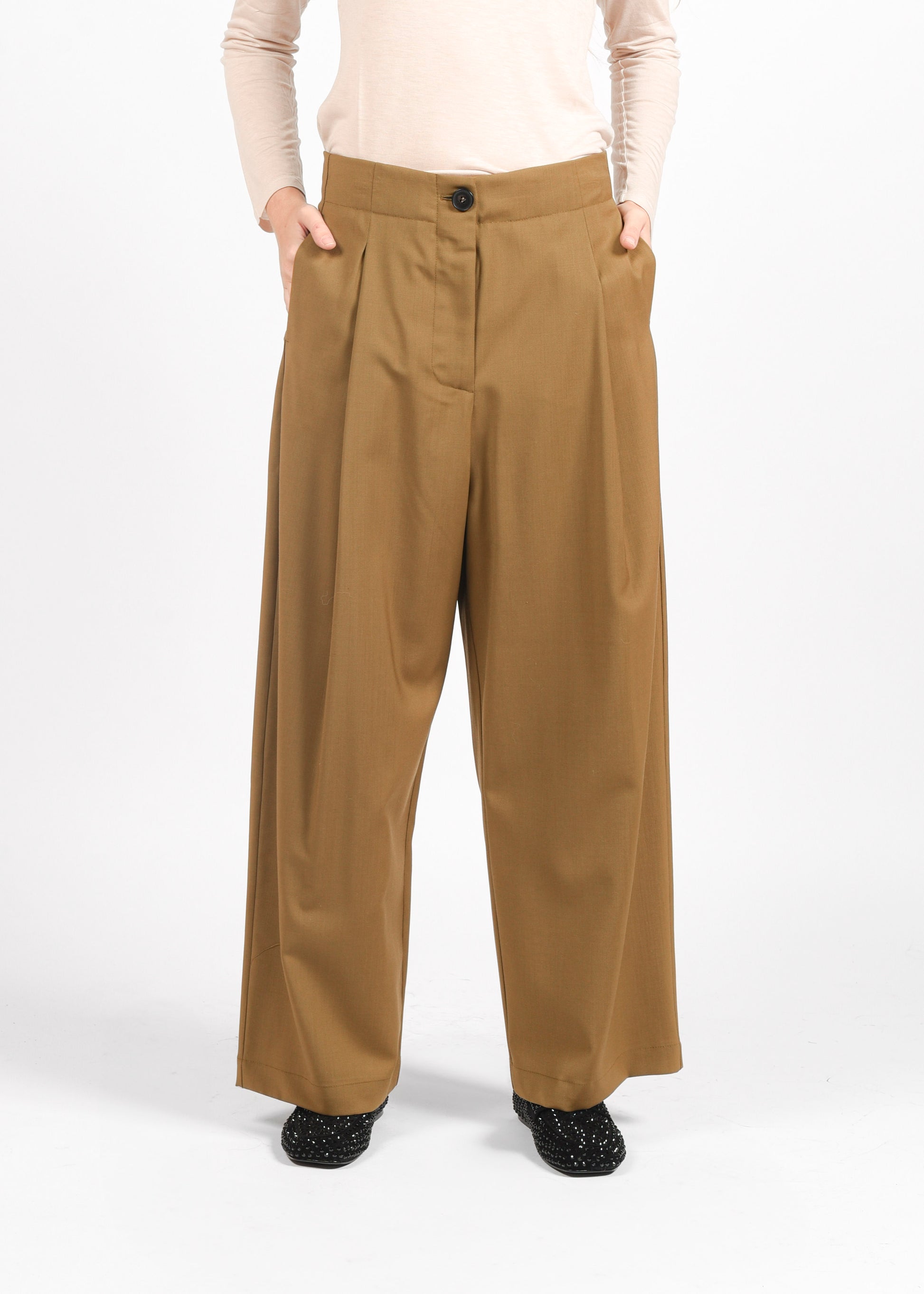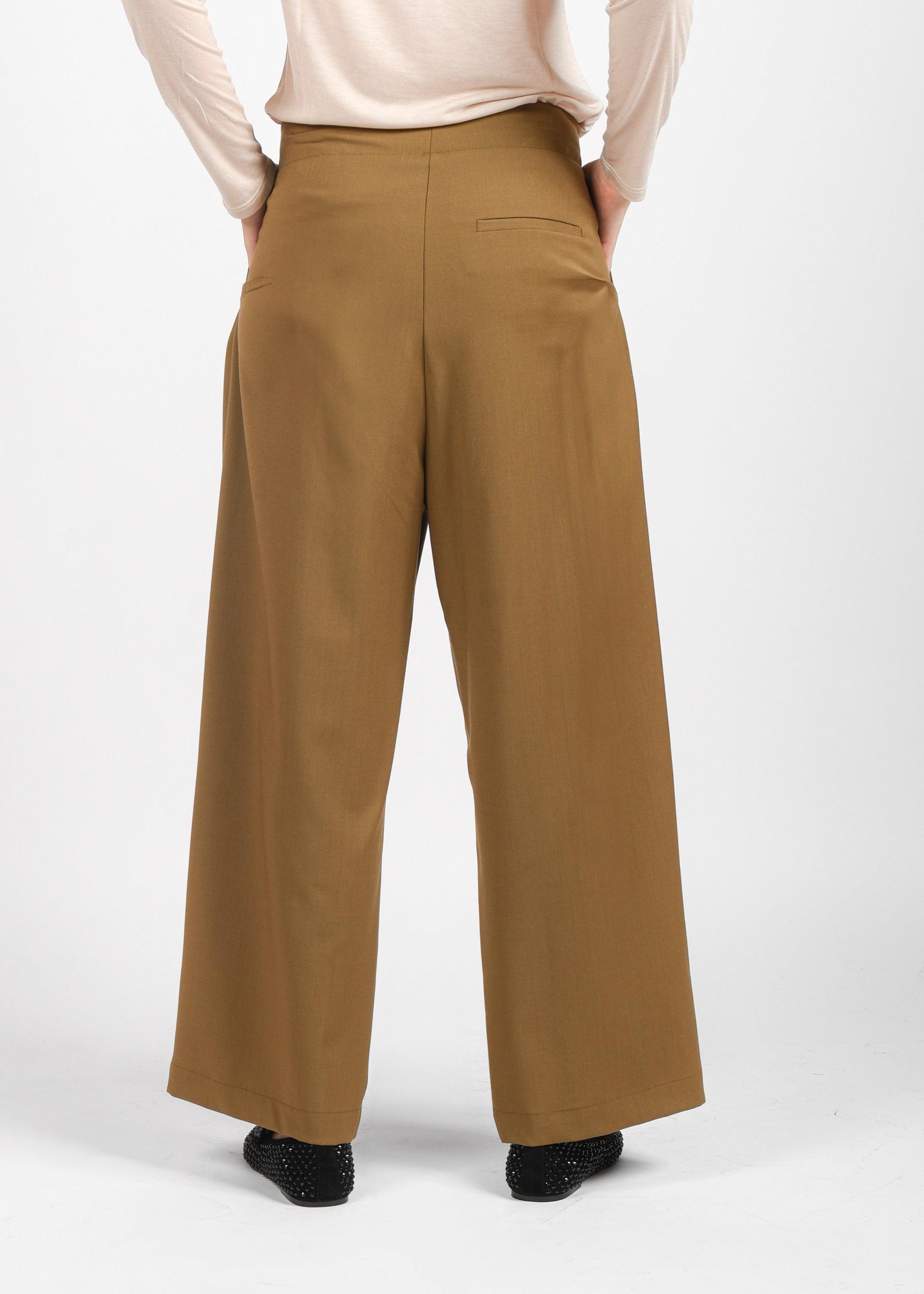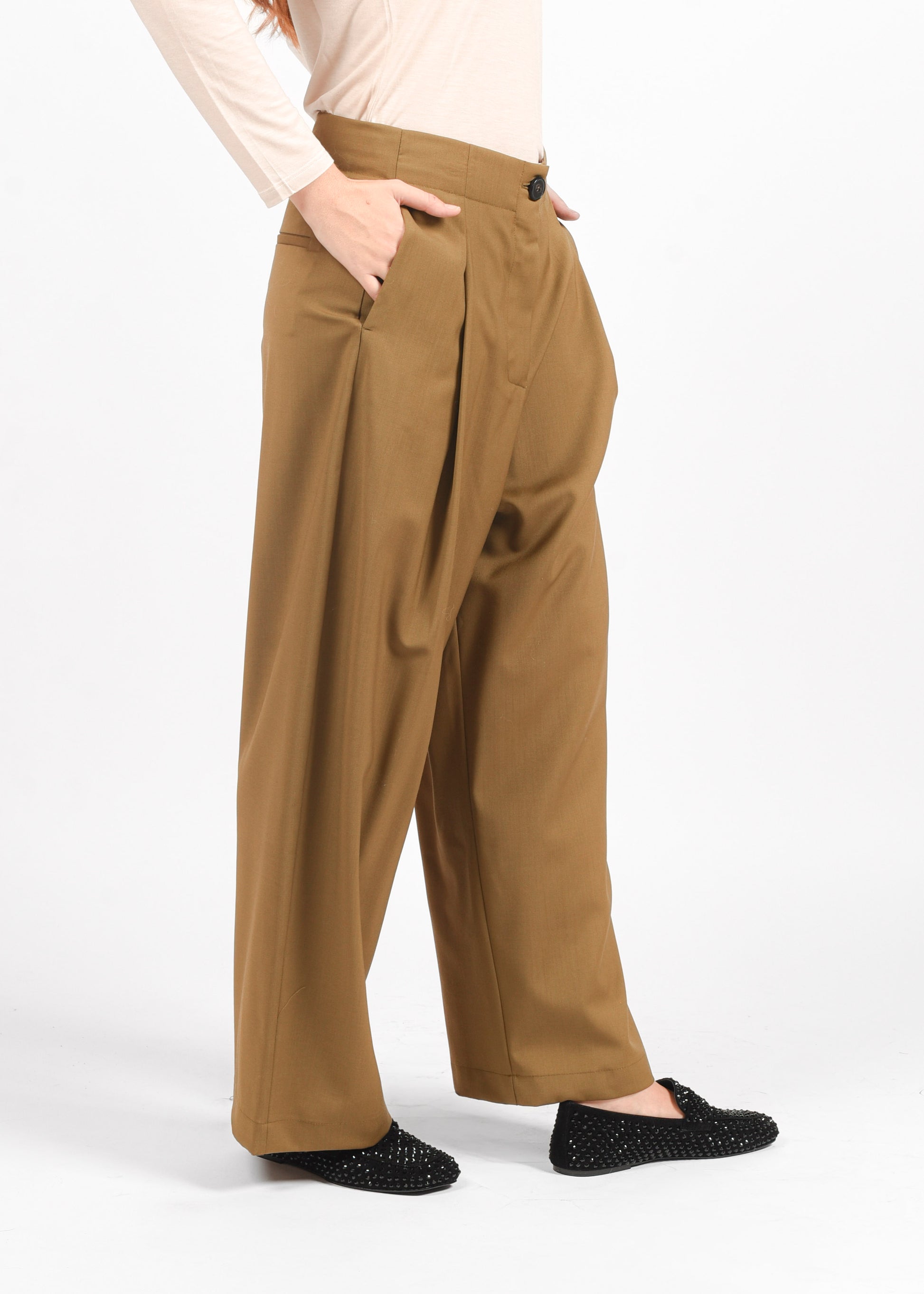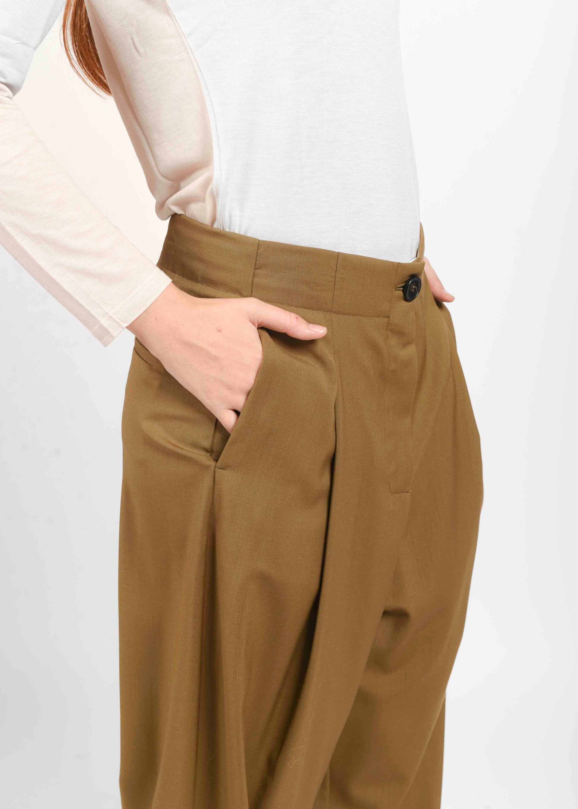 Pantalone a vita alta con pince frontali e tasca posteriore. La vestibilità varia in base alla taglia indossata.