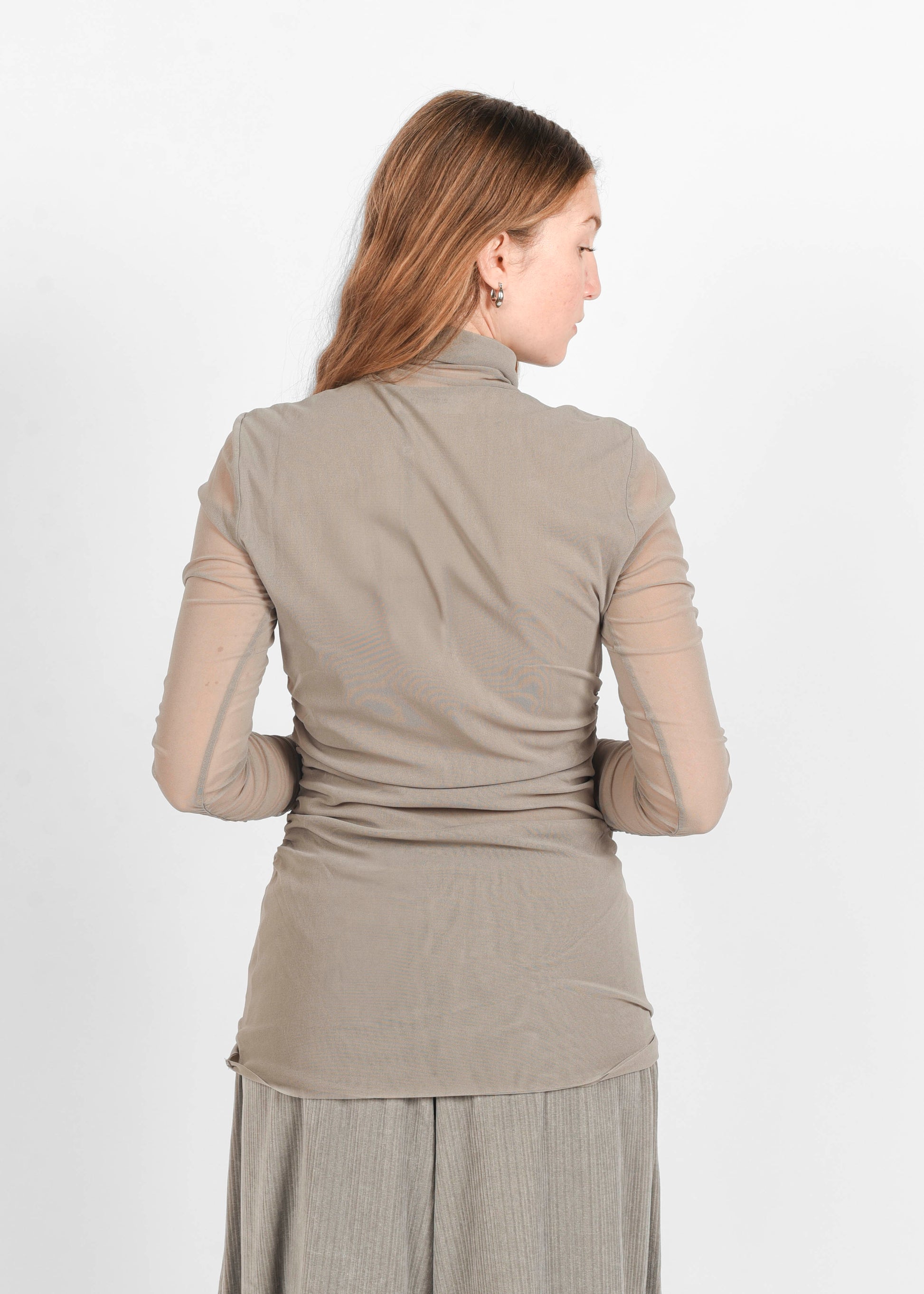 Maglia semitrasparente con collo alto e arricciature sui fianchi.
