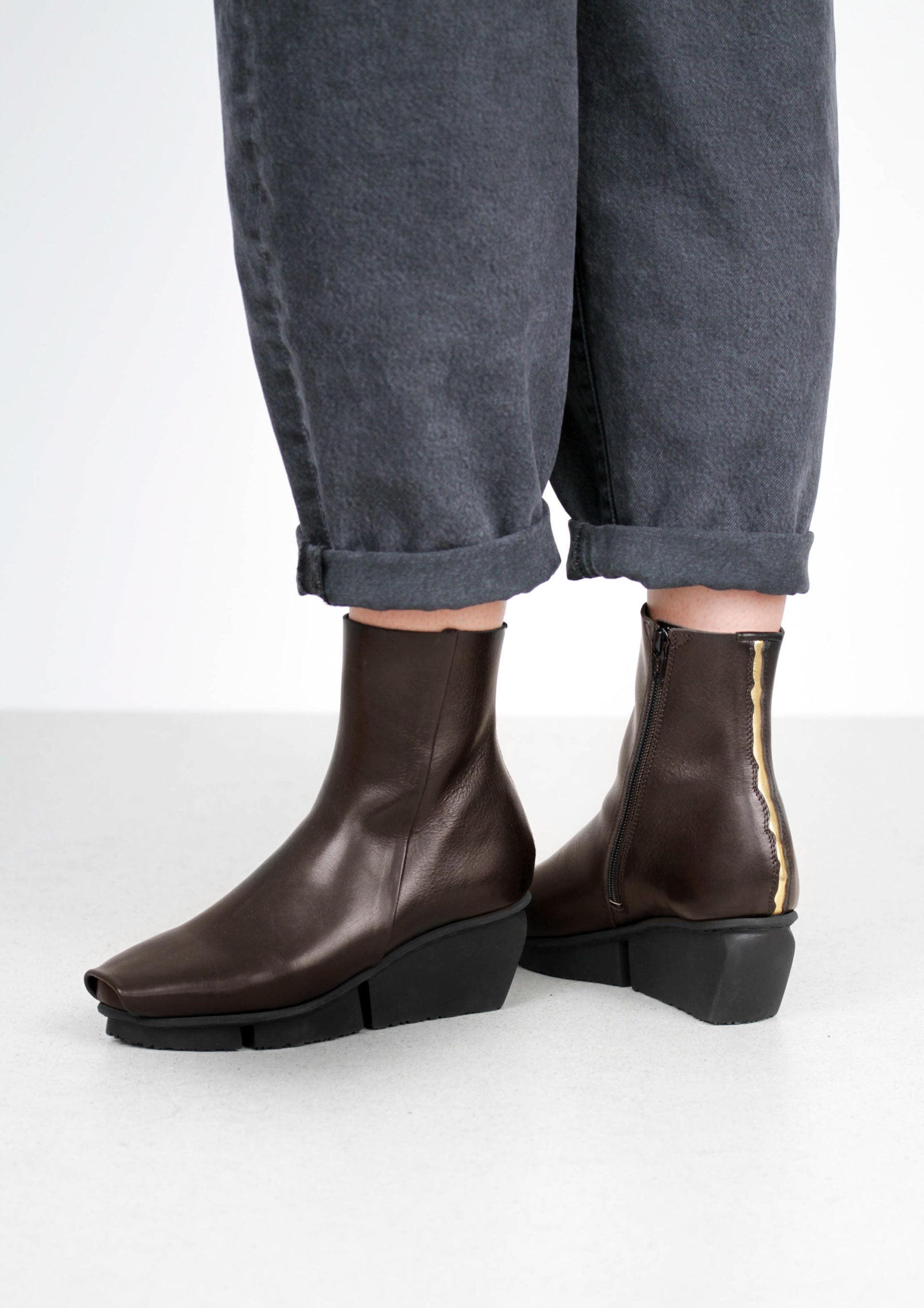 Stivaletti Trippen in pelle naturale, caratterizzati da una linea essenziale e contemporanea. Il modello presenta una cerniera interna che assicura una calzata pratica e veloce, mentre la suola in gomma con tacco e pianta separati dona stabilità e un design architettonico distintivo, tipico della maison. Realizzati in pelle di alta qualità, con finiture curate e comfort duraturo, sono la scelta ideale per chi cerca uno stile urbano con personalità.