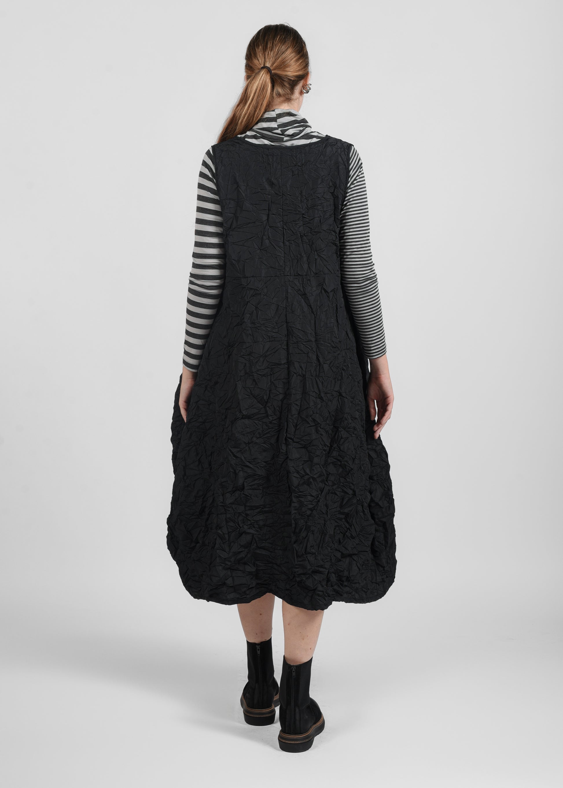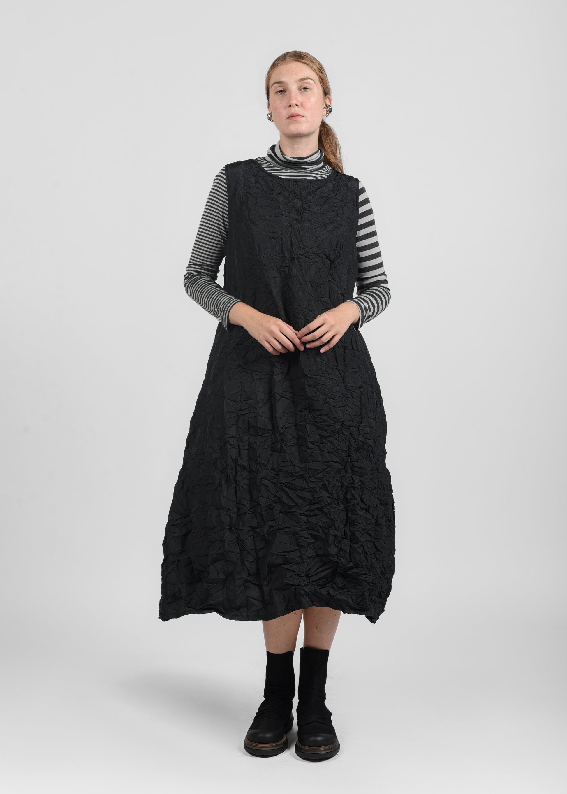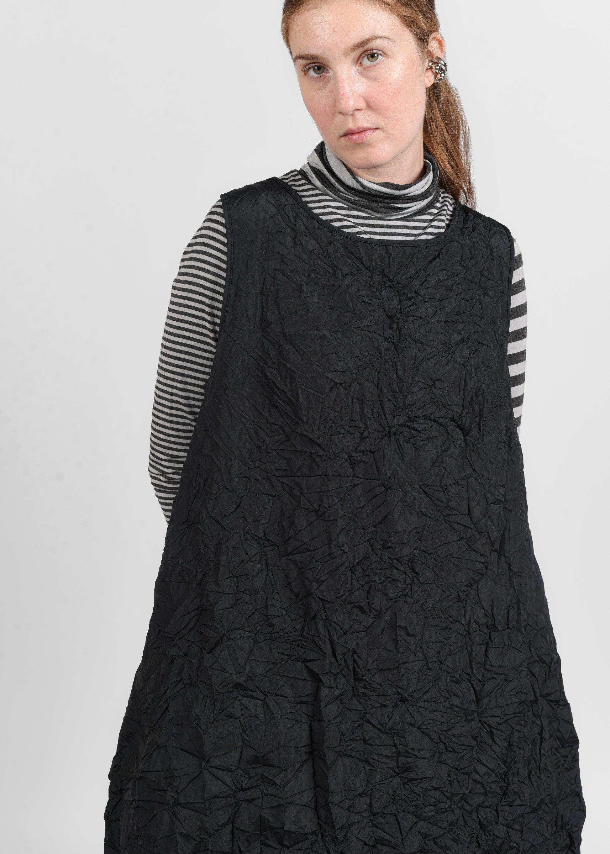 Il design smanicato e il girocollo essenziale esaltano la semplicità raffinata del modello, mentre il tessuto stropicciato regala movimento naturale e un tocco distintivo.