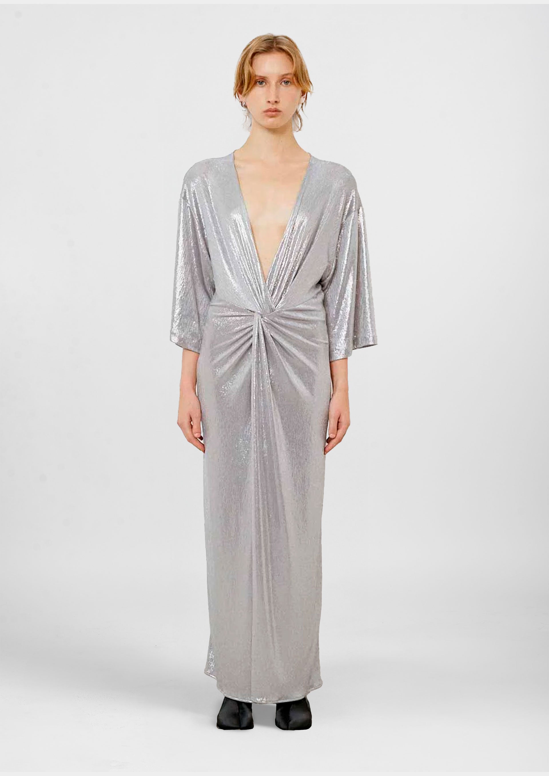 Vestito lungo in tessuto color argento spalmato, con maniche kimono e scollo a V. Caratterizzato da un nodo sul davanti e parte inferiore a portafoglio, presenta un fit scivolato che valorizza la figura con eleganza. Realizzato in 95% poliestere e 5% elastan, offre comfort ed elasticità.